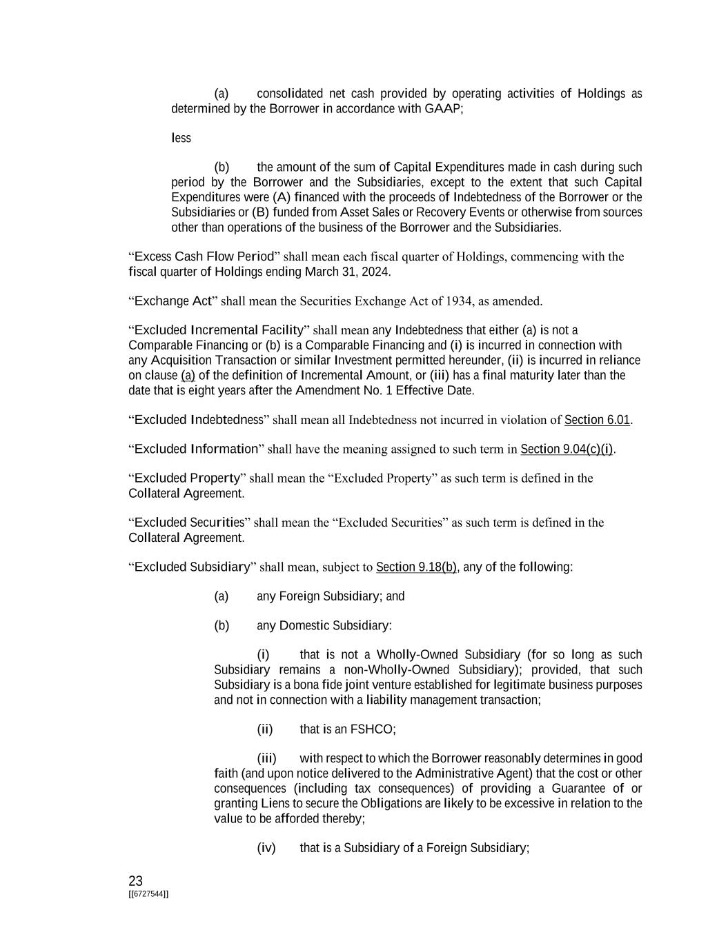 23 [[6727544]] (a) consolidated net cash provided by operating activities of Holdings as determined by the Borrower in accordance with GAAP; less (b) the amount of the sum of Capital Expenditures made in cash during such period by the Borrower and the Subsidiaries, except to the extent that such Capital Expenditures were (A) financed with the proceeds of Indebtedness of the Borrower or the Subsidiaries or (B) funded from Asset Sales or Recovery Events or otherwise from sources other than operations of the business of the Borrower and the Subsidiaries. “Excess Cash Flow Period” shall mean each fiscal quarter of Holdings, commencing with the fiscal quarter of Holdings ending March 31, 2024. “Exchange Act” shall mean the Securities Exchange Act of 1934, as amended. “Excluded Incremental Facility” shall mean any Indebtedness that either (a) is not a Comparable Financing or (b) is a Comparable Financing and (i) is incurred in connection with any Acquisition Transaction or similar Investment permitted hereunder, (ii) is incurred in reliance on clause (a) of the definition of Incremental Amount, or (iii) has a final maturity later than the date that is eight years after the Amendment No. 1 Effective Date. “Excluded Indebtedness” shall mean all Indebtedness not incurred in violation of Section 6.01. “Excluded Information” shall have the meaning assigned to such term in Section 9.04(c)(i). “Excluded Property” shall mean the “Excluded Property” as such term is defined in the Collateral Agreement. “Excluded Securities” shall mean the “Excluded Securities” as such term is defined in the Collateral Agreement. “Excluded Subsidiary” shall mean, subject to Section 9.18(b), any of the following: (a) any Foreign Subsidiary; and (b) any Domestic Subsidiary: (i) that is not a Wholly-Owned Subsidiary (for so long as such Subsidiary remains a non-Wholly-Owned Subsidiary); provided, that such Subsidiary is a bona fide joint venture established for legitimate business purposes and not in connection with a liability management transaction; (ii) that is an FSHCO; (iii) with respect to which the Borrower reasonably determines in good faith (and upon notice delivered to the Administrative Agent) that the cost or other consequences (including tax consequences) of providing a Guarantee of or granting Liens to secure the Obligations are likely to be excessive in relation to the value to be afforded thereby; (iv) that is a Subsidiary of a Foreign Subsidiary;