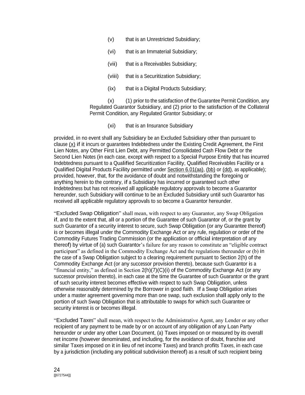 24 [[6727544]] (v) that is an Unrestricted Subsidiary; (vi) that is an Immaterial Subsidiary; (vii) that is a Receivables Subsidiary; (viii) that is a Securitization Subsidiary; (ix) that is a Digital Products Subsidiary; (x) (1) prior to the satisfaction of the Guarantee Permit Condition, any Regulated Guarantor Subsidiary, and (2) prior to the satisfaction of the Collateral Permit Condition, any Regulated Grantor Subsidiary; or (xi) that is an Insurance Subsidiary provided, in no event shall any Subsidiary be an Excluded Subsidiary other than pursuant to clause (x) if it incurs or guarantees Indebtedness under the Existing Credit Agreement, the First Lien Notes, any Other First Lien Debt, any Permitted Consolidated Cash Flow Debt or the Second Lien Notes (in each case, except with respect to a Special Purpose Entity that has incurred Indebtedness pursuant to a Qualified Securitization Facility, Qualified Receivables Facility or a Qualified Digital Products Facility permitted under Section 6.01(aa), (bb) or (dd), as applicable); provided, however, that, for the avoidance of doubt and notwithstanding the foregoing or anything herein to the contrary, if a Subsidiary has incurred or guaranteed such other Indebtedness but has not received all applicable regulatory approvals to become a Guarantor hereunder, such Subsidiary will continue to be an Excluded Subsidiary until such Guarantor has received all applicable regulatory approvals to so become a Guarantor hereunder. “Excluded Swap Obligation” shall mean, with respect to any Guarantor, any Swap Obligation if, and to the extent that, all or a portion of the Guarantee of such Guarantor of, or the grant by such Guarantor of a security interest to secure, such Swap Obligation (or any Guarantee thereof) is or becomes illegal under the Commodity Exchange Act or any rule, regulation or order of the Commodity Futures Trading Commission (or the application or official interpretation of any thereof) by virtue of (a) such Guarantor’s failure for any reason to constitute an “eligible contract participant” as defined in the Commodity Exchange Act and the regulations thereunder or (b) in the case of a Swap Obligation subject to a clearing requirement pursuant to Section 2(h) of the Commodity Exchange Act (or any successor provision thereto), because such Guarantor is a “financial entity,” as defined in Section 2(h)(7)(C)(i) of the Commodity Exchange Act (or any successor provision thereto), in each case at the time the Guarantee of such Guarantor or the grant of such security interest becomes effective with respect to such Swap Obligation, unless otherwise reasonably determined by the Borrower in good faith. If a Swap Obligation arises under a master agreement governing more than one swap, such exclusion shall apply only to the portion of such Swap Obligation that is attributable to swaps for which such Guarantee or security interest is or becomes illegal. “Excluded Taxes” shall mean, with respect to the Administrative Agent, any Lender or any other recipient of any payment to be made by or on account of any obligation of any Loan Party hereunder or under any other Loan Document, (a) Taxes imposed on or measured by its overall net income (however denominated, and including, for the avoidance of doubt, franchise and similar Taxes imposed on it in lieu of net income Taxes) and branch profits Taxes, in each case by a jurisdiction (including any political subdivision thereof) as a result of such recipient being