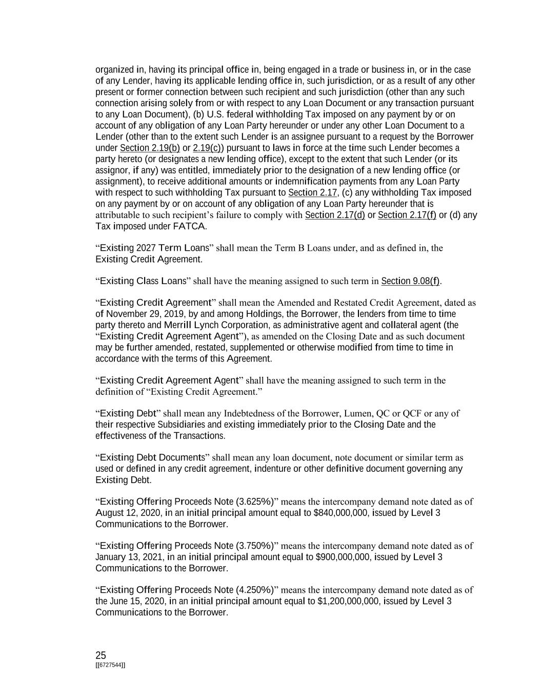 25 [[6727544]] organized in, having its principal office in, being engaged in a trade or business in, or in the case of any Lender, having its applicable lending office in, such jurisdiction, or as a result of any other present or former connection between such recipient and such jurisdiction (other than any such connection arising solely from or with respect to any Loan Document or any transaction pursuant to any Loan Document), (b) U.S. federal withholding Tax imposed on any payment by or on account of any obligation of any Loan Party hereunder or under any other Loan Document to a Lender (other than to the extent such Lender is an assignee pursuant to a request by the Borrower under Section 2.19(b) or 2.19(c)) pursuant to laws in force at the time such Lender becomes a party hereto (or designates a new lending office), except to the extent that such Lender (or its assignor, if any) was entitled, immediately prior to the designation of a new lending office (or assignment), to receive additional amounts or indemnification payments from any Loan Party with respect to such withholding Tax pursuant to Section 2.17, (c) any withholding Tax imposed on any payment by or on account of any obligation of any Loan Party hereunder that is attributable to such recipient’s failure to comply with Section 2.17(d) or Section 2.17(f) or (d) any Tax imposed under FATCA. “Existing 2027 Term Loans” shall mean the Term B Loans under, and as defined in, the Existing Credit Agreement. “Existing Class Loans” shall have the meaning assigned to such term in Section 9.08(f). “Existing Credit Agreement” shall mean the Amended and Restated Credit Agreement, dated as of November 29, 2019, by and among Holdings, the Borrower, the lenders from time to time party thereto and Merrill Lynch Corporation, as administrative agent and collateral agent (the “Existing Credit Agreement Agent”), as amended on the Closing Date and as such document may be further amended, restated, supplemented or otherwise modified from time to time in accordance with the terms of this Agreement. “Existing Credit Agreement Agent” shall have the meaning assigned to such term in the definition of “Existing Credit Agreement.” “Existing Debt” shall mean any Indebtedness of the Borrower, Lumen, QC or QCF or any of their respective Subsidiaries and existing immediately prior to the Closing Date and the effectiveness of the Transactions. “Existing Debt Documents” shall mean any loan document, note document or similar term as used or defined in any credit agreement, indenture or other definitive document governing any Existing Debt. “Existing Offering Proceeds Note (3.625%)” means the intercompany demand note dated as of August 12, 2020, in an initial principal amount equal to $840,000,000, issued by Level 3 Communications to the Borrower. “Existing Offering Proceeds Note (3.750%)” means the intercompany demand note dated as of January 13, 2021, in an initial principal amount equal to $900,000,000, issued by Level 3 Communications to the Borrower. “Existing Offering Proceeds Note (4.250%)” means the intercompany demand note dated as of the June 15, 2020, in an initial principal amount equal to $1,200,000,000, issued by Level 3 Communications to the Borrower.