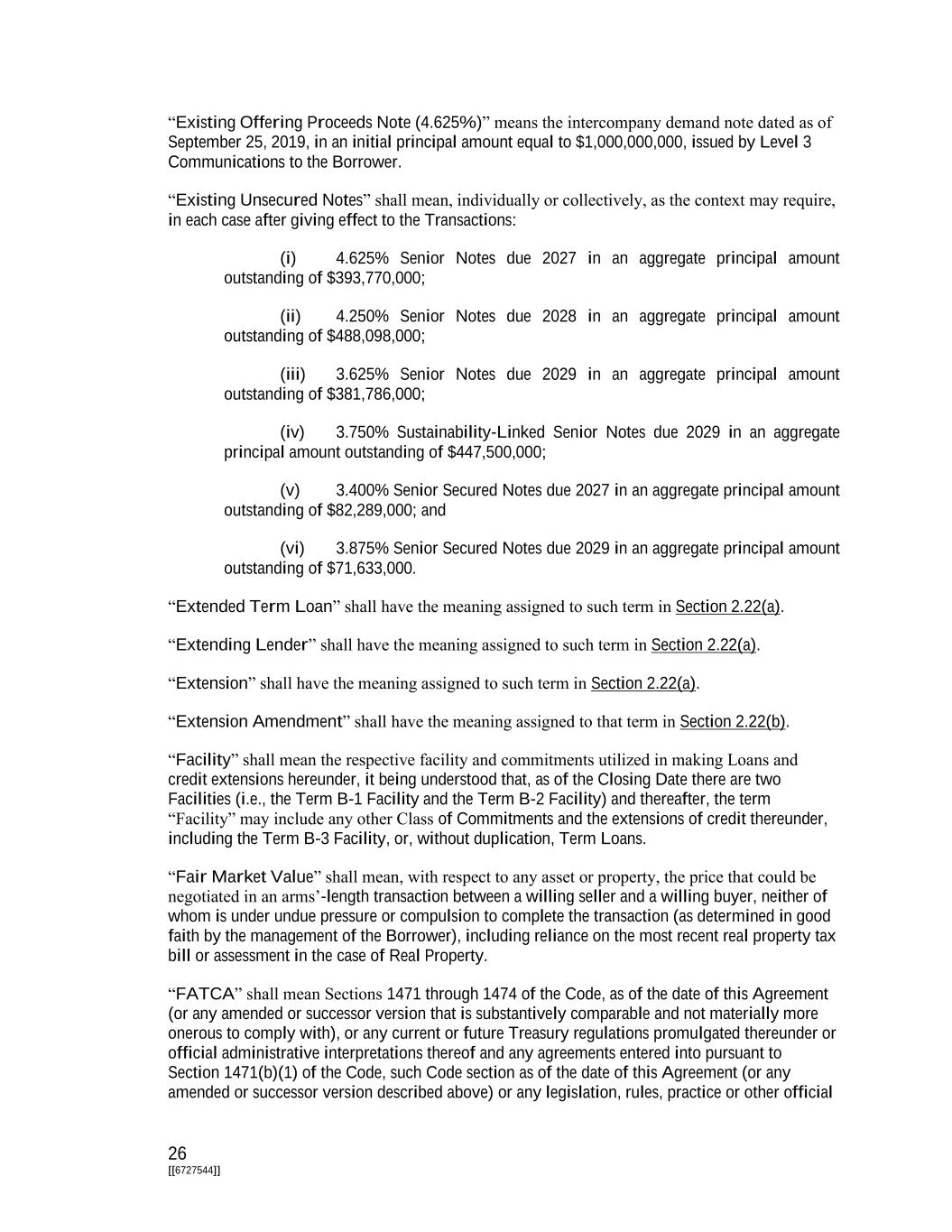 26 [[6727544]] “Existing Offering Proceeds Note (4.625%)” means the intercompany demand note dated as of September 25, 2019, in an initial principal amount equal to $1,000,000,000, issued by Level 3 Communications to the Borrower. “Existing Unsecured Notes” shall mean, individually or collectively, as the context may require, in each case after giving effect to the Transactions: (i) 4.625% Senior Notes due 2027 in an aggregate principal amount outstanding of $393,770,000; (ii) 4.250% Senior Notes due 2028 in an aggregate principal amount outstanding of $488,098,000; (iii) 3.625% Senior Notes due 2029 in an aggregate principal amount outstanding of $381,786,000; (iv) 3.750% Sustainability-Linked Senior Notes due 2029 in an aggregate principal amount outstanding of $447,500,000; (v) 3.400% Senior Secured Notes due 2027 in an aggregate principal amount outstanding of $82,289,000; and (vi) 3.875% Senior Secured Notes due 2029 in an aggregate principal amount outstanding of $71,633,000. “Extended Term Loan” shall have the meaning assigned to such term in Section 2.22(a). “Extending Lender” shall have the meaning assigned to such term in Section 2.22(a). “Extension” shall have the meaning assigned to such term in Section 2.22(a). “Extension Amendment” shall have the meaning assigned to that term in Section 2.22(b). “Facility” shall mean the respective facility and commitments utilized in making Loans and credit extensions hereunder, it being understood that, as of the Closing Date there are two Facilities (i.e., the Term B-1 Facility and the Term B-2 Facility) and thereafter, the term “Facility” may include any other Class of Commitments and the extensions of credit thereunder, including the Term B-3 Facility, or, without duplication, Term Loans. “Fair Market Value” shall mean, with respect to any asset or property, the price that could be negotiated in an arms’-length transaction between a willing seller and a willing buyer, neither of whom is under undue pressure or compulsion to complete the transaction (as determined in good faith by the management of the Borrower), including reliance on the most recent real property tax bill or assessment in the case of Real Property. “FATCA” shall mean Sections 1471 through 1474 of the Code, as of the date of this Agreement (or any amended or successor version that is substantively comparable and not materially more onerous to comply with), or any current or future Treasury regulations promulgated thereunder or official administrative interpretations thereof and any agreements entered into pursuant to Section 1471(b)(1) of the Code, such Code section as of the date of this Agreement (or any amended or successor version described above) or any legislation, rules, practice or other official