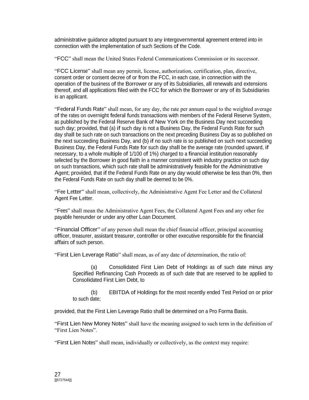 27 [[6727544]] administrative guidance adopted pursuant to any intergovernmental agreement entered into in connection with the implementation of such Sections of the Code. “FCC” shall mean the United States Federal Communications Commission or its successor. “FCC License” shall mean any permit, license, authorization, certification, plan, directive, consent order or consent decree of or from the FCC, in each case, in connection with the operation of the business of the Borrower or any of its Subsidiaries, all renewals and extensions thereof, and all applications filed with the FCC for which the Borrower or any of its Subsidiaries is an applicant. “Federal Funds Rate” shall mean, for any day, the rate per annum equal to the weighted average of the rates on overnight federal funds transactions with members of the Federal Reserve System, as published by the Federal Reserve Bank of New York on the Business Day next succeeding such day; provided, that (a) if such day is not a Business Day, the Federal Funds Rate for such day shall be such rate on such transactions on the next preceding Business Day as so published on the next succeeding Business Day, and (b) if no such rate is so published on such next succeeding Business Day, the Federal Funds Rate for such day shall be the average rate (rounded upward, if necessary, to a whole multiple of 1/100 of 1%) charged to a financial institution reasonably selected by the Borrower in good faith in a manner consistent with industry practice on such day on such transactions, which such rate shall be administratively feasible for the Administrative Agent; provided, that if the Federal Funds Rate on any day would otherwise be less than 0%, then the Federal Funds Rate on such day shall be deemed to be 0%. “Fee Letter” shall mean, collectively, the Administrative Agent Fee Letter and the Collateral Agent Fee Letter. “Fees” shall mean the Administrative Agent Fees, the Collateral Agent Fees and any other fee payable hereunder or under any other Loan Document. “Financial Officer” of any person shall mean the chief financial officer, principal accounting officer, treasurer, assistant treasurer, controller or other executive responsible for the financial affairs of such person. “First Lien Leverage Ratio” shall mean, as of any date of determination, the ratio of: (a) Consolidated First Lien Debt of Holdings as of such date minus any Specified Refinancing Cash Proceeds as of such date that are reserved to be applied to Consolidated First Lien Debt, to (b) EBITDA of Holdings for the most recently ended Test Period on or prior to such date; provided, that the First Lien Leverage Ratio shall be determined on a Pro Forma Basis. “First Lien New Money Notes” shall have the meaning assigned to such term in the definition of “First Lien Notes”. “First Lien Notes” shall mean, individually or collectively, as the context may require: