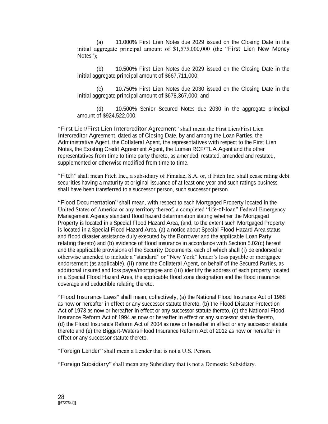 28 [[6727544]] (a) 11.000% First Lien Notes due 2029 issued on the Closing Date in the initial aggregate principal amount of $1,575,000,000 (the “First Lien New Money Notes”); (b) 10.500% First Lien Notes due 2029 issued on the Closing Date in the initial aggregate principal amount of $667,711,000; (c) 10.750% First Lien Notes due 2030 issued on the Closing Date in the initial aggregate principal amount of $678,367,000; and (d) 10.500% Senior Secured Notes due 2030 in the aggregate principal amount of $924,522,000. “First Lien/First Lien Intercreditor Agreement” shall mean the First Lien/First Lien Intercreditor Agreement, dated as of Closing Date, by and among the Loan Parties, the Administrative Agent, the Collateral Agent, the representatives with respect to the First Lien Notes, the Existing Credit Agreement Agent, the Lumen RCF/TLA Agent and the other representatives from time to time party thereto, as amended, restated, amended and restated, supplemented or otherwise modified from time to time. “Fitch” shall mean Fitch Inc., a subsidiary of Fimalac, S.A. or, if Fitch Inc. shall cease rating debt securities having a maturity at original issuance of at least one year and such ratings business shall have been transferred to a successor person, such successor person. “Flood Documentation” shall mean, with respect to each Mortgaged Property located in the United States of America or any territory thereof, a completed “life-of-loan” Federal Emergency Management Agency standard flood hazard determination stating whether the Mortgaged Property is located in a Special Flood Hazard Area, (and, to the extent such Mortgaged Property is located in a Special Flood Hazard Area, (a) a notice about Special Flood Hazard Area status and flood disaster assistance duly executed by the Borrower and the applicable Loan Party relating thereto) and (b) evidence of flood insurance in accordance with Section 5.02(c) hereof and the applicable provisions of the Security Documents, each of which shall (i) be endorsed or otherwise amended to include a “standard” or “New York” lender’s loss payable or mortgagee endorsement (as applicable), (ii) name the Collateral Agent, on behalf of the Secured Parties, as additional insured and loss payee/mortgagee and (iii) identify the address of each property located in a Special Flood Hazard Area, the applicable flood zone designation and the flood insurance coverage and deductible relating thereto. “Flood Insurance Laws” shall mean, collectively, (a) the National Flood Insurance Act of 1968 as now or hereafter in effect or any successor statute thereto, (b) the Flood Disaster Protection Act of 1973 as now or hereafter in effect or any successor statute thereto, (c) the National Flood Insurance Reform Act of 1994 as now or hereafter in effect or any successor statute thereto, (d) the Flood Insurance Reform Act of 2004 as now or hereafter in effect or any successor statute thereto and (e) the Biggert-Waters Flood Insurance Reform Act of 2012 as now or hereafter in effect or any successor statute thereto. “Foreign Lender” shall mean a Lender that is not a U.S. Person. “Foreign Subsidiary” shall mean any Subsidiary that is not a Domestic Subsidiary.