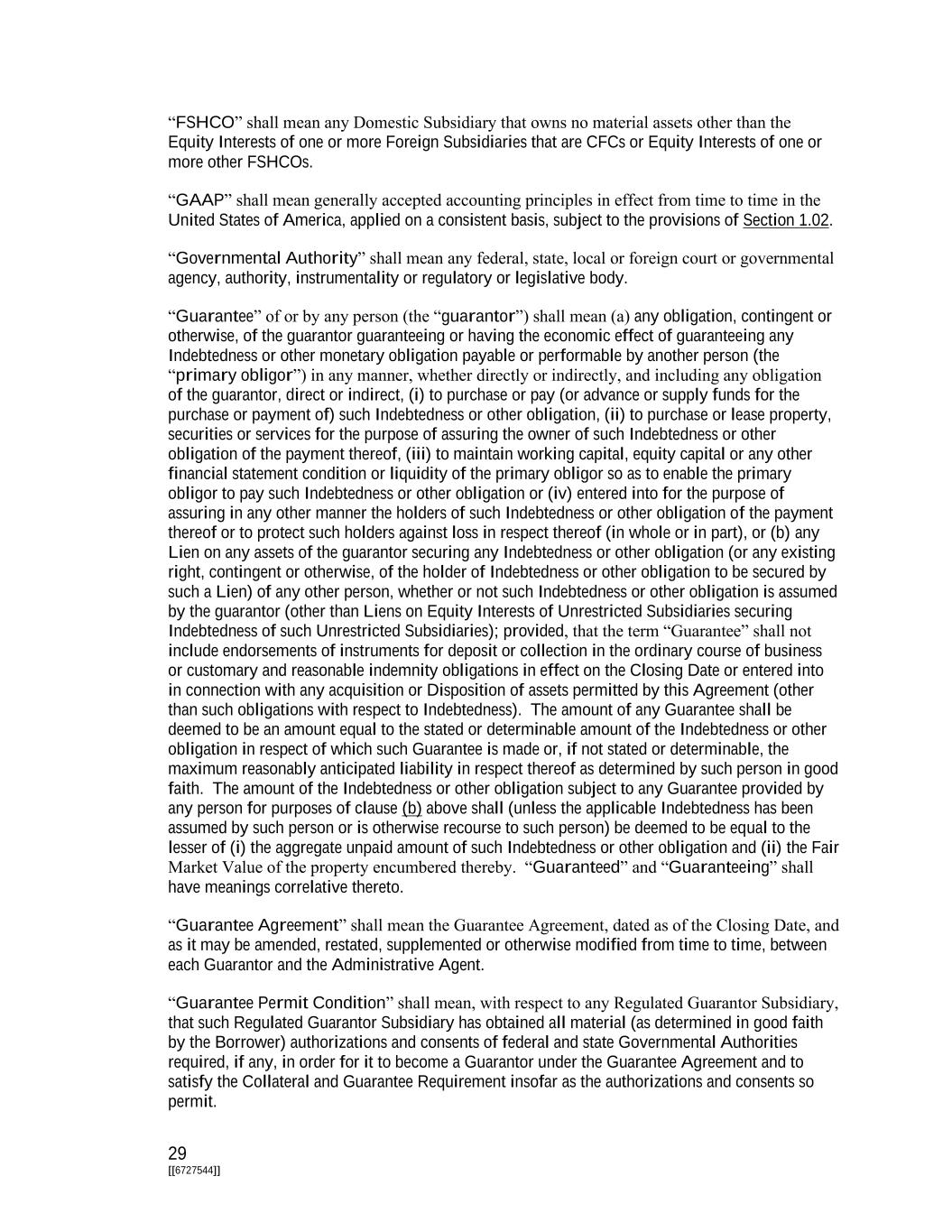 29 [[6727544]] “FSHCO” shall mean any Domestic Subsidiary that owns no material assets other than the Equity Interests of one or more Foreign Subsidiaries that are CFCs or Equity Interests of one or more other FSHCOs. “GAAP” shall mean generally accepted accounting principles in effect from time to time in the United States of America, applied on a consistent basis, subject to the provisions of Section 1.02. “Governmental Authority” shall mean any federal, state, local or foreign court or governmental agency, authority, instrumentality or regulatory or legislative body. “Guarantee” of or by any person (the “guarantor”) shall mean (a) any obligation, contingent or otherwise, of the guarantor guaranteeing or having the economic effect of guaranteeing any Indebtedness or other monetary obligation payable or performable by another person (the “primary obligor”) in any manner, whether directly or indirectly, and including any obligation of the guarantor, direct or indirect, (i) to purchase or pay (or advance or supply funds for the purchase or payment of) such Indebtedness or other obligation, (ii) to purchase or lease property, securities or services for the purpose of assuring the owner of such Indebtedness or other obligation of the payment thereof, (iii) to maintain working capital, equity capital or any other financial statement condition or liquidity of the primary obligor so as to enable the primary obligor to pay such Indebtedness or other obligation or (iv) entered into for the purpose of assuring in any other manner the holders of such Indebtedness or other obligation of the payment thereof or to protect such holders against loss in respect thereof (in whole or in part), or (b) any Lien on any assets of the guarantor securing any Indebtedness or other obligation (or any existing right, contingent or otherwise, of the holder of Indebtedness or other obligation to be secured by such a Lien) of any other person, whether or not such Indebtedness or other obligation is assumed by the guarantor (other than Liens on Equity Interests of Unrestricted Subsidiaries securing Indebtedness of such Unrestricted Subsidiaries); provided, that the term “Guarantee” shall not include endorsements of instruments for deposit or collection in the ordinary course of business or customary and reasonable indemnity obligations in effect on the Closing Date or entered into in connection with any acquisition or Disposition of assets permitted by this Agreement (other than such obligations with respect to Indebtedness). The amount of any Guarantee shall be deemed to be an amount equal to the stated or determinable amount of the Indebtedness or other obligation in respect of which such Guarantee is made or, if not stated or determinable, the maximum reasonably anticipated liability in respect thereof as determined by such person in good faith. The amount of the Indebtedness or other obligation subject to any Guarantee provided by any person for purposes of clause (b) above shall (unless the applicable Indebtedness has been assumed by such person or is otherwise recourse to such person) be deemed to be equal to the lesser of (i) the aggregate unpaid amount of such Indebtedness or other obligation and (ii) the Fair Market Value of the property encumbered thereby. “Guaranteed” and “Guaranteeing” shall have meanings correlative thereto. “Guarantee Agreement” shall mean the Guarantee Agreement, dated as of the Closing Date, and as it may be amended, restated, supplemented or otherwise modified from time to time, between each Guarantor and the Administrative Agent. “Guarantee Permit Condition” shall mean, with respect to any Regulated Guarantor Subsidiary, that such Regulated Guarantor Subsidiary has obtained all material (as determined in good faith by the Borrower) authorizations and consents of federal and state Governmental Authorities required, if any, in order for it to become a Guarantor under the Guarantee Agreement and to satisfy the Collateral and Guarantee Requirement insofar as the authorizations and consents so permit.