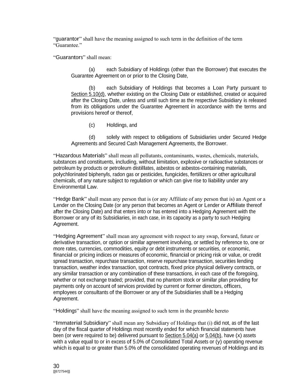 30 [[6727544]] “guarantor” shall have the meaning assigned to such term in the definition of the term “Guarantee.” “Guarantors” shall mean: (a) each Subsidiary of Holdings (other than the Borrower) that executes the Guarantee Agreement on or prior to the Closing Date, (b) each Subsidiary of Holdings that becomes a Loan Party pursuant to Section 5.10(d), whether existing on the Closing Date or established, created or acquired after the Closing Date, unless and until such time as the respective Subsidiary is released from its obligations under the Guarantee Agreement in accordance with the terms and provisions hereof or thereof, (c) Holdings, and (d) solely with respect to obligations of Subsidiaries under Secured Hedge Agreements and Secured Cash Management Agreements, the Borrower. “Hazardous Materials” shall mean all pollutants, contaminants, wastes, chemicals, materials, substances and constituents, including, without limitation, explosive or radioactive substances or petroleum by products or petroleum distillates, asbestos or asbestos-containing materials, polychlorinated biphenyls, radon gas or pesticides, fungicides, fertilizers or other agricultural chemicals, of any nature subject to regulation or which can give rise to liability under any Environmental Law. “Hedge Bank” shall mean any person that is (or any Affiliate of any person that is) an Agent or a Lender on the Closing Date (or any person that becomes an Agent or Lender or Affiliate thereof after the Closing Date) and that enters into or has entered into a Hedging Agreement with the Borrower or any of its Subsidiaries, in each case, in its capacity as a party to such Hedging Agreement. “Hedging Agreement” shall mean any agreement with respect to any swap, forward, future or derivative transaction, or option or similar agreement involving, or settled by reference to, one or more rates, currencies, commodities, equity or debt instruments or securities, or economic, financial or pricing indices or measures of economic, financial or pricing risk or value, or credit spread transaction, repurchase transaction, reserve repurchase transaction, securities lending transaction, weather index transaction, spot contracts, fixed price physical delivery contracts, or any similar transaction or any combination of these transactions, in each case of the foregoing, whether or not exchange traded; provided, that no phantom stock or similar plan providing for payments only on account of services provided by current or former directors, officers, employees or consultants of the Borrower or any of the Subsidiaries shall be a Hedging Agreement. “Holdings” shall have the meaning assigned to such term in the preamble hereto “Immaterial Subsidiary” shall mean any Subsidiary of Holdings that (i) did not, as of the last day of the fiscal quarter of Holdings most recently ended for which financial statements have been (or were required to be) delivered pursuant to Section 5.04(a) or 5.04(b), have (x) assets with a value equal to or in excess of 5.0% of Consolidated Total Assets or (y) operating revenue which is equal to or greater than 5.0% of the consolidated operating revenues of Holdings and its