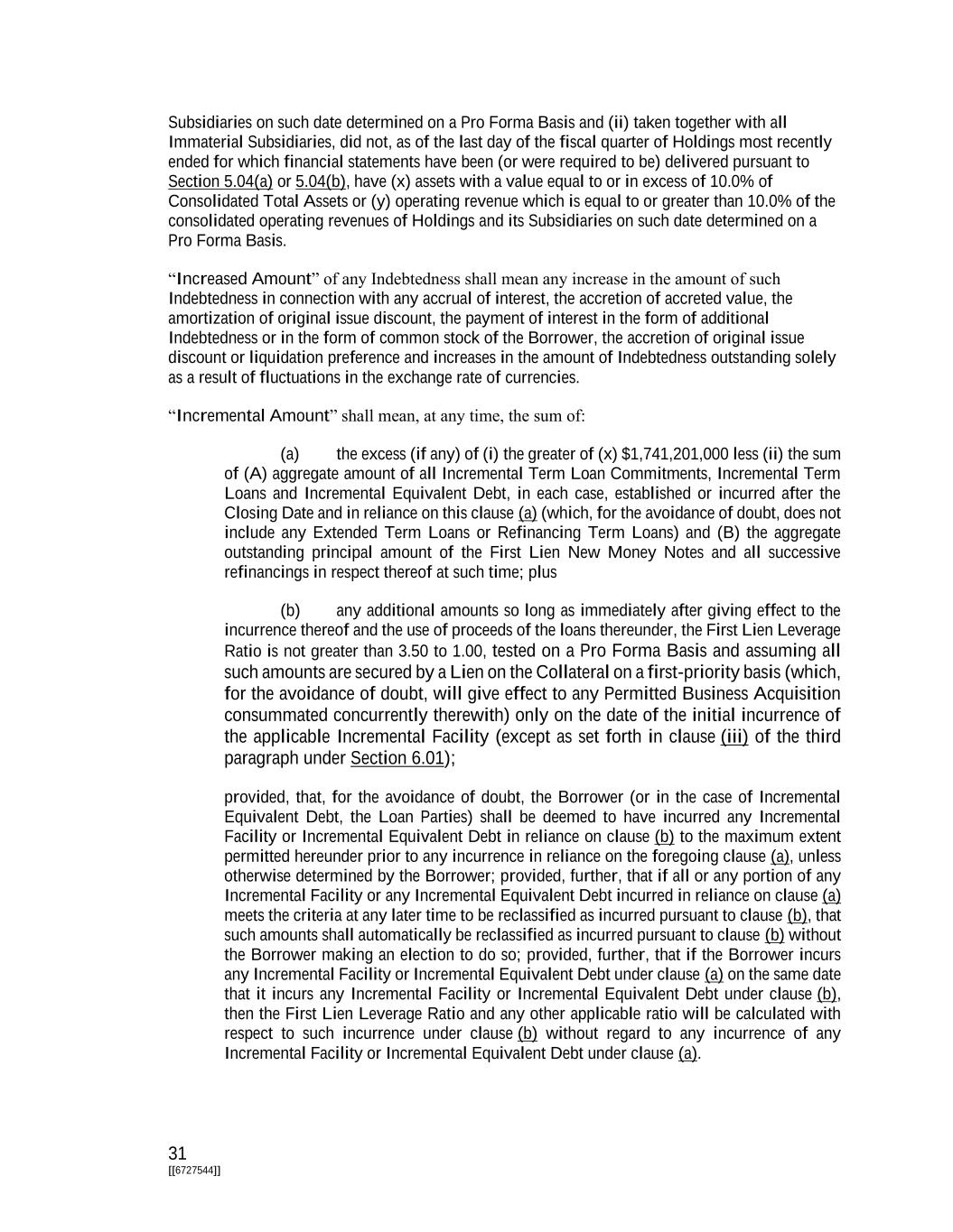 31 [[6727544]] Subsidiaries on such date determined on a Pro Forma Basis and (ii) taken together with all Immaterial Subsidiaries, did not, as of the last day of the fiscal quarter of Holdings most recently ended for which financial statements have been (or were required to be) delivered pursuant to Section 5.04(a) or 5.04(b), have (x) assets with a value equal to or in excess of 10.0% of Consolidated Total Assets or (y) operating revenue which is equal to or greater than 10.0% of the consolidated operating revenues of Holdings and its Subsidiaries on such date determined on a Pro Forma Basis. “Increased Amount” of any Indebtedness shall mean any increase in the amount of such Indebtedness in connection with any accrual of interest, the accretion of accreted value, the amortization of original issue discount, the payment of interest in the form of additional Indebtedness or in the form of common stock of the Borrower, the accretion of original issue discount or liquidation preference and increases in the amount of Indebtedness outstanding solely as a result of fluctuations in the exchange rate of currencies. “Incremental Amount” shall mean, at any time, the sum of: (a) the excess (if any) of (i) the greater of (x) $1,741,201,000 less (ii) the sum of (A) aggregate amount of all Incremental Term Loan Commitments, Incremental Term Loans and Incremental Equivalent Debt, in each case, established or incurred after the Closing Date and in reliance on this clause (a) (which, for the avoidance of doubt, does not include any Extended Term Loans or Refinancing Term Loans) and (B) the aggregate outstanding principal amount of the First Lien New Money Notes and all successive refinancings in respect thereof at such time; plus (b) any additional amounts so long as immediately after giving effect to the incurrence thereof and the use of proceeds of the loans thereunder, the First Lien Leverage Ratio is not greater than 3.50 to 1.00, tested on a Pro Forma Basis and assuming all such amounts are secured by a Lien on the Collateral on a first-priority basis (which, for the avoidance of doubt, will give effect to any Permitted Business Acquisition consummated concurrently therewith) only on the date of the initial incurrence of the applicable Incremental Facility (except as set forth in clause (iii) of the third paragraph under Section 6.01); provided, that, for the avoidance of doubt, the Borrower (or in the case of Incremental Equivalent Debt, the Loan Parties) shall be deemed to have incurred any Incremental Facility or Incremental Equivalent Debt in reliance on clause (b) to the maximum extent permitted hereunder prior to any incurrence in reliance on the foregoing clause (a), unless otherwise determined by the Borrower; provided, further, that if all or any portion of any Incremental Facility or any Incremental Equivalent Debt incurred in reliance on clause (a) meets the criteria at any later time to be reclassified as incurred pursuant to clause (b), that such amounts shall automatically be reclassified as incurred pursuant to clause (b) without the Borrower making an election to do so; provided, further, that if the Borrower incurs any Incremental Facility or Incremental Equivalent Debt under clause (a) on the same date that it incurs any Incremental Facility or Incremental Equivalent Debt under clause (b), then the First Lien Leverage Ratio and any other applicable ratio will be calculated with respect to such incurrence under clause (b) without regard to any incurrence of any Incremental Facility or Incremental Equivalent Debt under clause (a).