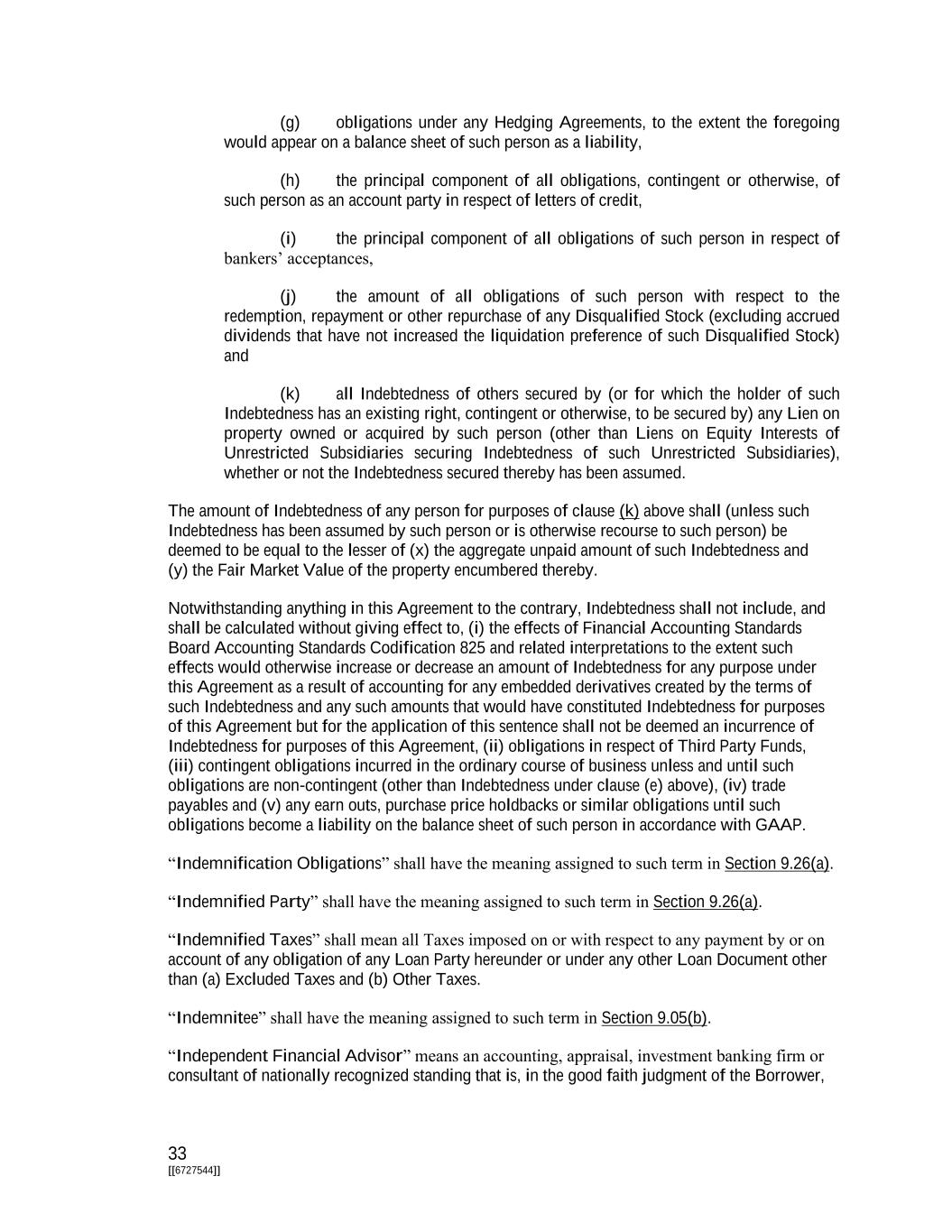 33 [[6727544]] (g) obligations under any Hedging Agreements, to the extent the foregoing would appear on a balance sheet of such person as a liability, (h) the principal component of all obligations, contingent or otherwise, of such person as an account party in respect of letters of credit, (i) the principal component of all obligations of such person in respect of bankers’ acceptances, (j) the amount of all obligations of such person with respect to the redemption, repayment or other repurchase of any Disqualified Stock (excluding accrued dividends that have not increased the liquidation preference of such Disqualified Stock) and (k) all Indebtedness of others secured by (or for which the holder of such Indebtedness has an existing right, contingent or otherwise, to be secured by) any Lien on property owned or acquired by such person (other than Liens on Equity Interests of Unrestricted Subsidiaries securing Indebtedness of such Unrestricted Subsidiaries), whether or not the Indebtedness secured thereby has been assumed. The amount of Indebtedness of any person for purposes of clause (k) above shall (unless such Indebtedness has been assumed by such person or is otherwise recourse to such person) be deemed to be equal to the lesser of (x) the aggregate unpaid amount of such Indebtedness and (y) the Fair Market Value of the property encumbered thereby. Notwithstanding anything in this Agreement to the contrary, Indebtedness shall not include, and shall be calculated without giving effect to, (i) the effects of Financial Accounting Standards Board Accounting Standards Codification 825 and related interpretations to the extent such effects would otherwise increase or decrease an amount of Indebtedness for any purpose under this Agreement as a result of accounting for any embedded derivatives created by the terms of such Indebtedness and any such amounts that would have constituted Indebtedness for purposes of this Agreement but for the application of this sentence shall not be deemed an incurrence of Indebtedness for purposes of this Agreement, (ii) obligations in respect of Third Party Funds, (iii) contingent obligations incurred in the ordinary course of business unless and until such obligations are non-contingent (other than Indebtedness under clause (e) above), (iv) trade payables and (v) any earn outs, purchase price holdbacks or similar obligations until such obligations become a liability on the balance sheet of such person in accordance with GAAP. “Indemnification Obligations” shall have the meaning assigned to such term in Section 9.26(a). “Indemnified Party” shall have the meaning assigned to such term in Section 9.26(a). “Indemnified Taxes” shall mean all Taxes imposed on or with respect to any payment by or on account of any obligation of any Loan Party hereunder or under any other Loan Document other than (a) Excluded Taxes and (b) Other Taxes. “Indemnitee” shall have the meaning assigned to such term in Section 9.05(b). “Independent Financial Advisor” means an accounting, appraisal, investment banking firm or consultant of nationally recognized standing that is, in the good faith judgment of the Borrower,