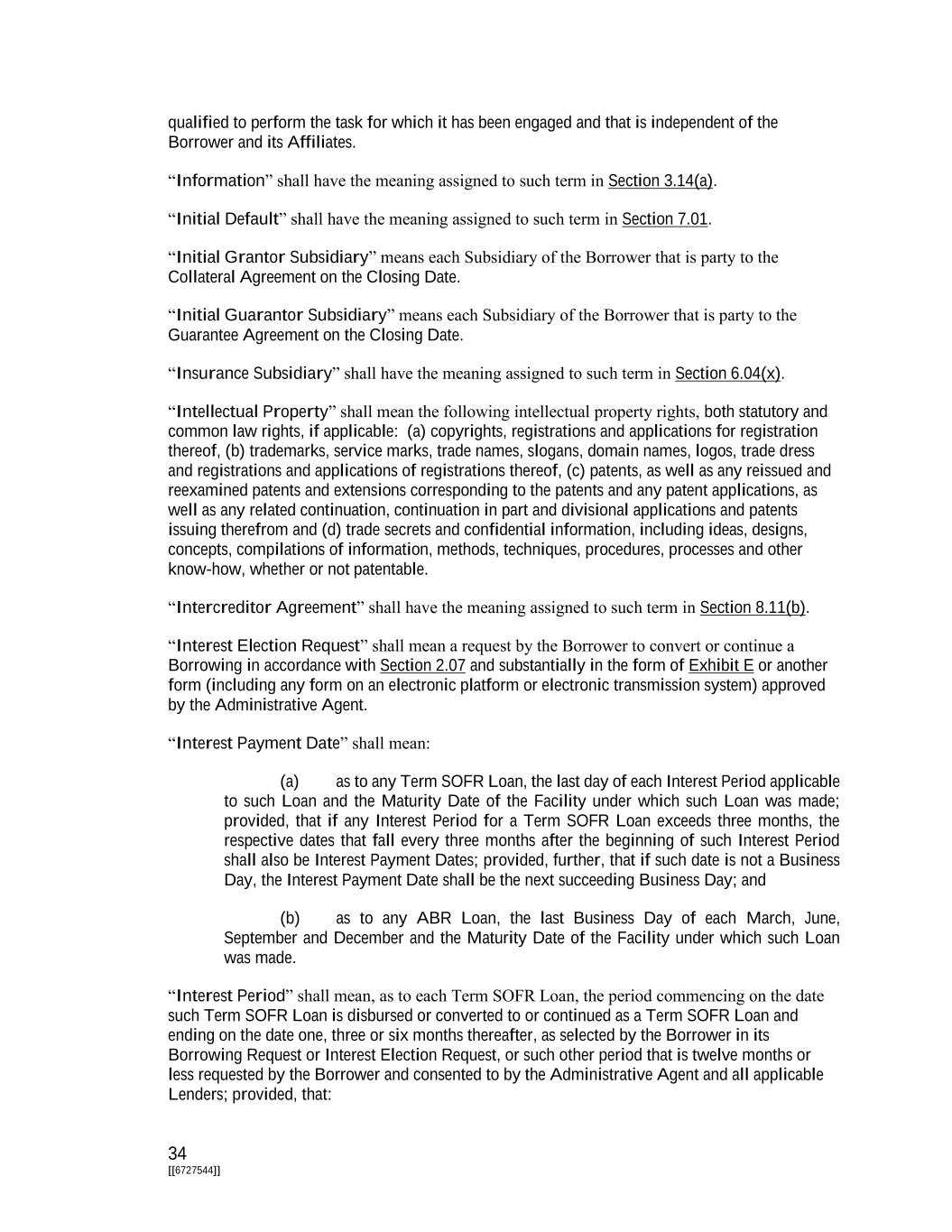 34 [[6727544]] qualified to perform the task for which it has been engaged and that is independent of the Borrower and its Affiliates. “Information” shall have the meaning assigned to such term in Section 3.14(a). “Initial Default” shall have the meaning assigned to such term in Section 7.01. “Initial Grantor Subsidiary” means each Subsidiary of the Borrower that is party to the Collateral Agreement on the Closing Date. “Initial Guarantor Subsidiary” means each Subsidiary of the Borrower that is party to the Guarantee Agreement on the Closing Date. “Insurance Subsidiary” shall have the meaning assigned to such term in Section 6.04(x). “Intellectual Property” shall mean the following intellectual property rights, both statutory and common law rights, if applicable: (a) copyrights, registrations and applications for registration thereof, (b) trademarks, service marks, trade names, slogans, domain names, logos, trade dress and registrations and applications of registrations thereof, (c) patents, as well as any reissued and reexamined patents and extensions corresponding to the patents and any patent applications, as well as any related continuation, continuation in part and divisional applications and patents issuing therefrom and (d) trade secrets and confidential information, including ideas, designs, concepts, compilations of information, methods, techniques, procedures, processes and other know-how, whether or not patentable. “Intercreditor Agreement” shall have the meaning assigned to such term in Section 8.11(b). “Interest Election Request” shall mean a request by the Borrower to convert or continue a Borrowing in accordance with Section 2.07 and substantially in the form of Exhibit E or another form (including any form on an electronic platform or electronic transmission system) approved by the Administrative Agent. “Interest Payment Date” shall mean: (a) as to any Term SOFR Loan, the last day of each Interest Period applicable to such Loan and the Maturity Date of the Facility under which such Loan was made; provided, that if any Interest Period for a Term SOFR Loan exceeds three months, the respective dates that fall every three months after the beginning of such Interest Period shall also be Interest Payment Dates; provided, further, that if such date is not a Business Day, the Interest Payment Date shall be the next succeeding Business Day; and (b) as to any ABR Loan, the last Business Day of each March, June, September and December and the Maturity Date of the Facility under which such Loan was made. “Interest Period” shall mean, as to each Term SOFR Loan, the period commencing on the date such Term SOFR Loan is disbursed or converted to or continued as a Term SOFR Loan and ending on the date one, three or six months thereafter, as selected by the Borrower in its Borrowing Request or Interest Election Request, or such other period that is twelve months or less requested by the Borrower and consented to by the Administrative Agent and all applicable Lenders; provided, that: