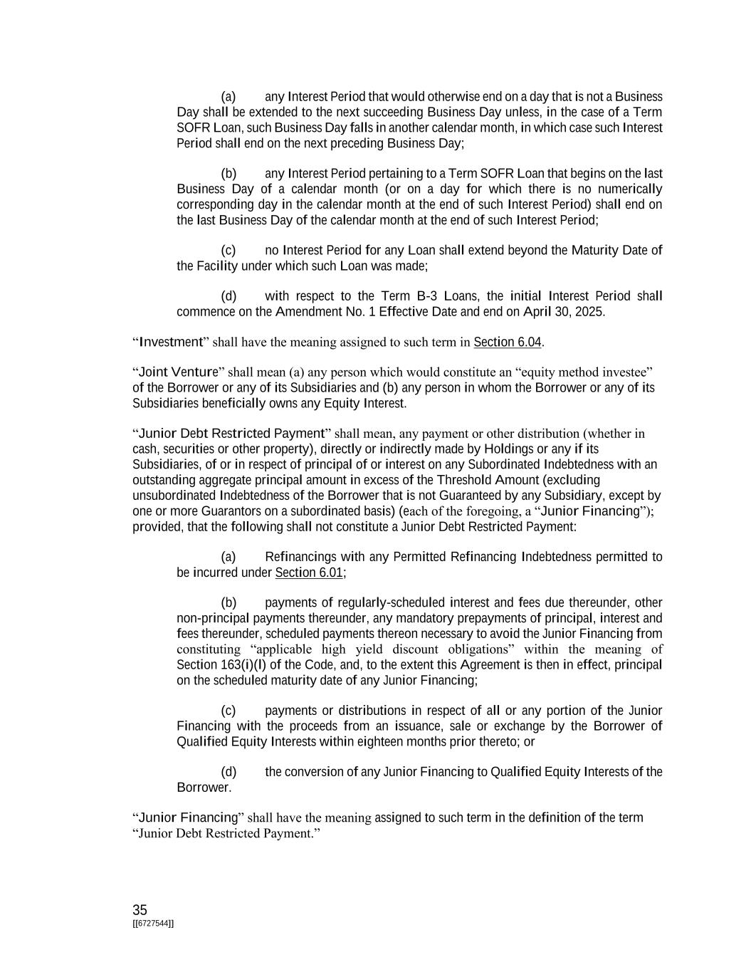 35 [[6727544]] (a) any Interest Period that would otherwise end on a day that is not a Business Day shall be extended to the next succeeding Business Day unless, in the case of a Term SOFR Loan, such Business Day falls in another calendar month, in which case such Interest Period shall end on the next preceding Business Day; (b) any Interest Period pertaining to a Term SOFR Loan that begins on the last Business Day of a calendar month (or on a day for which there is no numerically corresponding day in the calendar month at the end of such Interest Period) shall end on the last Business Day of the calendar month at the end of such Interest Period; (c) no Interest Period for any Loan shall extend beyond the Maturity Date of the Facility under which such Loan was made; (d) with respect to the Term B-3 Loans, the initial Interest Period shall commence on the Amendment No. 1 Effective Date and end on April 30, 2025. “Investment” shall have the meaning assigned to such term in Section 6.04. “Joint Venture” shall mean (a) any person which would constitute an “equity method investee” of the Borrower or any of its Subsidiaries and (b) any person in whom the Borrower or any of its Subsidiaries beneficially owns any Equity Interest. “Junior Debt Restricted Payment” shall mean, any payment or other distribution (whether in cash, securities or other property), directly or indirectly made by Holdings or any if its Subsidiaries, of or in respect of principal of or interest on any Subordinated Indebtedness with an outstanding aggregate principal amount in excess of the Threshold Amount (excluding unsubordinated Indebtedness of the Borrower that is not Guaranteed by any Subsidiary, except by one or more Guarantors on a subordinated basis) (each of the foregoing, a “Junior Financing”); provided, that the following shall not constitute a Junior Debt Restricted Payment: (a) Refinancings with any Permitted Refinancing Indebtedness permitted to be incurred under Section 6.01; (b) payments of regularly-scheduled interest and fees due thereunder, other non-principal payments thereunder, any mandatory prepayments of principal, interest and fees thereunder, scheduled payments thereon necessary to avoid the Junior Financing from constituting “applicable high yield discount obligations” within the meaning of Section 163(i)(l) of the Code, and, to the extent this Agreement is then in effect, principal on the scheduled maturity date of any Junior Financing; (c) payments or distributions in respect of all or any portion of the Junior Financing with the proceeds from an issuance, sale or exchange by the Borrower of Qualified Equity Interests within eighteen months prior thereto; or (d) the conversion of any Junior Financing to Qualified Equity Interests of the Borrower. “Junior Financing” shall have the meaning assigned to such term in the definition of the term “Junior Debt Restricted Payment.”