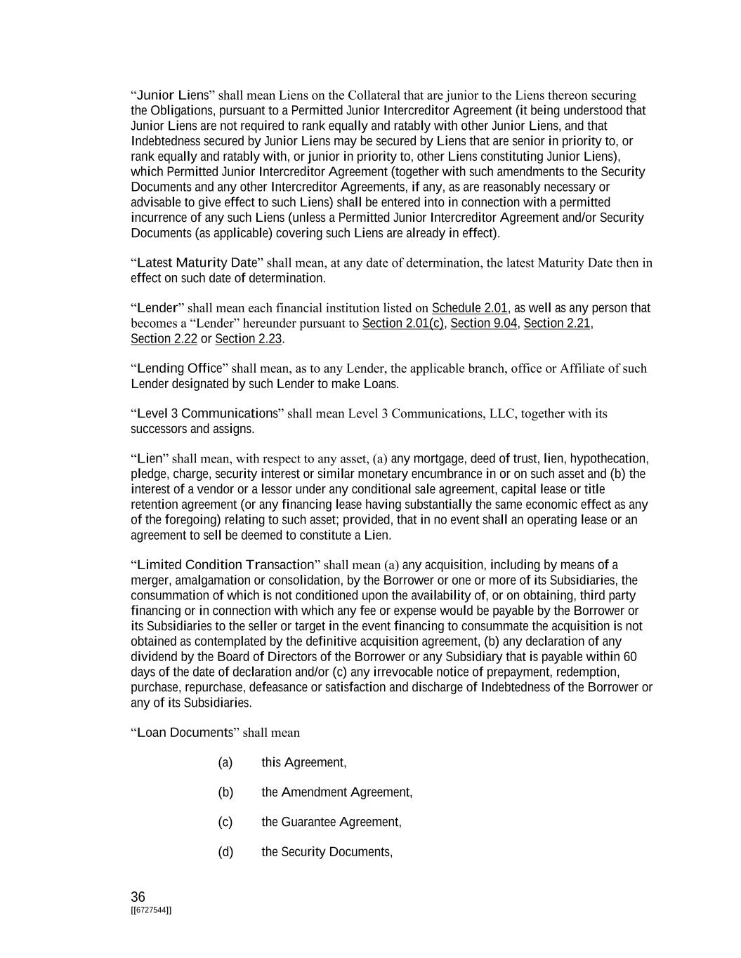 36 [[6727544]] “Junior Liens” shall mean Liens on the Collateral that are junior to the Liens thereon securing the Obligations, pursuant to a Permitted Junior Intercreditor Agreement (it being understood that Junior Liens are not required to rank equally and ratably with other Junior Liens, and that Indebtedness secured by Junior Liens may be secured by Liens that are senior in priority to, or rank equally and ratably with, or junior in priority to, other Liens constituting Junior Liens), which Permitted Junior Intercreditor Agreement (together with such amendments to the Security Documents and any other Intercreditor Agreements, if any, as are reasonably necessary or advisable to give effect to such Liens) shall be entered into in connection with a permitted incurrence of any such Liens (unless a Permitted Junior Intercreditor Agreement and/or Security Documents (as applicable) covering such Liens are already in effect). “Latest Maturity Date” shall mean, at any date of determination, the latest Maturity Date then in effect on such date of determination. “Lender” shall mean each financial institution listed on Schedule 2.01, as well as any person that becomes a “Lender” hereunder pursuant to Section 2.01(c), Section 9.04, Section 2.21, Section 2.22 or Section 2.23. “Lending Office” shall mean, as to any Lender, the applicable branch, office or Affiliate of such Lender designated by such Lender to make Loans. “Level 3 Communications” shall mean Level 3 Communications, LLC, together with its successors and assigns. “Lien” shall mean, with respect to any asset, (a) any mortgage, deed of trust, lien, hypothecation, pledge, charge, security interest or similar monetary encumbrance in or on such asset and (b) the interest of a vendor or a lessor under any conditional sale agreement, capital lease or title retention agreement (or any financing lease having substantially the same economic effect as any of the foregoing) relating to such asset; provided, that in no event shall an operating lease or an agreement to sell be deemed to constitute a Lien. “Limited Condition Transaction” shall mean (a) any acquisition, including by means of a merger, amalgamation or consolidation, by the Borrower or one or more of its Subsidiaries, the consummation of which is not conditioned upon the availability of, or on obtaining, third party financing or in connection with which any fee or expense would be payable by the Borrower or its Subsidiaries to the seller or target in the event financing to consummate the acquisition is not obtained as contemplated by the definitive acquisition agreement, (b) any declaration of any dividend by the Board of Directors of the Borrower or any Subsidiary that is payable within 60 days of the date of declaration and/or (c) any irrevocable notice of prepayment, redemption, purchase, repurchase, defeasance or satisfaction and discharge of Indebtedness of the Borrower or any of its Subsidiaries. “Loan Documents” shall mean (a) this Agreement, (b) the Amendment Agreement, (c) the Guarantee Agreement, (d) the Security Documents,