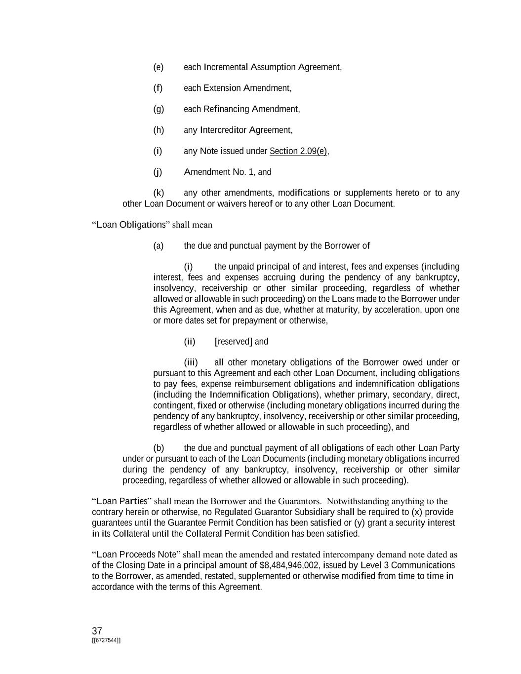 37 [[6727544]] (e) each Incremental Assumption Agreement, (f) each Extension Amendment, (g) each Refinancing Amendment, (h) any Intercreditor Agreement, (i) any Note issued under Section 2.09(e), (j) Amendment No. 1, and (k) any other amendments, modifications or supplements hereto or to any other Loan Document or waivers hereof or to any other Loan Document. “Loan Obligations” shall mean (a) the due and punctual payment by the Borrower of (i) the unpaid principal of and interest, fees and expenses (including interest, fees and expenses accruing during the pendency of any bankruptcy, insolvency, receivership or other similar proceeding, regardless of whether allowed or allowable in such proceeding) on the Loans made to the Borrower under this Agreement, when and as due, whether at maturity, by acceleration, upon one or more dates set for prepayment or otherwise, (ii) [reserved] and (iii) all other monetary obligations of the Borrower owed under or pursuant to this Agreement and each other Loan Document, including obligations to pay fees, expense reimbursement obligations and indemnification obligations (including the Indemnification Obligations), whether primary, secondary, direct, contingent, fixed or otherwise (including monetary obligations incurred during the pendency of any bankruptcy, insolvency, receivership or other similar proceeding, regardless of whether allowed or allowable in such proceeding), and (b) the due and punctual payment of all obligations of each other Loan Party under or pursuant to each of the Loan Documents (including monetary obligations incurred during the pendency of any bankruptcy, insolvency, receivership or other similar proceeding, regardless of whether allowed or allowable in such proceeding). “Loan Parties” shall mean the Borrower and the Guarantors. Notwithstanding anything to the contrary herein or otherwise, no Regulated Guarantor Subsidiary shall be required to (x) provide guarantees until the Guarantee Permit Condition has been satisfied or (y) grant a security interest in its Collateral until the Collateral Permit Condition has been satisfied. “Loan Proceeds Note” shall mean the amended and restated intercompany demand note dated as of the Closing Date in a principal amount of $8,484,946,002, issued by Level 3 Communications to the Borrower, as amended, restated, supplemented or otherwise modified from time to time in accordance with the terms of this Agreement.