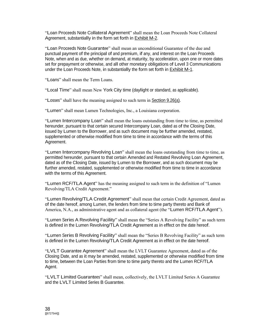 38 [[6727544]] “Loan Proceeds Note Collateral Agreement” shall mean the Loan Proceeds Note Collateral Agreement, substantially in the form set forth in Exhibit M-2. “Loan Proceeds Note Guarantee” shall mean an unconditional Guarantee of the due and punctual payment of the principal of and premium, if any, and interest on the Loan Proceeds Note, when and as due, whether on demand, at maturity, by acceleration, upon one or more dates set for prepayment or otherwise, and all other monetary obligations of Level 3 Communications under the Loan Proceeds Note, in substantially the form set forth in Exhibit M-1. “Loans” shall mean the Term Loans. “Local Time” shall mean New York City time (daylight or standard, as applicable). “Losses” shall have the meaning assigned to such term in Section 9.26(a). “Lumen” shall mean Lumen Technologies, Inc., a Louisiana corporation. “Lumen Intercompany Loan” shall mean the loans outstanding from time to time, as permitted hereunder, pursuant to that certain secured Intercompany Loan, dated as of the Closing Date, issued by Lumen to the Borrower, and as such document may be further amended, restated, supplemented or otherwise modified from time to time in accordance with the terms of this Agreement. “Lumen Intercompany Revolving Loan” shall mean the loans outstanding from time to time, as permitted hereunder, pursuant to that certain Amended and Restated Revolving Loan Agreement, dated as of the Closing Date, issued by Lumen to the Borrower, and as such document may be further amended, restated, supplemented or otherwise modified from time to time in accordance with the terms of this Agreement. “Lumen RCF/TLA Agent” has the meaning assigned to such term in the definition of “Lumen Revolving/TLA Credit Agreement.” “Lumen Revolving/TLA Credit Agreement” shall mean that certain Credit Agreement, dated as of the date hereof, among Lumen, the lenders from time to time party thereto and Bank of America, N.A., as administrative agent and as collateral agent (the “Lumen RCF/TLA Agent”). “Lumen Series A Revolving Facility” shall mean the “Series A Revolving Facility” as such term is defined in the Lumen Revolving/TLA Credit Agreement as in effect on the date hereof. “Lumen Series B Revolving Facility” shall mean the “Series B Revolving Facility” as such term is defined in the Lumen Revolving/TLA Credit Agreement as in effect on the date hereof. “LVLT Guarantee Agreement” shall mean the LVLT Guarantee Agreement, dated as of the Closing Date, and as it may be amended, restated, supplemented or otherwise modified from time to time, between the Loan Parties from time to time party thereto and the Lumen RCF/TLA Agent. “LVLT Limited Guarantees” shall mean, collectively, the LVLT Limited Series A Guarantee and the LVLT Limited Series B Guarantee.