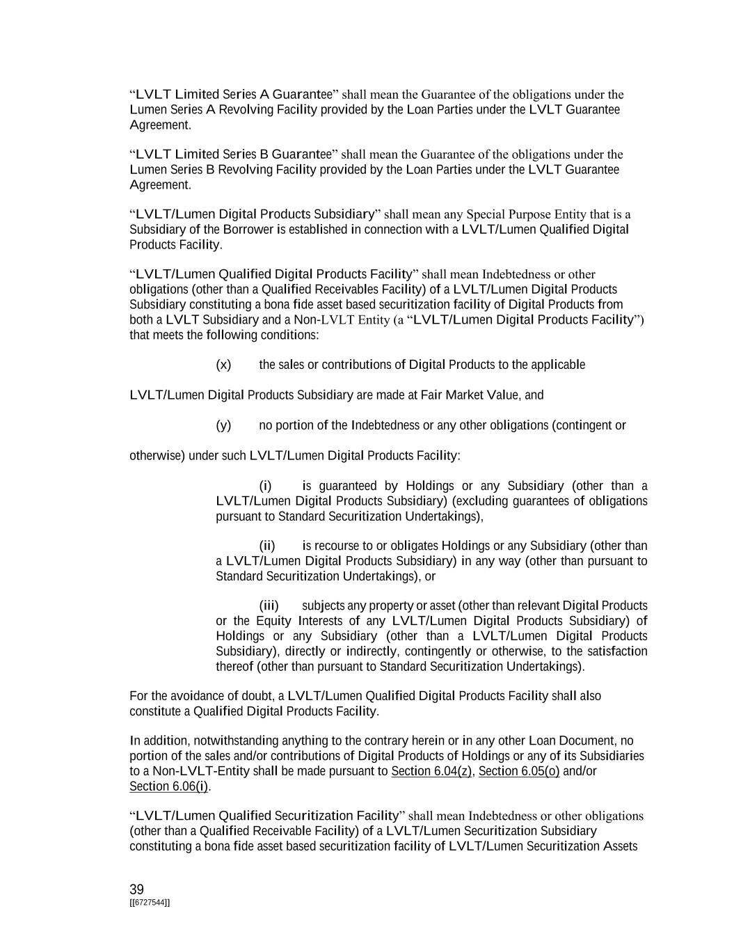 39 [[6727544]] “LVLT Limited Series A Guarantee” shall mean the Guarantee of the obligations under the Lumen Series A Revolving Facility provided by the Loan Parties under the LVLT Guarantee Agreement. “LVLT Limited Series B Guarantee” shall mean the Guarantee of the obligations under the Lumen Series B Revolving Facility provided by the Loan Parties under the LVLT Guarantee Agreement. “LVLT/Lumen Digital Products Subsidiary” shall mean any Special Purpose Entity that is a Subsidiary of the Borrower is established in connection with a LVLT/Lumen Qualified Digital Products Facility. “LVLT/Lumen Qualified Digital Products Facility” shall mean Indebtedness or other obligations (other than a Qualified Receivables Facility) of a LVLT/Lumen Digital Products Subsidiary constituting a bona fide asset based securitization facility of Digital Products from both a LVLT Subsidiary and a Non-LVLT Entity (a “LVLT/Lumen Digital Products Facility”) that meets the following conditions: (x) the sales or contributions of Digital Products to the applicable LVLT/Lumen Digital Products Subsidiary are made at Fair Market Value, and (y) no portion of the Indebtedness or any other obligations (contingent or otherwise) under such LVLT/Lumen Digital Products Facility: (i) is guaranteed by Holdings or any Subsidiary (other than a LVLT/Lumen Digital Products Subsidiary) (excluding guarantees of obligations pursuant to Standard Securitization Undertakings), (ii) is recourse to or obligates Holdings or any Subsidiary (other than a LVLT/Lumen Digital Products Subsidiary) in any way (other than pursuant to Standard Securitization Undertakings), or (iii) subjects any property or asset (other than relevant Digital Products or the Equity Interests of any LVLT/Lumen Digital Products Subsidiary) of Holdings or any Subsidiary (other than a LVLT/Lumen Digital Products Subsidiary), directly or indirectly, contingently or otherwise, to the satisfaction thereof (other than pursuant to Standard Securitization Undertakings). For the avoidance of doubt, a LVLT/Lumen Qualified Digital Products Facility shall also constitute a Qualified Digital Products Facility. In addition, notwithstanding anything to the contrary herein or in any other Loan Document, no portion of the sales and/or contributions of Digital Products of Holdings or any of its Subsidiaries to a Non-LVLT-Entity shall be made pursuant to Section 6.04(z), Section 6.05(o) and/or Section 6.06(i). “LVLT/Lumen Qualified Securitization Facility” shall mean Indebtedness or other obligations (other than a Qualified Receivable Facility) of a LVLT/Lumen Securitization Subsidiary constituting a bona fide asset based securitization facility of LVLT/Lumen Securitization Assets