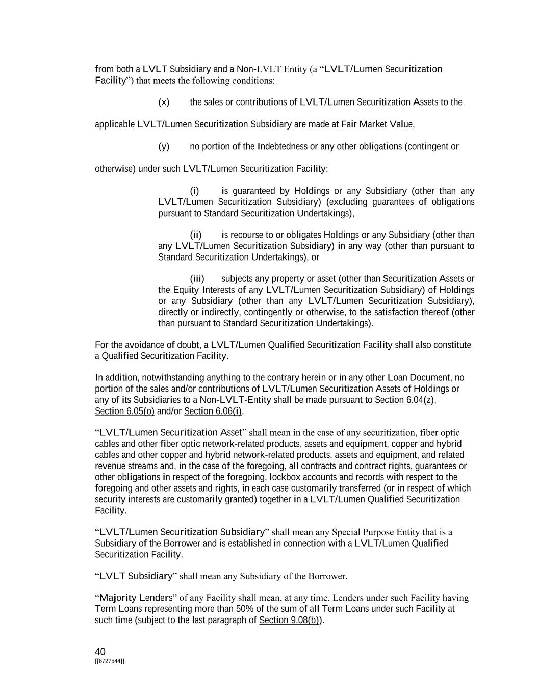 40 [[6727544]] from both a LVLT Subsidiary and a Non-LVLT Entity (a “LVLT/Lumen Securitization Facility”) that meets the following conditions: (x) the sales or contributions of LVLT/Lumen Securitization Assets to the applicable LVLT/Lumen Securitization Subsidiary are made at Fair Market Value, (y) no portion of the Indebtedness or any other obligations (contingent or otherwise) under such LVLT/Lumen Securitization Facility: (i) is guaranteed by Holdings or any Subsidiary (other than any LVLT/Lumen Securitization Subsidiary) (excluding guarantees of obligations pursuant to Standard Securitization Undertakings), (ii) is recourse to or obligates Holdings or any Subsidiary (other than any LVLT/Lumen Securitization Subsidiary) in any way (other than pursuant to Standard Securitization Undertakings), or (iii) subjects any property or asset (other than Securitization Assets or the Equity Interests of any LVLT/Lumen Securitization Subsidiary) of Holdings or any Subsidiary (other than any LVLT/Lumen Securitization Subsidiary), directly or indirectly, contingently or otherwise, to the satisfaction thereof (other than pursuant to Standard Securitization Undertakings). For the avoidance of doubt, a LVLT/Lumen Qualified Securitization Facility shall also constitute a Qualified Securitization Facility. In addition, notwithstanding anything to the contrary herein or in any other Loan Document, no portion of the sales and/or contributions of LVLT/Lumen Securitization Assets of Holdings or any of its Subsidiaries to a Non-LVLT-Entity shall be made pursuant to Section 6.04(z), Section 6.05(o) and/or Section 6.06(i). “LVLT/Lumen Securitization Asset” shall mean in the case of any securitization, fiber optic cables and other fiber optic network-related products, assets and equipment, copper and hybrid cables and other copper and hybrid network-related products, assets and equipment, and related revenue streams and, in the case of the foregoing, all contracts and contract rights, guarantees or other obligations in respect of the foregoing, lockbox accounts and records with respect to the foregoing and other assets and rights, in each case customarily transferred (or in respect of which security interests are customarily granted) together in a LVLT/Lumen Qualified Securitization Facility. “LVLT/Lumen Securitization Subsidiary” shall mean any Special Purpose Entity that is a Subsidiary of the Borrower and is established in connection with a LVLT/Lumen Qualified Securitization Facility. “LVLT Subsidiary” shall mean any Subsidiary of the Borrower. “Majority Lenders” of any Facility shall mean, at any time, Lenders under such Facility having Term Loans representing more than 50% of the sum of all Term Loans under such Facility at such time (subject to the last paragraph of Section 9.08(b)).