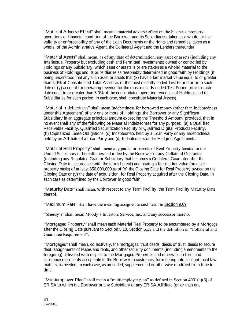 41 [[6727544]] “Material Adverse Effect” shall mean a material adverse effect on the business, property, operations or financial condition of the Borrower and its Subsidiaries, taken as a whole, or the validity or enforceability of any of the Loan Documents or the rights and remedies, taken as a whole, of the Administrative Agent, the Collateral Agent and the Lenders thereunder. “Material Assets” shall mean, as of any date of determination, any asset or assets (including any Intellectual Property but excluding cash and Permitted Investments) owned or controlled by Holdings or any Subsidiary, which asset or assets is or are (taken as a whole) material to the business of Holdings and its Subsidiaries as reasonably determined in good faith by Holdings (it being understood that any such asset or assets that (x) have a fair market value equal to or greater than 5.0% of Consolidated Total Assets as of the most recently ended Test Period prior to such date or (y) account for operating revenue for the most recently ended Test Period prior to such date equal to or greater than 5.0% of the consolidated operating revenues of Holdings and its Subsidiaries for such period, in each case, shall constitute Material Assets). “Material Indebtedness” shall mean Indebtedness for borrowed money (other than Indebtedness under this Agreement) of any one or more of Holdings, the Borrower or any Significant Subsidiary in an aggregate principal amount exceeding the Threshold Amount; provided, that in no event shall any of the following be Material Indebtedness for any purpose: (a) a Qualified Receivable Facility, Qualified Securitization Facility or Qualified Digital Products Facility, (b) Capitalized Lease Obligations, (c) Indebtedness held by a Loan Party or any Indebtedness held by an Affiliate of a Loan Party and (d) Indebtedness under Hedging Agreements. “Material Real Property” shall mean any parcel or parcels of Real Property located in the United States now or hereafter owned in fee by the Borrower or any Collateral Guarantor (including any Regulated Grantor Subsidiary that becomes a Collateral Guarantor after the Closing Date in accordance with the terms hereof) and having a fair market value (on a per- property basis) of at least $50,000,000 as of (x) the Closing Date for Real Property owned on the Closing Date or (y) the date of acquisition, for Real Property acquired after the Closing Date, in each case as determined by the Borrower in good faith. “Maturity Date” shall mean, with respect to any Term Facility, the Term Facility Maturity Date thereof. “Maximum Rate” shall have the meaning assigned to such term in Section 9.09. “Moody’s” shall mean Moody’s Investors Service, Inc. and any successor thereto. “Mortgaged Property” shall mean each Material Real Property to be encumbered by a Mortgage after the Closing Date pursuant to Section 5.10, Section 5.13 and the definition of “Collateral and Guarantee Requirement”. “Mortgages” shall mean, collectively, the mortgages, trust deeds, deeds of trust, deeds to secure debt, assignments of leases and rents, and other security documents (including amendments to the foregoing) delivered with respect to the Mortgaged Properties and otherwise in form and substance reasonably acceptable to the Borrower in customary form taking into account local law matters, as needed, in each case, as amended, supplemented or otherwise modified from time to time. “Multiemployer Plan” shall mean a “multiemployer plan” as defined in Section 4001(a)(3) of ERISA to which the Borrower or any Subsidiary or any ERISA Affiliate (other than one