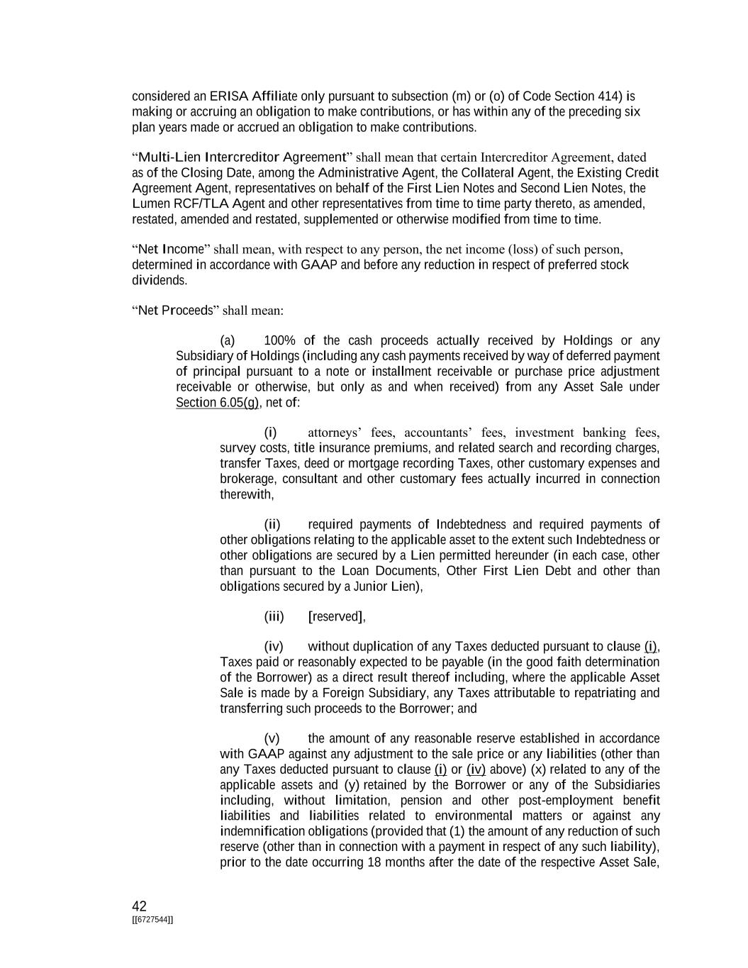 42 [[6727544]] considered an ERISA Affiliate only pursuant to subsection (m) or (o) of Code Section 414) is making or accruing an obligation to make contributions, or has within any of the preceding six plan years made or accrued an obligation to make contributions. “Multi-Lien Intercreditor Agreement” shall mean that certain Intercreditor Agreement, dated as of the Closing Date, among the Administrative Agent, the Collateral Agent, the Existing Credit Agreement Agent, representatives on behalf of the First Lien Notes and Second Lien Notes, the Lumen RCF/TLA Agent and other representatives from time to time party thereto, as amended, restated, amended and restated, supplemented or otherwise modified from time to time. “Net Income” shall mean, with respect to any person, the net income (loss) of such person, determined in accordance with GAAP and before any reduction in respect of preferred stock dividends. “Net Proceeds” shall mean: (a) 100% of the cash proceeds actually received by Holdings or any Subsidiary of Holdings (including any cash payments received by way of deferred payment of principal pursuant to a note or installment receivable or purchase price adjustment receivable or otherwise, but only as and when received) from any Asset Sale under Section 6.05(g), net of: (i) attorneys’ fees, accountants’ fees, investment banking fees, survey costs, title insurance premiums, and related search and recording charges, transfer Taxes, deed or mortgage recording Taxes, other customary expenses and brokerage, consultant and other customary fees actually incurred in connection therewith, (ii) required payments of Indebtedness and required payments of other obligations relating to the applicable asset to the extent such Indebtedness or other obligations are secured by a Lien permitted hereunder (in each case, other than pursuant to the Loan Documents, Other First Lien Debt and other than obligations secured by a Junior Lien), (iii) [reserved], (iv) without duplication of any Taxes deducted pursuant to clause (i), Taxes paid or reasonably expected to be payable (in the good faith determination of the Borrower) as a direct result thereof including, where the applicable Asset Sale is made by a Foreign Subsidiary, any Taxes attributable to repatriating and transferring such proceeds to the Borrower; and (v) the amount of any reasonable reserve established in accordance with GAAP against any adjustment to the sale price or any liabilities (other than any Taxes deducted pursuant to clause (i) or (iv) above) (x) related to any of the applicable assets and (y) retained by the Borrower or any of the Subsidiaries including, without limitation, pension and other post-employment benefit liabilities and liabilities related to environmental matters or against any indemnification obligations (provided that (1) the amount of any reduction of such reserve (other than in connection with a payment in respect of any such liability), prior to the date occurring 18 months after the date of the respective Asset Sale,