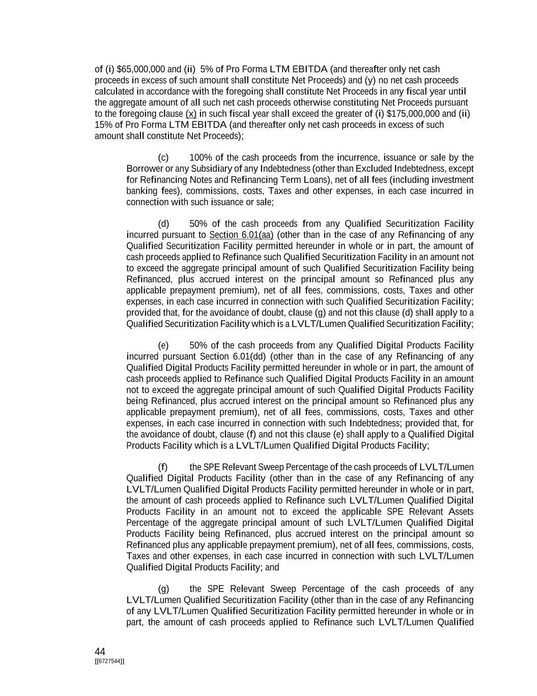 44 [[6727544]] of (i) $65,000,000 and (ii) 5% of Pro Forma LTM EBITDA (and thereafter only net cash proceeds in excess of such amount shall constitute Net Proceeds) and (y) no net cash proceeds calculated in accordance with the foregoing shall constitute Net Proceeds in any fiscal year until the aggregate amount of all such net cash proceeds otherwise constituting Net Proceeds pursuant to the foregoing clause (x) in such fiscal year shall exceed the greater of (i) $175,000,000 and (ii) 15% of Pro Forma LTM EBITDA (and thereafter only net cash proceeds in excess of such amount shall constitute Net Proceeds); (c) 100% of the cash proceeds from the incurrence, issuance or sale by the Borrower or any Subsidiary of any Indebtedness (other than Excluded Indebtedness, except for Refinancing Notes and Refinancing Term Loans), net of all fees (including investment banking fees), commissions, costs, Taxes and other expenses, in each case incurred in connection with such issuance or sale; (d) 50% of the cash proceeds from any Qualified Securitization Facility incurred pursuant to Section 6.01(aa) (other than in the case of any Refinancing of any Qualified Securitization Facility permitted hereunder in whole or in part, the amount of cash proceeds applied to Refinance such Qualified Securitization Facility in an amount not to exceed the aggregate principal amount of such Qualified Securitization Facility being Refinanced, plus accrued interest on the principal amount so Refinanced plus any applicable prepayment premium), net of all fees, commissions, costs, Taxes and other expenses, in each case incurred in connection with such Qualified Securitization Facility; provided that, for the avoidance of doubt, clause (g) and not this clause (d) shall apply to a Qualified Securitization Facility which is a LVLT/Lumen Qualified Securitization Facility; (e) 50% of the cash proceeds from any Qualified Digital Products Facility incurred pursuant Section 6.01(dd) (other than in the case of any Refinancing of any Qualified Digital Products Facility permitted hereunder in whole or in part, the amount of cash proceeds applied to Refinance such Qualified Digital Products Facility in an amount not to exceed the aggregate principal amount of such Qualified Digital Products Facility being Refinanced, plus accrued interest on the principal amount so Refinanced plus any applicable prepayment premium), net of all fees, commissions, costs, Taxes and other expenses, in each case incurred in connection with such Indebtedness; provided that, for the avoidance of doubt, clause (f) and not this clause (e) shall apply to a Qualified Digital Products Facility which is a LVLT/Lumen Qualified Digital Products Facility; (f) the SPE Relevant Sweep Percentage of the cash proceeds of LVLT/Lumen Qualified Digital Products Facility (other than in the case of any Refinancing of any LVLT/Lumen Qualified Digital Products Facility permitted hereunder in whole or in part, the amount of cash proceeds applied to Refinance such LVLT/Lumen Qualified Digital Products Facility in an amount not to exceed the applicable SPE Relevant Assets Percentage of the aggregate principal amount of such LVLT/Lumen Qualified Digital Products Facility being Refinanced, plus accrued interest on the principal amount so Refinanced plus any applicable prepayment premium), net of all fees, commissions, costs, Taxes and other expenses, in each case incurred in connection with such LVLT/Lumen Qualified Digital Products Facility; and (g) the SPE Relevant Sweep Percentage of the cash proceeds of any LVLT/Lumen Qualified Securitization Facility (other than in the case of any Refinancing of any LVLT/Lumen Qualified Securitization Facility permitted hereunder in whole or in part, the amount of cash proceeds applied to Refinance such LVLT/Lumen Qualified
