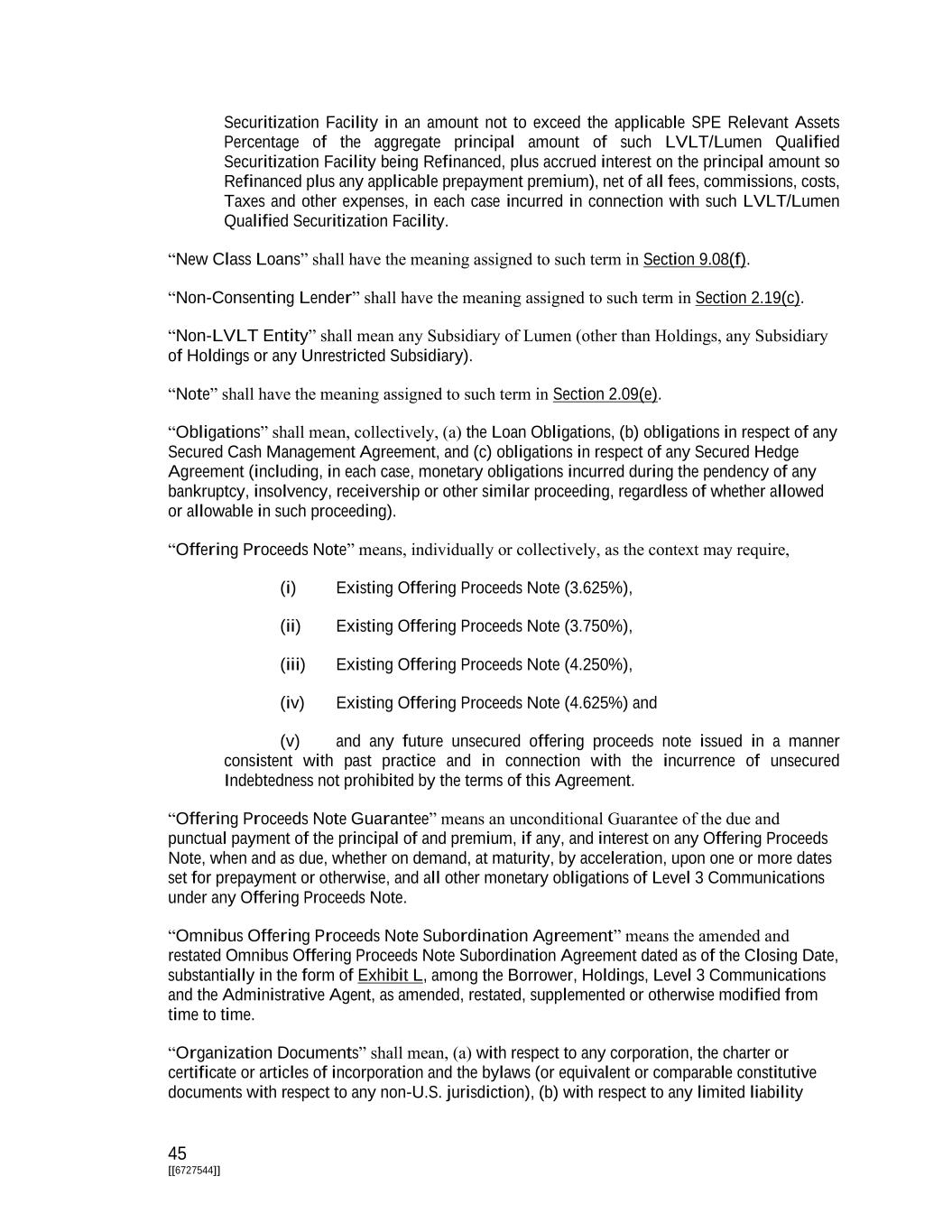 45 [[6727544]] Securitization Facility in an amount not to exceed the applicable SPE Relevant Assets Percentage of the aggregate principal amount of such LVLT/Lumen Qualified Securitization Facility being Refinanced, plus accrued interest on the principal amount so Refinanced plus any applicable prepayment premium), net of all fees, commissions, costs, Taxes and other expenses, in each case incurred in connection with such LVLT/Lumen Qualified Securitization Facility. “New Class Loans” shall have the meaning assigned to such term in Section 9.08(f). “Non-Consenting Lender” shall have the meaning assigned to such term in Section 2.19(c). “Non-LVLT Entity” shall mean any Subsidiary of Lumen (other than Holdings, any Subsidiary of Holdings or any Unrestricted Subsidiary). “Note” shall have the meaning assigned to such term in Section 2.09(e). “Obligations” shall mean, collectively, (a) the Loan Obligations, (b) obligations in respect of any Secured Cash Management Agreement, and (c) obligations in respect of any Secured Hedge Agreement (including, in each case, monetary obligations incurred during the pendency of any bankruptcy, insolvency, receivership or other similar proceeding, regardless of whether allowed or allowable in such proceeding). “Offering Proceeds Note” means, individually or collectively, as the context may require, (i) Existing Offering Proceeds Note (3.625%), (ii) Existing Offering Proceeds Note (3.750%), (iii) Existing Offering Proceeds Note (4.250%), (iv) Existing Offering Proceeds Note (4.625%) and (v) and any future unsecured offering proceeds note issued in a manner consistent with past practice and in connection with the incurrence of unsecured Indebtedness not prohibited by the terms of this Agreement. “Offering Proceeds Note Guarantee” means an unconditional Guarantee of the due and punctual payment of the principal of and premium, if any, and interest on any Offering Proceeds Note, when and as due, whether on demand, at maturity, by acceleration, upon one or more dates set for prepayment or otherwise, and all other monetary obligations of Level 3 Communications under any Offering Proceeds Note. “Omnibus Offering Proceeds Note Subordination Agreement” means the amended and restated Omnibus Offering Proceeds Note Subordination Agreement dated as of the Closing Date, substantially in the form of Exhibit L, among the Borrower, Holdings, Level 3 Communications and the Administrative Agent, as amended, restated, supplemented or otherwise modified from time to time. “Organization Documents” shall mean, (a) with respect to any corporation, the charter or certificate or articles of incorporation and the bylaws (or equivalent or comparable constitutive documents with respect to any non-U.S. jurisdiction), (b) with respect to any limited liability