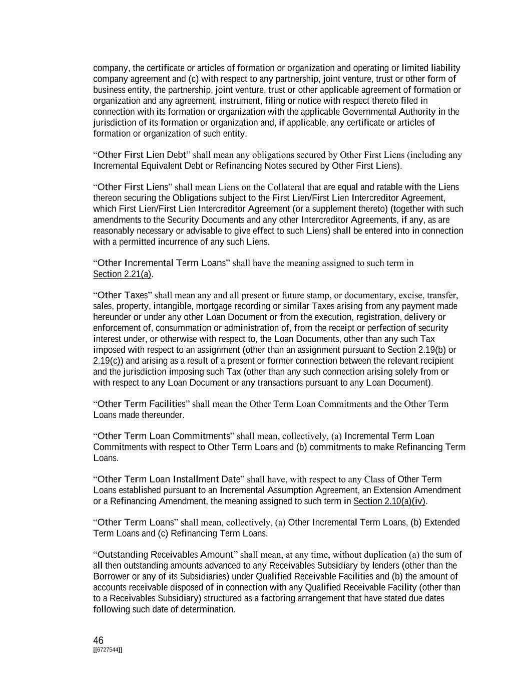 46 [[6727544]] company, the certificate or articles of formation or organization and operating or limited liability company agreement and (c) with respect to any partnership, joint venture, trust or other form of business entity, the partnership, joint venture, trust or other applicable agreement of formation or organization and any agreement, instrument, filing or notice with respect thereto filed in connection with its formation or organization with the applicable Governmental Authority in the jurisdiction of its formation or organization and, if applicable, any certificate or articles of formation or organization of such entity. “Other First Lien Debt” shall mean any obligations secured by Other First Liens (including any Incremental Equivalent Debt or Refinancing Notes secured by Other First Liens). “Other First Liens” shall mean Liens on the Collateral that are equal and ratable with the Liens thereon securing the Obligations subject to the First Lien/First Lien Intercreditor Agreement, which First Lien/First Lien Intercreditor Agreement (or a supplement thereto) (together with such amendments to the Security Documents and any other Intercreditor Agreements, if any, as are reasonably necessary or advisable to give effect to such Liens) shall be entered into in connection with a permitted incurrence of any such Liens. “Other Incremental Term Loans” shall have the meaning assigned to such term in Section 2.21(a). “Other Taxes” shall mean any and all present or future stamp, or documentary, excise, transfer, sales, property, intangible, mortgage recording or similar Taxes arising from any payment made hereunder or under any other Loan Document or from the execution, registration, delivery or enforcement of, consummation or administration of, from the receipt or perfection of security interest under, or otherwise with respect to, the Loan Documents, other than any such Tax imposed with respect to an assignment (other than an assignment pursuant to Section 2.19(b) or 2.19(c)) and arising as a result of a present or former connection between the relevant recipient and the jurisdiction imposing such Tax (other than any such connection arising solely from or with respect to any Loan Document or any transactions pursuant to any Loan Document). “Other Term Facilities” shall mean the Other Term Loan Commitments and the Other Term Loans made thereunder. “Other Term Loan Commitments” shall mean, collectively, (a) Incremental Term Loan Commitments with respect to Other Term Loans and (b) commitments to make Refinancing Term Loans. “Other Term Loan Installment Date” shall have, with respect to any Class of Other Term Loans established pursuant to an Incremental Assumption Agreement, an Extension Amendment or a Refinancing Amendment, the meaning assigned to such term in Section 2.10(a)(iv). “Other Term Loans” shall mean, collectively, (a) Other Incremental Term Loans, (b) Extended Term Loans and (c) Refinancing Term Loans. “Outstanding Receivables Amount” shall mean, at any time, without duplication (a) the sum of all then outstanding amounts advanced to any Receivables Subsidiary by lenders (other than the Borrower or any of its Subsidiaries) under Qualified Receivable Facilities and (b) the amount of accounts receivable disposed of in connection with any Qualified Receivable Facility (other than to a Receivables Subsidiary) structured as a factoring arrangement that have stated due dates following such date of determination.