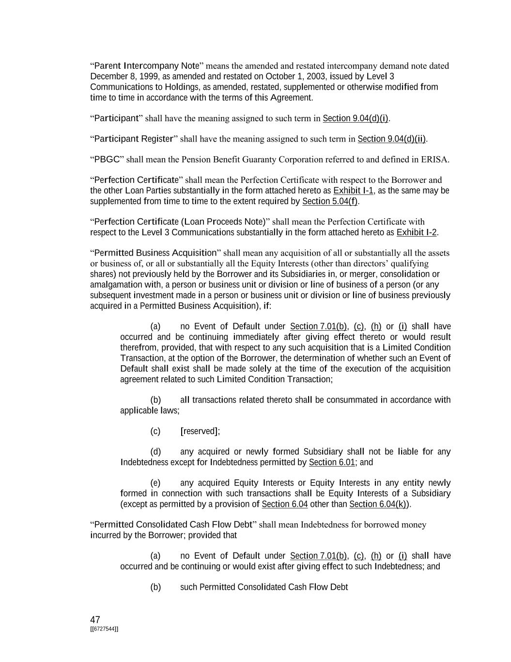 47 [[6727544]] “Parent Intercompany Note” means the amended and restated intercompany demand note dated December 8, 1999, as amended and restated on October 1, 2003, issued by Level 3 Communications to Holdings, as amended, restated, supplemented or otherwise modified from time to time in accordance with the terms of this Agreement. “Participant” shall have the meaning assigned to such term in Section 9.04(d)(i). “Participant Register” shall have the meaning assigned to such term in Section 9.04(d)(ii). “PBGC” shall mean the Pension Benefit Guaranty Corporation referred to and defined in ERISA. “Perfection Certificate” shall mean the Perfection Certificate with respect to the Borrower and the other Loan Parties substantially in the form attached hereto as Exhibit I-1, as the same may be supplemented from time to time to the extent required by Section 5.04(f). “Perfection Certificate (Loan Proceeds Note)” shall mean the Perfection Certificate with respect to the Level 3 Communications substantially in the form attached hereto as Exhibit I-2. “Permitted Business Acquisition” shall mean any acquisition of all or substantially all the assets or business of, or all or substantially all the Equity Interests (other than directors’ qualifying shares) not previously held by the Borrower and its Subsidiaries in, or merger, consolidation or amalgamation with, a person or business unit or division or line of business of a person (or any subsequent investment made in a person or business unit or division or line of business previously acquired in a Permitted Business Acquisition), if: (a) no Event of Default under Section 7.01(b), (c), (h) or (i) shall have occurred and be continuing immediately after giving effect thereto or would result therefrom, provided, that with respect to any such acquisition that is a Limited Condition Transaction, at the option of the Borrower, the determination of whether such an Event of Default shall exist shall be made solely at the time of the execution of the acquisition agreement related to such Limited Condition Transaction; (b) all transactions related thereto shall be consummated in accordance with applicable laws; (c) [reserved]; (d) any acquired or newly formed Subsidiary shall not be liable for any Indebtedness except for Indebtedness permitted by Section 6.01; and (e) any acquired Equity Interests or Equity Interests in any entity newly formed in connection with such transactions shall be Equity Interests of a Subsidiary (except as permitted by a provision of Section 6.04 other than Section 6.04(k)). “Permitted Consolidated Cash Flow Debt” shall mean Indebtedness for borrowed money incurred by the Borrower; provided that (a) no Event of Default under Section 7.01(b), (c), (h) or (i) shall have occurred and be continuing or would exist after giving effect to such Indebtedness; and (b) such Permitted Consolidated Cash Flow Debt