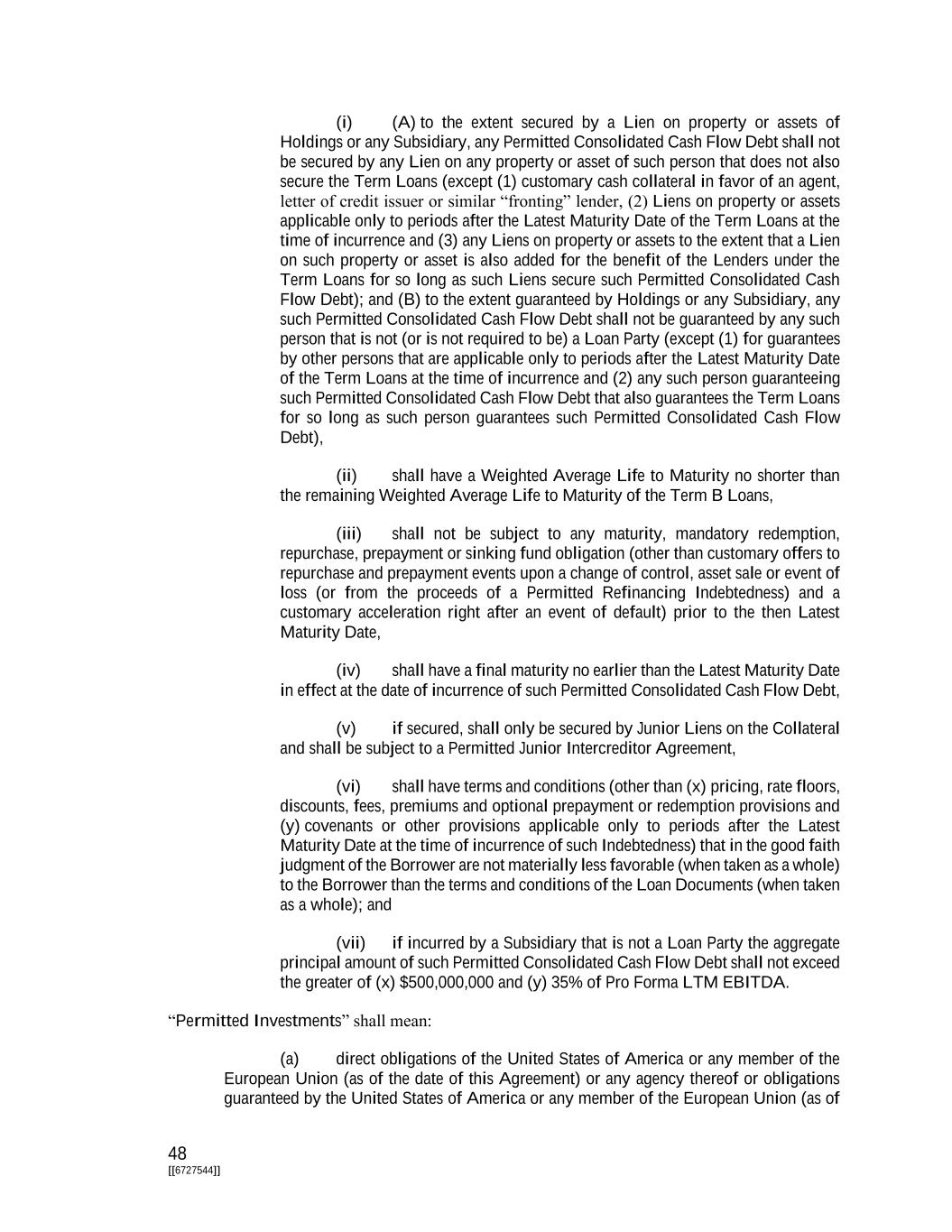 48 [[6727544]] (i) (A) to the extent secured by a Lien on property or assets of Holdings or any Subsidiary, any Permitted Consolidated Cash Flow Debt shall not be secured by any Lien on any property or asset of such person that does not also secure the Term Loans (except (1) customary cash collateral in favor of an agent, letter of credit issuer or similar “fronting” lender, (2) Liens on property or assets applicable only to periods after the Latest Maturity Date of the Term Loans at the time of incurrence and (3) any Liens on property or assets to the extent that a Lien on such property or asset is also added for the benefit of the Lenders under the Term Loans for so long as such Liens secure such Permitted Consolidated Cash Flow Debt); and (B) to the extent guaranteed by Holdings or any Subsidiary, any such Permitted Consolidated Cash Flow Debt shall not be guaranteed by any such person that is not (or is not required to be) a Loan Party (except (1) for guarantees by other persons that are applicable only to periods after the Latest Maturity Date of the Term Loans at the time of incurrence and (2) any such person guaranteeing such Permitted Consolidated Cash Flow Debt that also guarantees the Term Loans for so long as such person guarantees such Permitted Consolidated Cash Flow Debt), (ii) shall have a Weighted Average Life to Maturity no shorter than the remaining Weighted Average Life to Maturity of the Term B Loans, (iii) shall not be subject to any maturity, mandatory redemption, repurchase, prepayment or sinking fund obligation (other than customary offers to repurchase and prepayment events upon a change of control, asset sale or event of loss (or from the proceeds of a Permitted Refinancing Indebtedness) and a customary acceleration right after an event of default) prior to the then Latest Maturity Date, (iv) shall have a final maturity no earlier than the Latest Maturity Date in effect at the date of incurrence of such Permitted Consolidated Cash Flow Debt, (v) if secured, shall only be secured by Junior Liens on the Collateral and shall be subject to a Permitted Junior Intercreditor Agreement, (vi) shall have terms and conditions (other than (x) pricing, rate floors, discounts, fees, premiums and optional prepayment or redemption provisions and (y) covenants or other provisions applicable only to periods after the Latest Maturity Date at the time of incurrence of such Indebtedness) that in the good faith judgment of the Borrower are not materially less favorable (when taken as a whole) to the Borrower than the terms and conditions of the Loan Documents (when taken as a whole); and (vii) if incurred by a Subsidiary that is not a Loan Party the aggregate principal amount of such Permitted Consolidated Cash Flow Debt shall not exceed the greater of (x) $500,000,000 and (y) 35% of Pro Forma LTM EBITDA. “Permitted Investments” shall mean: (a) direct obligations of the United States of America or any member of the European Union (as of the date of this Agreement) or any agency thereof or obligations guaranteed by the United States of America or any member of the European Union (as of
