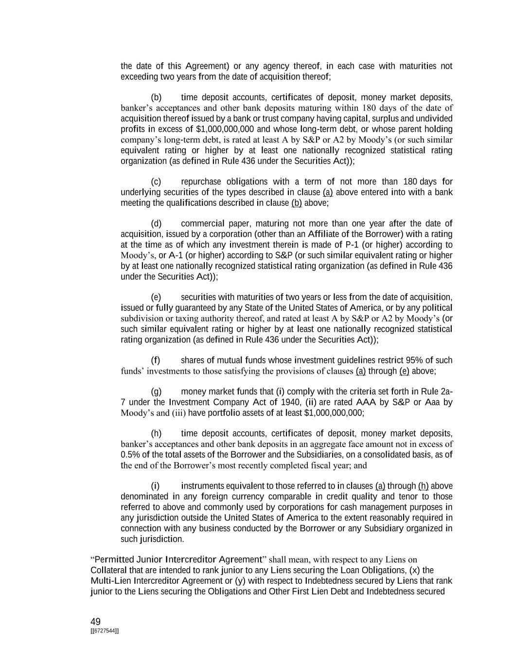 49 [[6727544]] the date of this Agreement) or any agency thereof, in each case with maturities not exceeding two years from the date of acquisition thereof; (b) time deposit accounts, certificates of deposit, money market deposits, banker’s acceptances and other bank deposits maturing within 180 days of the date of acquisition thereof issued by a bank or trust company having capital, surplus and undivided profits in excess of $1,000,000,000 and whose long-term debt, or whose parent holding company’s long-term debt, is rated at least A by S&P or A2 by Moody’s (or such similar equivalent rating or higher by at least one nationally recognized statistical rating organization (as defined in Rule 436 under the Securities Act)); (c) repurchase obligations with a term of not more than 180 days for underlying securities of the types described in clause (a) above entered into with a bank meeting the qualifications described in clause (b) above; (d) commercial paper, maturing not more than one year after the date of acquisition, issued by a corporation (other than an Affiliate of the Borrower) with a rating at the time as of which any investment therein is made of P-1 (or higher) according to Moody’s, or A-1 (or higher) according to S&P (or such similar equivalent rating or higher by at least one nationally recognized statistical rating organization (as defined in Rule 436 under the Securities Act)); (e) securities with maturities of two years or less from the date of acquisition, issued or fully guaranteed by any State of the United States of America, or by any political subdivision or taxing authority thereof, and rated at least A by S&P or A2 by Moody’s (or such similar equivalent rating or higher by at least one nationally recognized statistical rating organization (as defined in Rule 436 under the Securities Act)); (f) shares of mutual funds whose investment guidelines restrict 95% of such funds’ investments to those satisfying the provisions of clauses (a) through (e) above; (g) money market funds that (i) comply with the criteria set forth in Rule 2a- 7 under the Investment Company Act of 1940, (ii) are rated AAA by S&P or Aaa by Moody’s and (iii) have portfolio assets of at least $1,000,000,000; (h) time deposit accounts, certificates of deposit, money market deposits, banker’s acceptances and other bank deposits in an aggregate face amount not in excess of 0.5% of the total assets of the Borrower and the Subsidiaries, on a consolidated basis, as of the end of the Borrower’s most recently completed fiscal year; and (i) instruments equivalent to those referred to in clauses (a) through (h) above denominated in any foreign currency comparable in credit quality and tenor to those referred to above and commonly used by corporations for cash management purposes in any jurisdiction outside the United States of America to the extent reasonably required in connection with any business conducted by the Borrower or any Subsidiary organized in such jurisdiction. “Permitted Junior Intercreditor Agreement” shall mean, with respect to any Liens on Collateral that are intended to rank junior to any Liens securing the Loan Obligations, (x) the Multi-Lien Intercreditor Agreement or (y) with respect to Indebtedness secured by Liens that rank junior to the Liens securing the Obligations and Other First Lien Debt and Indebtedness secured