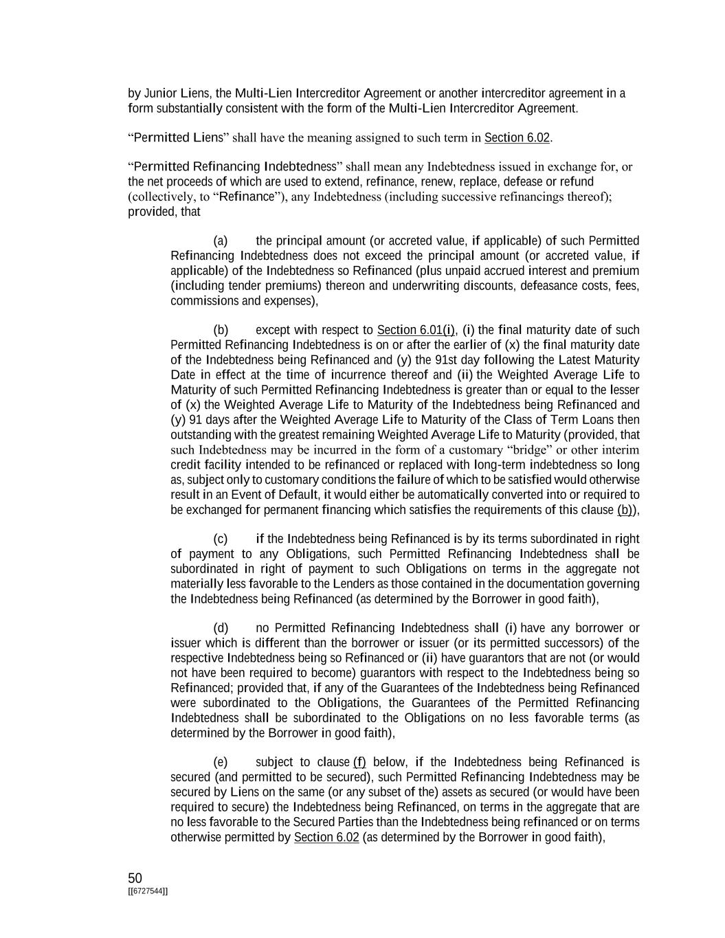 50 [[6727544]] by Junior Liens, the Multi-Lien Intercreditor Agreement or another intercreditor agreement in a form substantially consistent with the form of the Multi-Lien Intercreditor Agreement. “Permitted Liens” shall have the meaning assigned to such term in Section 6.02. “Permitted Refinancing Indebtedness” shall mean any Indebtedness issued in exchange for, or the net proceeds of which are used to extend, refinance, renew, replace, defease or refund (collectively, to “Refinance”), any Indebtedness (including successive refinancings thereof); provided, that (a) the principal amount (or accreted value, if applicable) of such Permitted Refinancing Indebtedness does not exceed the principal amount (or accreted value, if applicable) of the Indebtedness so Refinanced (plus unpaid accrued interest and premium (including tender premiums) thereon and underwriting discounts, defeasance costs, fees, commissions and expenses), (b) except with respect to Section 6.01(i), (i) the final maturity date of such Permitted Refinancing Indebtedness is on or after the earlier of (x) the final maturity date of the Indebtedness being Refinanced and (y) the 91st day following the Latest Maturity Date in effect at the time of incurrence thereof and (ii) the Weighted Average Life to Maturity of such Permitted Refinancing Indebtedness is greater than or equal to the lesser of (x) the Weighted Average Life to Maturity of the Indebtedness being Refinanced and (y) 91 days after the Weighted Average Life to Maturity of the Class of Term Loans then outstanding with the greatest remaining Weighted Average Life to Maturity (provided, that such Indebtedness may be incurred in the form of a customary “bridge” or other interim credit facility intended to be refinanced or replaced with long-term indebtedness so long as, subject only to customary conditions the failure of which to be satisfied would otherwise result in an Event of Default, it would either be automatically converted into or required to be exchanged for permanent financing which satisfies the requirements of this clause (b)), (c) if the Indebtedness being Refinanced is by its terms subordinated in right of payment to any Obligations, such Permitted Refinancing Indebtedness shall be subordinated in right of payment to such Obligations on terms in the aggregate not materially less favorable to the Lenders as those contained in the documentation governing the Indebtedness being Refinanced (as determined by the Borrower in good faith), (d) no Permitted Refinancing Indebtedness shall (i) have any borrower or issuer which is different than the borrower or issuer (or its permitted successors) of the respective Indebtedness being so Refinanced or (ii) have guarantors that are not (or would not have been required to become) guarantors with respect to the Indebtedness being so Refinanced; provided that, if any of the Guarantees of the Indebtedness being Refinanced were subordinated to the Obligations, the Guarantees of the Permitted Refinancing Indebtedness shall be subordinated to the Obligations on no less favorable terms (as determined by the Borrower in good faith), (e) subject to clause (f) below, if the Indebtedness being Refinanced is secured (and permitted to be secured), such Permitted Refinancing Indebtedness may be secured by Liens on the same (or any subset of the) assets as secured (or would have been required to secure) the Indebtedness being Refinanced, on terms in the aggregate that are no less favorable to the Secured Parties than the Indebtedness being refinanced or on terms otherwise permitted by Section 6.02 (as determined by the Borrower in good faith),