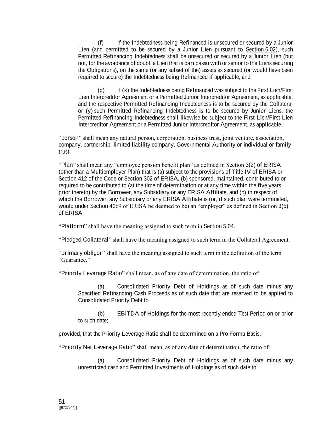 51 [[6727544]] (f) if the Indebtedness being Refinanced is unsecured or secured by a Junior Lien (and permitted to be secured by a Junior Lien pursuant to Section 6.02), such Permitted Refinancing Indebtedness shall be unsecured or secured by a Junior Lien (but not, for the avoidance of doubt, a Lien that is pari passu with or senior to the Liens securing the Obligations), on the same (or any subset of the) assets as secured (or would have been required to secure) the Indebtedness being Refinanced if applicable, and (g) if (x) the Indebtedness being Refinanced was subject to the First Lien/First Lien Intercreditor Agreement or a Permitted Junior Intercreditor Agreement, as applicable, and the respective Permitted Refinancing Indebtedness is to be secured by the Collateral or (y) such Permitted Refinancing Indebtedness is to be secured by Junior Liens, the Permitted Refinancing Indebtedness shall likewise be subject to the First Lien/First Lien Intercreditor Agreement or a Permitted Junior Intercreditor Agreement, as applicable. “person” shall mean any natural person, corporation, business trust, joint venture, association, company, partnership, limited liability company, Governmental Authority or individual or family trust. “Plan” shall mean any “employee pension benefit plan” as defined in Section 3(2) of ERISA (other than a Multiemployer Plan) that is (a) subject to the provisions of Title IV of ERISA or Section 412 of the Code or Section 302 of ERISA, (b) sponsored, maintained, contributed to or required to be contributed to (at the time of determination or at any time within the five years prior thereto) by the Borrower, any Subsidiary or any ERISA Affiliate, and (c) in respect of which the Borrower, any Subsidiary or any ERISA Affiliate is (or, if such plan were terminated, would under Section 4069 of ERISA be deemed to be) an “employer” as defined in Section 3(5) of ERISA. “Platform” shall have the meaning assigned to such term in Section 5.04. “Pledged Collateral” shall have the meaning assigned to such term in the Collateral Agreement. “primary obligor” shall have the meaning assigned to such term in the definition of the term “Guarantee.” “Priority Leverage Ratio” shall mean, as of any date of determination, the ratio of: (a) Consolidated Priority Debt of Holdings as of such date minus any Specified Refinancing Cash Proceeds as of such date that are reserved to be applied to Consolidated Priority Debt to (b) EBITDA of Holdings for the most recently ended Test Period on or prior to such date; provided, that the Priority Leverage Ratio shall be determined on a Pro Forma Basis. “Priority Net Leverage Ratio” shall mean, as of any date of determination, the ratio of: (a) Consolidated Priority Debt of Holdings as of such date minus any unrestricted cash and Permitted Investments of Holdings as of such date to