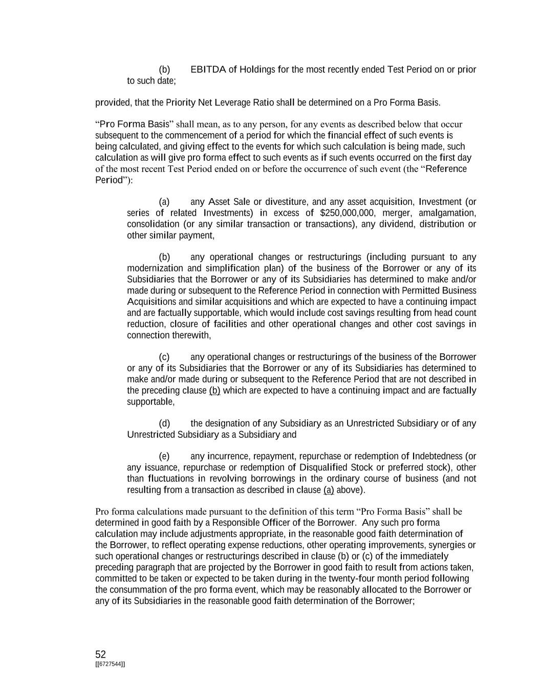 52 [[6727544]] (b) EBITDA of Holdings for the most recently ended Test Period on or prior to such date; provided, that the Priority Net Leverage Ratio shall be determined on a Pro Forma Basis. “Pro Forma Basis” shall mean, as to any person, for any events as described below that occur subsequent to the commencement of a period for which the financial effect of such events is being calculated, and giving effect to the events for which such calculation is being made, such calculation as will give pro forma effect to such events as if such events occurred on the first day of the most recent Test Period ended on or before the occurrence of such event (the “Reference Period”): (a) any Asset Sale or divestiture, and any asset acquisition, Investment (or series of related Investments) in excess of $250,000,000, merger, amalgamation, consolidation (or any similar transaction or transactions), any dividend, distribution or other similar payment, (b) any operational changes or restructurings (including pursuant to any modernization and simplification plan) of the business of the Borrower or any of its Subsidiaries that the Borrower or any of its Subsidiaries has determined to make and/or made during or subsequent to the Reference Period in connection with Permitted Business Acquisitions and similar acquisitions and which are expected to have a continuing impact and are factually supportable, which would include cost savings resulting from head count reduction, closure of facilities and other operational changes and other cost savings in connection therewith, (c) any operational changes or restructurings of the business of the Borrower or any of its Subsidiaries that the Borrower or any of its Subsidiaries has determined to make and/or made during or subsequent to the Reference Period that are not described in the preceding clause (b) which are expected to have a continuing impact and are factually supportable, (d) the designation of any Subsidiary as an Unrestricted Subsidiary or of any Unrestricted Subsidiary as a Subsidiary and (e) any incurrence, repayment, repurchase or redemption of Indebtedness (or any issuance, repurchase or redemption of Disqualified Stock or preferred stock), other than fluctuations in revolving borrowings in the ordinary course of business (and not resulting from a transaction as described in clause (a) above). Pro forma calculations made pursuant to the definition of this term “Pro Forma Basis” shall be determined in good faith by a Responsible Officer of the Borrower. Any such pro forma calculation may include adjustments appropriate, in the reasonable good faith determination of the Borrower, to reflect operating expense reductions, other operating improvements, synergies or such operational changes or restructurings described in clause (b) or (c) of the immediately preceding paragraph that are projected by the Borrower in good faith to result from actions taken, committed to be taken or expected to be taken during in the twenty-four month period following the consummation of the pro forma event, which may be reasonably allocated to the Borrower or any of its Subsidiaries in the reasonable good faith determination of the Borrower;