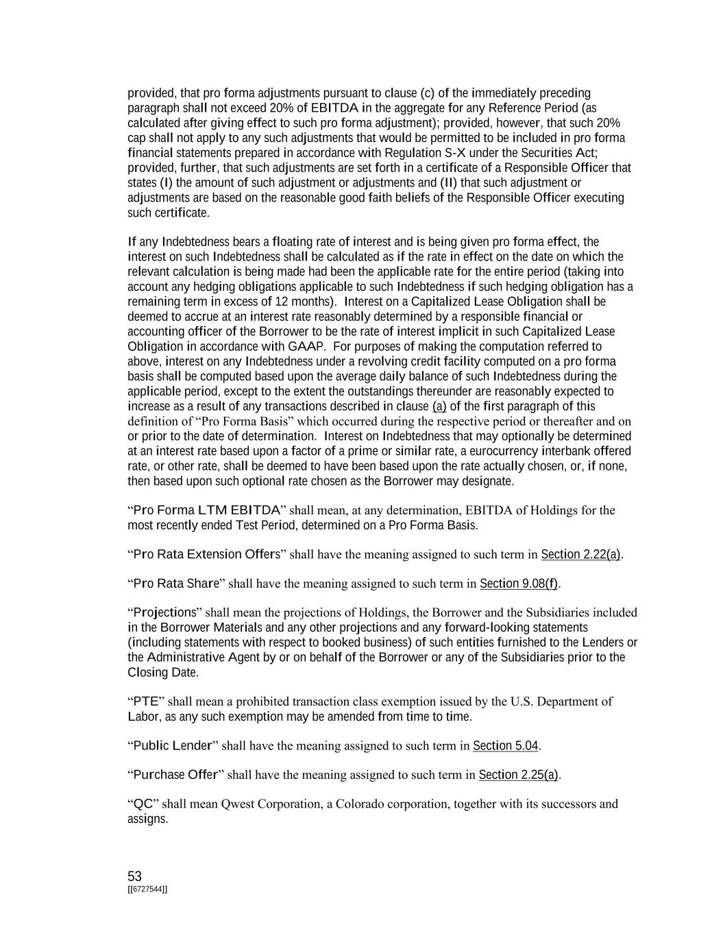 53 [[6727544]] provided, that pro forma adjustments pursuant to clause (c) of the immediately preceding paragraph shall not exceed 20% of EBITDA in the aggregate for any Reference Period (as calculated after giving effect to such pro forma adjustment); provided, however, that such 20% cap shall not apply to any such adjustments that would be permitted to be included in pro forma financial statements prepared in accordance with Regulation S-X under the Securities Act; provided, further, that such adjustments are set forth in a certificate of a Responsible Officer that states (I) the amount of such adjustment or adjustments and (II) that such adjustment or adjustments are based on the reasonable good faith beliefs of the Responsible Officer executing such certificate. If any Indebtedness bears a floating rate of interest and is being given pro forma effect, the interest on such Indebtedness shall be calculated as if the rate in effect on the date on which the relevant calculation is being made had been the applicable rate for the entire period (taking into account any hedging obligations applicable to such Indebtedness if such hedging obligation has a remaining term in excess of 12 months). Interest on a Capitalized Lease Obligation shall be deemed to accrue at an interest rate reasonably determined by a responsible financial or accounting officer of the Borrower to be the rate of interest implicit in such Capitalized Lease Obligation in accordance with GAAP. For purposes of making the computation referred to above, interest on any Indebtedness under a revolving credit facility computed on a pro forma basis shall be computed based upon the average daily balance of such Indebtedness during the applicable period, except to the extent the outstandings thereunder are reasonably expected to increase as a result of any transactions described in clause (a) of the first paragraph of this definition of “Pro Forma Basis” which occurred during the respective period or thereafter and on or prior to the date of determination. Interest on Indebtedness that may optionally be determined at an interest rate based upon a factor of a prime or similar rate, a eurocurrency interbank offered rate, or other rate, shall be deemed to have been based upon the rate actually chosen, or, if none, then based upon such optional rate chosen as the Borrower may designate. “Pro Forma LTM EBITDA” shall mean, at any determination, EBITDA of Holdings for the most recently ended Test Period, determined on a Pro Forma Basis. “Pro Rata Extension Offers” shall have the meaning assigned to such term in Section 2.22(a). “Pro Rata Share” shall have the meaning assigned to such term in Section 9.08(f). “Projections” shall mean the projections of Holdings, the Borrower and the Subsidiaries included in the Borrower Materials and any other projections and any forward-looking statements (including statements with respect to booked business) of such entities furnished to the Lenders or the Administrative Agent by or on behalf of the Borrower or any of the Subsidiaries prior to the Closing Date. “PTE” shall mean a prohibited transaction class exemption issued by the U.S. Department of Labor, as any such exemption may be amended from time to time. “Public Lender” shall have the meaning assigned to such term in Section 5.04. “Purchase Offer” shall have the meaning assigned to such term in Section 2.25(a). “QC” shall mean Qwest Corporation, a Colorado corporation, together with its successors and assigns.