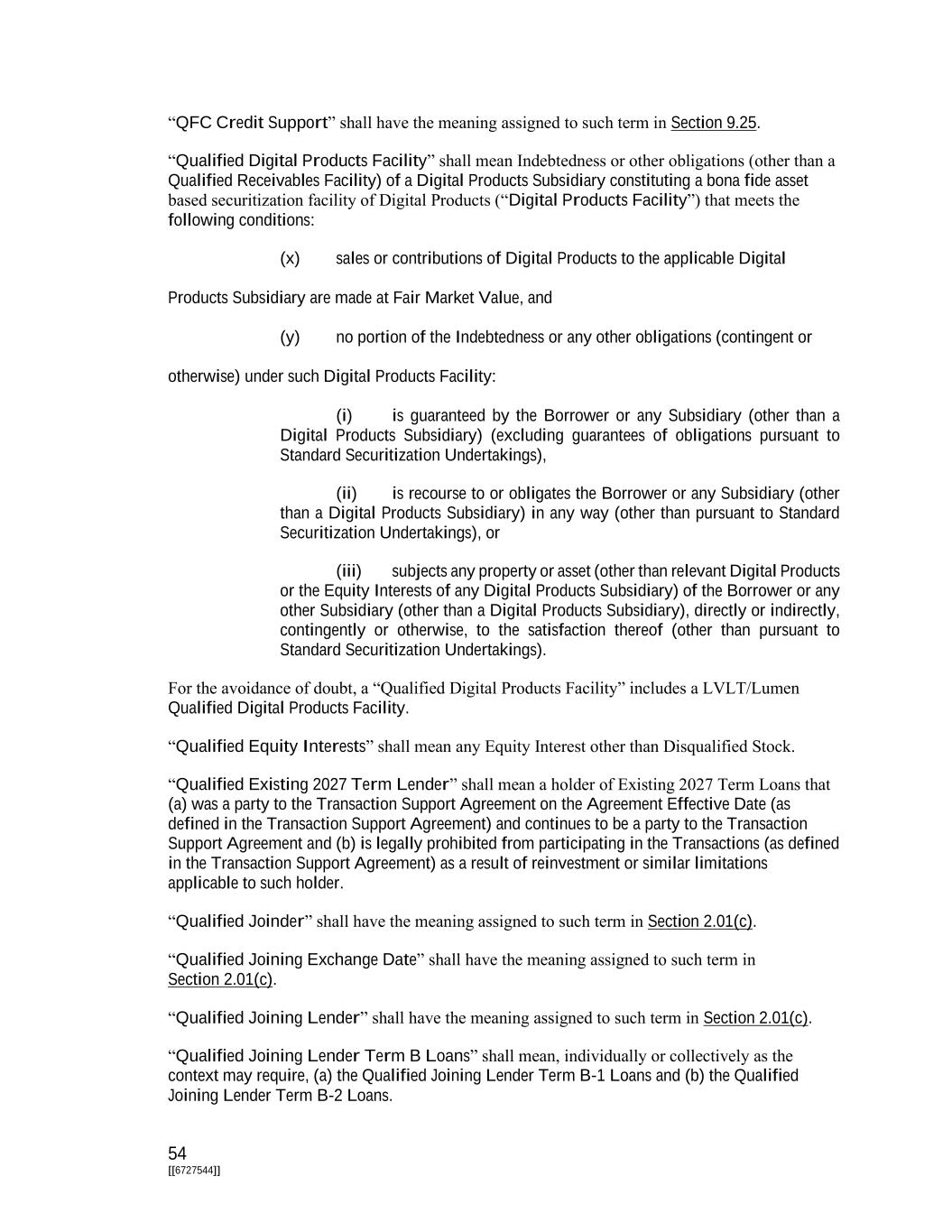 54 [[6727544]] “QFC Credit Support” shall have the meaning assigned to such term in Section 9.25. “Qualified Digital Products Facility” shall mean Indebtedness or other obligations (other than a Qualified Receivables Facility) of a Digital Products Subsidiary constituting a bona fide asset based securitization facility of Digital Products (“Digital Products Facility”) that meets the following conditions: (x) sales or contributions of Digital Products to the applicable Digital Products Subsidiary are made at Fair Market Value, and (y) no portion of the Indebtedness or any other obligations (contingent or otherwise) under such Digital Products Facility: (i) is guaranteed by the Borrower or any Subsidiary (other than a Digital Products Subsidiary) (excluding guarantees of obligations pursuant to Standard Securitization Undertakings), (ii) is recourse to or obligates the Borrower or any Subsidiary (other than a Digital Products Subsidiary) in any way (other than pursuant to Standard Securitization Undertakings), or (iii) subjects any property or asset (other than relevant Digital Products or the Equity Interests of any Digital Products Subsidiary) of the Borrower or any other Subsidiary (other than a Digital Products Subsidiary), directly or indirectly, contingently or otherwise, to the satisfaction thereof (other than pursuant to Standard Securitization Undertakings). For the avoidance of doubt, a “Qualified Digital Products Facility” includes a LVLT/Lumen Qualified Digital Products Facility. “Qualified Equity Interests” shall mean any Equity Interest other than Disqualified Stock. “Qualified Existing 2027 Term Lender” shall mean a holder of Existing 2027 Term Loans that (a) was a party to the Transaction Support Agreement on the Agreement Effective Date (as defined in the Transaction Support Agreement) and continues to be a party to the Transaction Support Agreement and (b) is legally prohibited from participating in the Transactions (as defined in the Transaction Support Agreement) as a result of reinvestment or similar limitations applicable to such holder. “Qualified Joinder” shall have the meaning assigned to such term in Section 2.01(c). “Qualified Joining Exchange Date” shall have the meaning assigned to such term in Section 2.01(c). “Qualified Joining Lender” shall have the meaning assigned to such term in Section 2.01(c). “Qualified Joining Lender Term B Loans” shall mean, individually or collectively as the context may require, (a) the Qualified Joining Lender Term B-1 Loans and (b) the Qualified Joining Lender Term B-2 Loans.