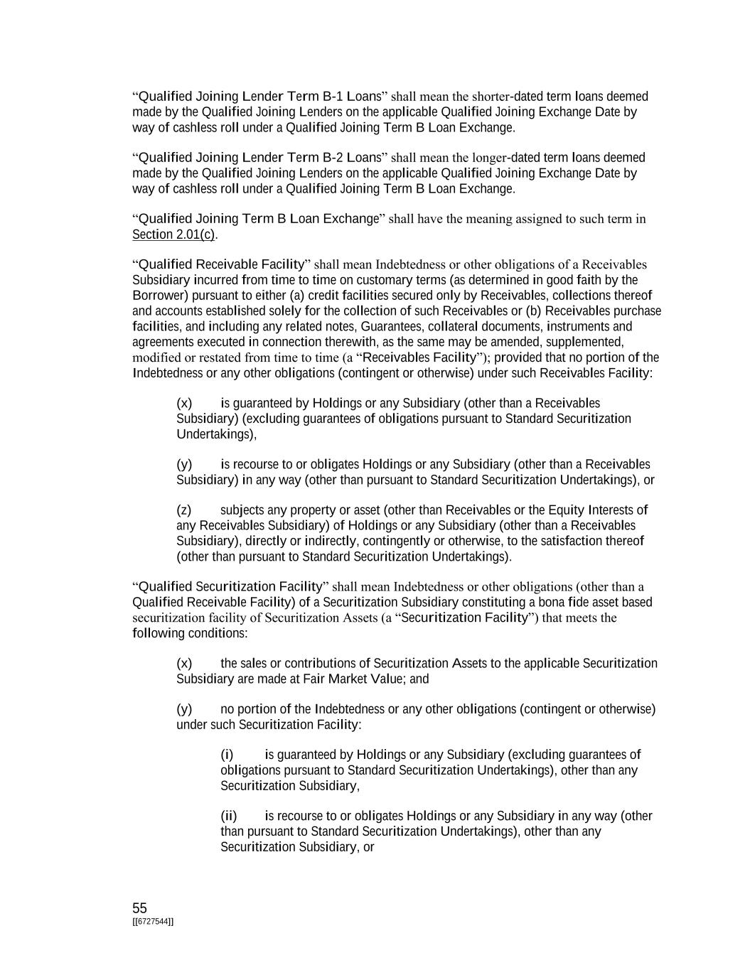 55 [[6727544]] “Qualified Joining Lender Term B-1 Loans” shall mean the shorter-dated term loans deemed made by the Qualified Joining Lenders on the applicable Qualified Joining Exchange Date by way of cashless roll under a Qualified Joining Term B Loan Exchange. “Qualified Joining Lender Term B-2 Loans” shall mean the longer-dated term loans deemed made by the Qualified Joining Lenders on the applicable Qualified Joining Exchange Date by way of cashless roll under a Qualified Joining Term B Loan Exchange. “Qualified Joining Term B Loan Exchange” shall have the meaning assigned to such term in Section 2.01(c). “Qualified Receivable Facility” shall mean Indebtedness or other obligations of a Receivables Subsidiary incurred from time to time on customary terms (as determined in good faith by the Borrower) pursuant to either (a) credit facilities secured only by Receivables, collections thereof and accounts established solely for the collection of such Receivables or (b) Receivables purchase facilities, and including any related notes, Guarantees, collateral documents, instruments and agreements executed in connection therewith, as the same may be amended, supplemented, modified or restated from time to time (a “Receivables Facility”); provided that no portion of the Indebtedness or any other obligations (contingent or otherwise) under such Receivables Facility: (x) is guaranteed by Holdings or any Subsidiary (other than a Receivables Subsidiary) (excluding guarantees of obligations pursuant to Standard Securitization Undertakings), (y) is recourse to or obligates Holdings or any Subsidiary (other than a Receivables Subsidiary) in any way (other than pursuant to Standard Securitization Undertakings), or (z) subjects any property or asset (other than Receivables or the Equity Interests of any Receivables Subsidiary) of Holdings or any Subsidiary (other than a Receivables Subsidiary), directly or indirectly, contingently or otherwise, to the satisfaction thereof (other than pursuant to Standard Securitization Undertakings). “Qualified Securitization Facility” shall mean Indebtedness or other obligations (other than a Qualified Receivable Facility) of a Securitization Subsidiary constituting a bona fide asset based securitization facility of Securitization Assets (a “Securitization Facility”) that meets the following conditions: (x) the sales or contributions of Securitization Assets to the applicable Securitization Subsidiary are made at Fair Market Value; and (y) no portion of the Indebtedness or any other obligations (contingent or otherwise) under such Securitization Facility: (i) is guaranteed by Holdings or any Subsidiary (excluding guarantees of obligations pursuant to Standard Securitization Undertakings), other than any Securitization Subsidiary, (ii) is recourse to or obligates Holdings or any Subsidiary in any way (other than pursuant to Standard Securitization Undertakings), other than any Securitization Subsidiary, or