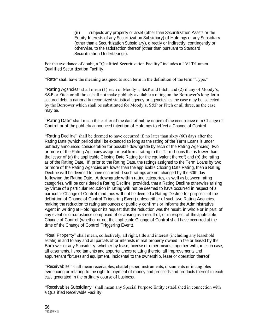 56 [[6727544]] (ii) subjects any property or asset (other than Securitization Assets or the Equity Interests of any Securitization Subsidiary) of Holdings or any Subsidiary (other than a Securitization Subsidiary), directly or indirectly, contingently or otherwise, to the satisfaction thereof (other than pursuant to Standard Securitization Undertakings). For the avoidance of doubt, a “Qualified Securitization Facility” includes a LVLT/Lumen Qualified Securitization Facility. “Rate” shall have the meaning assigned to such term in the definition of the term “Type.” “Rating Agencies” shall mean (1) each of Moody’s, S&P and Fitch, and (2) if any of Moody’s, S&P or Fitch or all three shall not make publicly available a rating on the Borrower’s long-term secured debt, a nationally recognized statistical agency or agencies, as the case may be, selected by the Borrower which shall be substituted for Moody’s, S&P or Fitch or all three, as the case may be. “Rating Date” shall mean the earlier of the date of public notice of the occurrence of a Change of Control or of the publicly announced intention of Holdings to effect a Change of Control. “Rating Decline” shall be deemed to have occurred if, no later than sixty (60) days after the Rating Date (which period shall be extended so long as the rating of the Term Loans is under publicly announced consideration for possible downgrade by each of the Rating Agencies), two or more of the Rating Agencies assign or reaffirm a rating to the Term Loans that is lower than the lesser of (a) the applicable Closing Date Rating (or the equivalent thereof) and (b) the rating as of the Rating Date. If, prior to the Rating Date, the ratings assigned to the Term Loans by two or more of the Rating Agencies are lower than the applicable Closing Date Rating, then a Rating Decline will be deemed to have occurred if such ratings are not changed by the 60th day following the Rating Date. A downgrade within rating categories, as well as between rating categories, will be considered a Rating Decline; provided, that a Rating Decline otherwise arising by virtue of a particular reduction in rating will not be deemed to have occurred in respect of a particular Change of Control (and thus will not be deemed a Rating Decline for purposes of the definition of Change of Control Triggering Event) unless either of such two Rating Agencies making the reduction to rating announces or publicly confirms or informs the Administrative Agent in writing at Holdings or its request that the reduction was the result, in whole or in part, of any event or circumstance comprised of or arising as a result of, or in respect of the applicable Change of Control (whether or not the applicable Change of Control shall have occurred at the time of the Change of Control Triggering Event). “Real Property” shall mean, collectively, all right, title and interest (including any leasehold estate) in and to any and all parcels of or interests in real property owned in fee or leased by the Borrower or any Subsidiary, whether by lease, license or other means, together with, in each case, all easements, hereditaments and appurtenances relating thereto, all improvements and appurtenant fixtures and equipment, incidental to the ownership, lease or operation thereof. “Receivables” shall mean receivables, chattel paper, instruments, documents or intangibles evidencing or relating to the right to payment of money and proceeds and products thereof in each case generated in the ordinary course of business. “Receivables Subsidiary” shall mean any Special Purpose Entity established in connection with a Qualified Receivable Facility.
