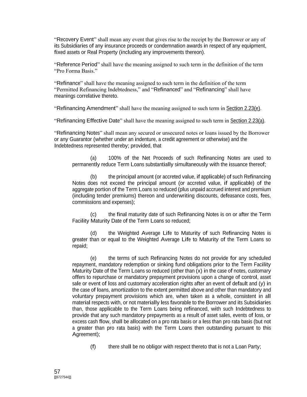 57 [[6727544]] “Recovery Event” shall mean any event that gives rise to the receipt by the Borrower or any of its Subsidiaries of any insurance proceeds or condemnation awards in respect of any equipment, fixed assets or Real Property (including any improvements thereon). “Reference Period” shall have the meaning assigned to such term in the definition of the term “Pro Forma Basis.” “Refinance” shall have the meaning assigned to such term in the definition of the term “Permitted Refinancing Indebtedness,” and “Refinanced” and “Refinancing” shall have meanings correlative thereto. “Refinancing Amendment” shall have the meaning assigned to such term in Section 2.23(e). “Refinancing Effective Date” shall have the meaning assigned to such term in Section 2.23(a). “Refinancing Notes” shall mean any secured or unsecured notes or loans issued by the Borrower or any Guarantor (whether under an indenture, a credit agreement or otherwise) and the Indebtedness represented thereby; provided, that (a) 100% of the Net Proceeds of such Refinancing Notes are used to permanently reduce Term Loans substantially simultaneously with the issuance thereof; (b) the principal amount (or accreted value, if applicable) of such Refinancing Notes does not exceed the principal amount (or accreted value, if applicable) of the aggregate portion of the Term Loans so reduced (plus unpaid accrued interest and premium (including tender premiums) thereon and underwriting discounts, defeasance costs, fees, commissions and expenses); (c) the final maturity date of such Refinancing Notes is on or after the Term Facility Maturity Date of the Term Loans so reduced; (d) the Weighted Average Life to Maturity of such Refinancing Notes is greater than or equal to the Weighted Average Life to Maturity of the Term Loans so repaid; (e) the terms of such Refinancing Notes do not provide for any scheduled repayment, mandatory redemption or sinking fund obligations prior to the Term Facility Maturity Date of the Term Loans so reduced (other than (x) in the case of notes, customary offers to repurchase or mandatory prepayment provisions upon a change of control, asset sale or event of loss and customary acceleration rights after an event of default and (y) in the case of loans, amortization to the extent permitted above and other than mandatory and voluntary prepayment provisions which are, when taken as a whole, consistent in all material respects with, or not materially less favorable to the Borrower and its Subsidiaries than, those applicable to the Term Loans being refinanced, with such Indebtedness to provide that any such mandatory prepayments as a result of asset sales, events of loss, or excess cash flow, shall be allocated on a pro rata basis or a less than pro rata basis (but not a greater than pro rata basis) with the Term Loans then outstanding pursuant to this Agreement); (f) there shall be no obligor with respect thereto that is not a Loan Party;