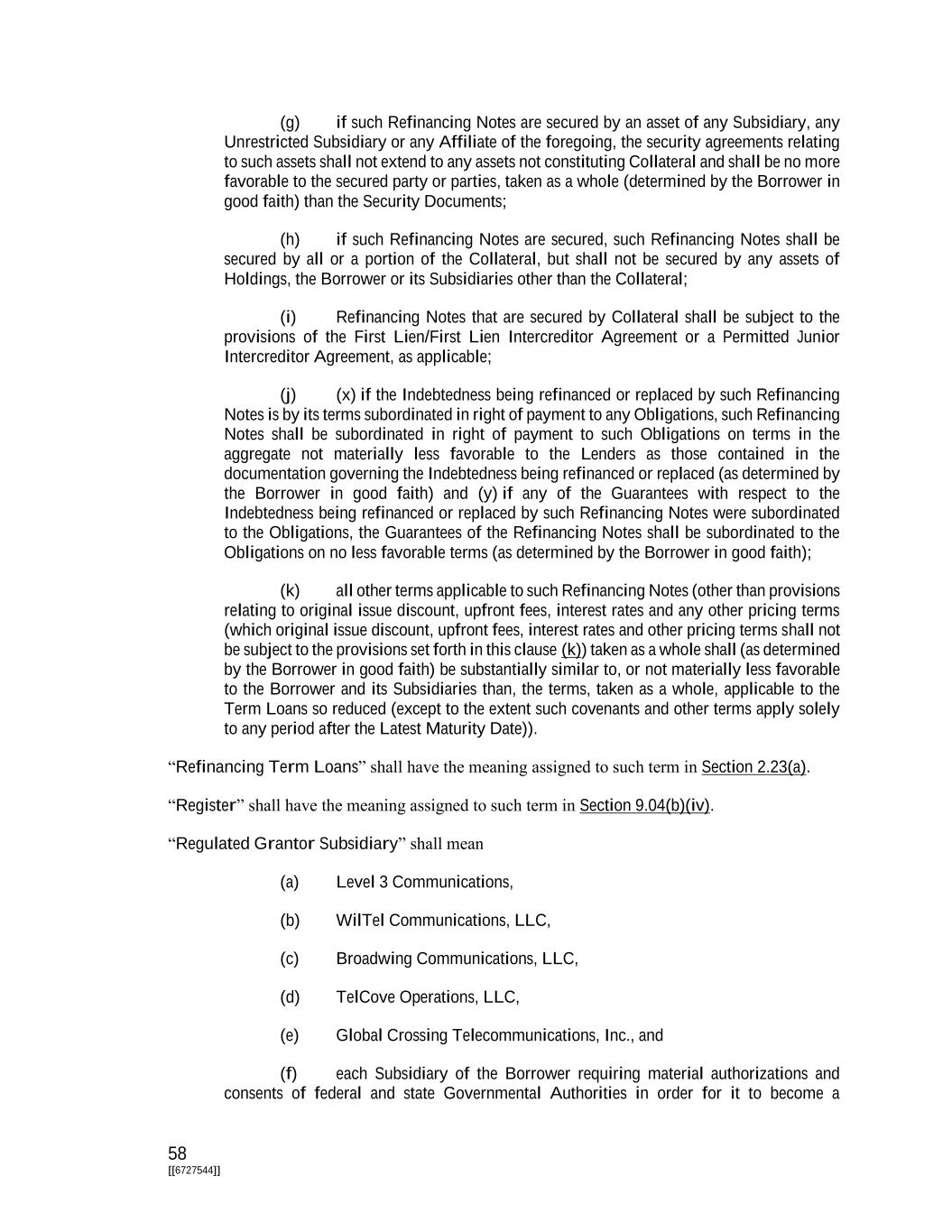 58 [[6727544]] (g) if such Refinancing Notes are secured by an asset of any Subsidiary, any Unrestricted Subsidiary or any Affiliate of the foregoing, the security agreements relating to such assets shall not extend to any assets not constituting Collateral and shall be no more favorable to the secured party or parties, taken as a whole (determined by the Borrower in good faith) than the Security Documents; (h) if such Refinancing Notes are secured, such Refinancing Notes shall be secured by all or a portion of the Collateral, but shall not be secured by any assets of Holdings, the Borrower or its Subsidiaries other than the Collateral; (i) Refinancing Notes that are secured by Collateral shall be subject to the provisions of the First Lien/First Lien Intercreditor Agreement or a Permitted Junior Intercreditor Agreement, as applicable; (j) (x) if the Indebtedness being refinanced or replaced by such Refinancing Notes is by its terms subordinated in right of payment to any Obligations, such Refinancing Notes shall be subordinated in right of payment to such Obligations on terms in the aggregate not materially less favorable to the Lenders as those contained in the documentation governing the Indebtedness being refinanced or replaced (as determined by the Borrower in good faith) and (y) if any of the Guarantees with respect to the Indebtedness being refinanced or replaced by such Refinancing Notes were subordinated to the Obligations, the Guarantees of the Refinancing Notes shall be subordinated to the Obligations on no less favorable terms (as determined by the Borrower in good faith); (k) all other terms applicable to such Refinancing Notes (other than provisions relating to original issue discount, upfront fees, interest rates and any other pricing terms (which original issue discount, upfront fees, interest rates and other pricing terms shall not be subject to the provisions set forth in this clause (k)) taken as a whole shall (as determined by the Borrower in good faith) be substantially similar to, or not materially less favorable to the Borrower and its Subsidiaries than, the terms, taken as a whole, applicable to the Term Loans so reduced (except to the extent such covenants and other terms apply solely to any period after the Latest Maturity Date)). “Refinancing Term Loans” shall have the meaning assigned to such term in Section 2.23(a). “Register” shall have the meaning assigned to such term in Section 9.04(b)(iv). “Regulated Grantor Subsidiary” shall mean (a) Level 3 Communications, (b) WilTel Communications, LLC, (c) Broadwing Communications, LLC, (d) TelCove Operations, LLC, (e) Global Crossing Telecommunications, Inc., and (f) each Subsidiary of the Borrower requiring material authorizations and consents of federal and state Governmental Authorities in order for it to become a