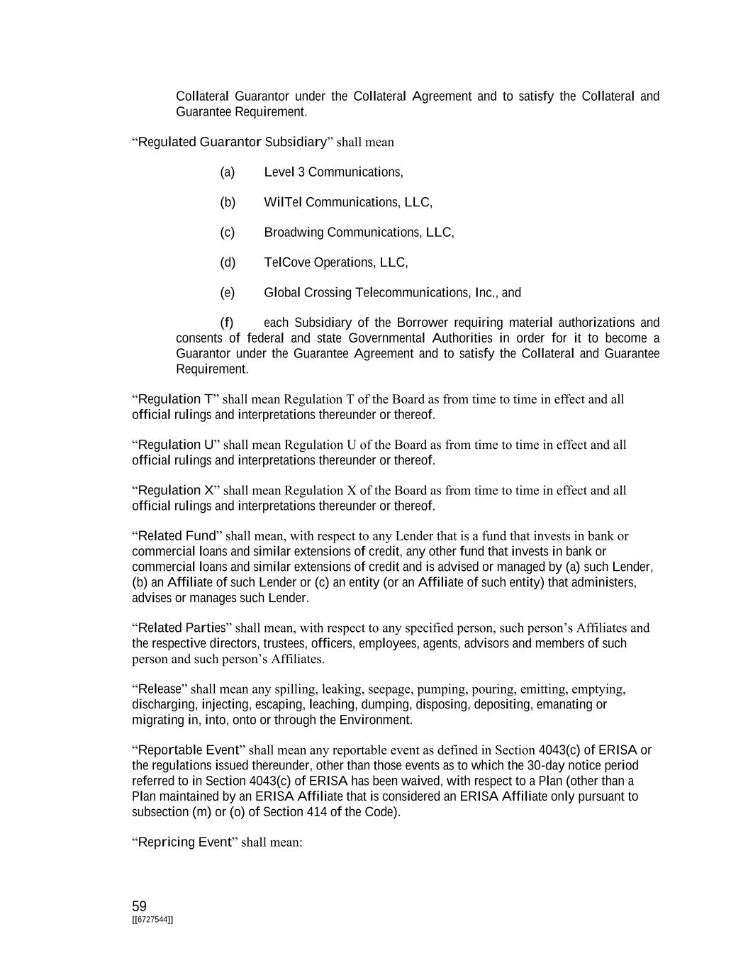 59 [[6727544]] Collateral Guarantor under the Collateral Agreement and to satisfy the Collateral and Guarantee Requirement. “Regulated Guarantor Subsidiary” shall mean (a) Level 3 Communications, (b) WilTel Communications, LLC, (c) Broadwing Communications, LLC, (d) TelCove Operations, LLC, (e) Global Crossing Telecommunications, Inc., and (f) each Subsidiary of the Borrower requiring material authorizations and consents of federal and state Governmental Authorities in order for it to become a Guarantor under the Guarantee Agreement and to satisfy the Collateral and Guarantee Requirement. “Regulation T” shall mean Regulation T of the Board as from time to time in effect and all official rulings and interpretations thereunder or thereof. “Regulation U” shall mean Regulation U of the Board as from time to time in effect and all official rulings and interpretations thereunder or thereof. “Regulation X” shall mean Regulation X of the Board as from time to time in effect and all official rulings and interpretations thereunder or thereof. “Related Fund” shall mean, with respect to any Lender that is a fund that invests in bank or commercial loans and similar extensions of credit, any other fund that invests in bank or commercial loans and similar extensions of credit and is advised or managed by (a) such Lender, (b) an Affiliate of such Lender or (c) an entity (or an Affiliate of such entity) that administers, advises or manages such Lender. “Related Parties” shall mean, with respect to any specified person, such person’s Affiliates and the respective directors, trustees, officers, employees, agents, advisors and members of such person and such person’s Affiliates. “Release” shall mean any spilling, leaking, seepage, pumping, pouring, emitting, emptying, discharging, injecting, escaping, leaching, dumping, disposing, depositing, emanating or migrating in, into, onto or through the Environment. “Reportable Event” shall mean any reportable event as defined in Section 4043(c) of ERISA or the regulations issued thereunder, other than those events as to which the 30-day notice period referred to in Section 4043(c) of ERISA has been waived, with respect to a Plan (other than a Plan maintained by an ERISA Affiliate that is considered an ERISA Affiliate only pursuant to subsection (m) or (o) of Section 414 of the Code). “Repricing Event” shall mean: