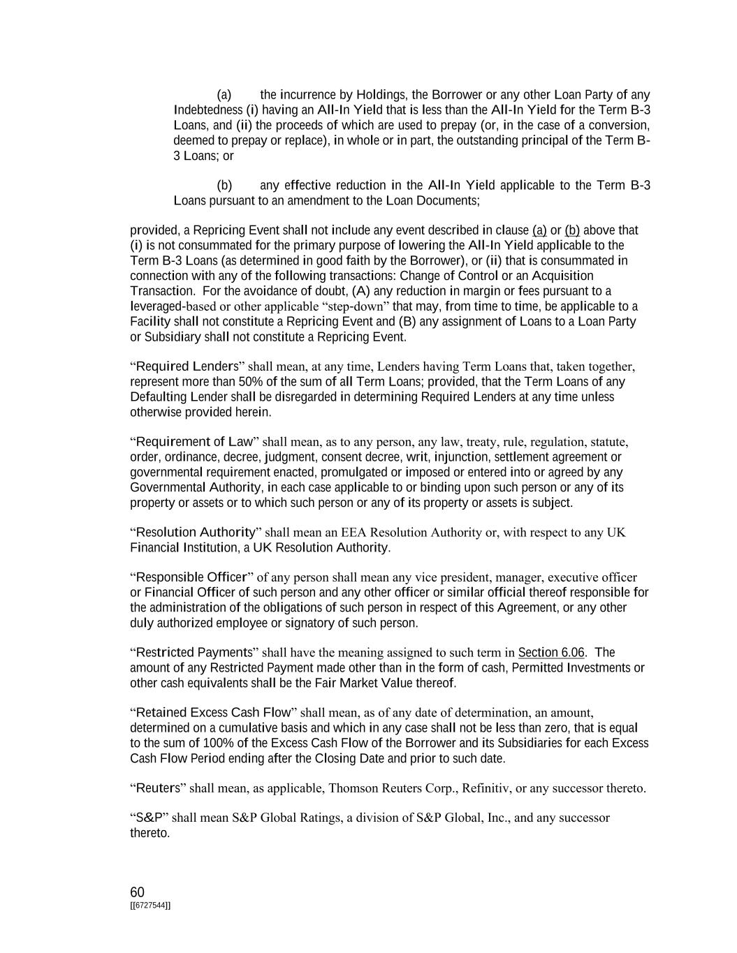 60 [[6727544]] (a) the incurrence by Holdings, the Borrower or any other Loan Party of any Indebtedness (i) having an All-In Yield that is less than the All-In Yield for the Term B-3 Loans, and (ii) the proceeds of which are used to prepay (or, in the case of a conversion, deemed to prepay or replace), in whole or in part, the outstanding principal of the Term B- 3 Loans; or (b) any effective reduction in the All-In Yield applicable to the Term B-3 Loans pursuant to an amendment to the Loan Documents; provided, a Repricing Event shall not include any event described in clause (a) or (b) above that (i) is not consummated for the primary purpose of lowering the All-In Yield applicable to the Term B-3 Loans (as determined in good faith by the Borrower), or (ii) that is consummated in connection with any of the following transactions: Change of Control or an Acquisition Transaction. For the avoidance of doubt, (A) any reduction in margin or fees pursuant to a leveraged-based or other applicable “step-down” that may, from time to time, be applicable to a Facility shall not constitute a Repricing Event and (B) any assignment of Loans to a Loan Party or Subsidiary shall not constitute a Repricing Event. “Required Lenders” shall mean, at any time, Lenders having Term Loans that, taken together, represent more than 50% of the sum of all Term Loans; provided, that the Term Loans of any Defaulting Lender shall be disregarded in determining Required Lenders at any time unless otherwise provided herein. “Requirement of Law” shall mean, as to any person, any law, treaty, rule, regulation, statute, order, ordinance, decree, judgment, consent decree, writ, injunction, settlement agreement or governmental requirement enacted, promulgated or imposed or entered into or agreed by any Governmental Authority, in each case applicable to or binding upon such person or any of its property or assets or to which such person or any of its property or assets is subject. “Resolution Authority” shall mean an EEA Resolution Authority or, with respect to any UK Financial Institution, a UK Resolution Authority. “Responsible Officer” of any person shall mean any vice president, manager, executive officer or Financial Officer of such person and any other officer or similar official thereof responsible for the administration of the obligations of such person in respect of this Agreement, or any other duly authorized employee or signatory of such person. “Restricted Payments” shall have the meaning assigned to such term in Section 6.06. The amount of any Restricted Payment made other than in the form of cash, Permitted Investments or other cash equivalents shall be the Fair Market Value thereof. “Retained Excess Cash Flow” shall mean, as of any date of determination, an amount, determined on a cumulative basis and which in any case shall not be less than zero, that is equal to the sum of 100% of the Excess Cash Flow of the Borrower and its Subsidiaries for each Excess Cash Flow Period ending after the Closing Date and prior to such date. “Reuters” shall mean, as applicable, Thomson Reuters Corp., Refinitiv, or any successor thereto. “S&P” shall mean S&P Global Ratings, a division of S&P Global, Inc., and any successor thereto.