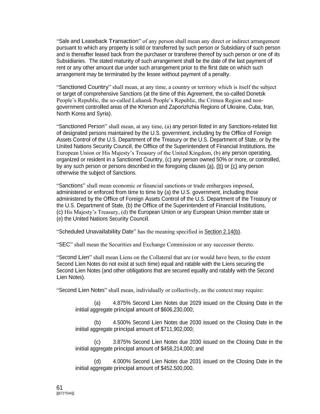 61 [[6727544]] “Sale and Leaseback Transaction” of any person shall mean any direct or indirect arrangement pursuant to which any property is sold or transferred by such person or Subsidiary of such person and is thereafter leased back from the purchaser or transferee thereof by such person or one of its Subsidiaries. The stated maturity of such arrangement shall be the date of the last payment of rent or any other amount due under such arrangement prior to the first date on which such arrangement may be terminated by the lessee without payment of a penalty. “Sanctioned Country” shall mean, at any time, a country or territory which is itself the subject or target of comprehensive Sanctions (at the time of this Agreement, the so-called Donetsk People’s Republic, the so-called Luhansk People’s Republic, the Crimea Region and non- government controlled areas of the Kherson and Zaporizhzhia Regions of Ukraine, Cuba, Iran, North Korea and Syria). “Sanctioned Person” shall mean, at any time, (a) any person listed in any Sanctions-related list of designated persons maintained by the U.S. government, including by the Office of Foreign Assets Control of the U.S. Department of the Treasury or the U.S. Department of State, or by the United Nations Security Council, the Office of the Superintendent of Financial Institutions, the European Union or His Majesty’s Treasury of the United Kingdom, (b) any person operating, organized or resident in a Sanctioned Country, (c) any person owned 50% or more, or controlled, by any such person or persons described in the foregoing clauses (a), (b) or (c) any person otherwise the subject of Sanctions. “Sanctions” shall mean economic or financial sanctions or trade embargoes imposed, administered or enforced from time to time by (a) the U.S. government, including those administered by the Office of Foreign Assets Control of the U.S. Department of the Treasury or the U.S. Department of State, (b) the Office of the Superintendent of Financial Institutions, (c) His Majesty’s Treasury, (d) the European Union or any European Union member state or (e) the United Nations Security Council. “Scheduled Unavailability Date” has the meaning specified in Section 2.14(b). “SEC” shall mean the Securities and Exchange Commission or any successor thereto. “Second Lien” shall mean Liens on the Collateral that are (or would have been, to the extent Second Lien Notes do not exist at such time) equal and ratable with the Liens securing the Second Lien Notes (and other obligations that are secured equally and ratably with the Second Lien Notes). “Second Lien Notes” shall mean, individually or collectively, as the context may require: (a) 4.875% Second Lien Notes due 2029 issued on the Closing Date in the initial aggregate principal amount of $606,230,000; (b) 4.500% Second Lien Notes due 2030 issued on the Closing Date in the initial aggregate principal amount of $711,902,000; (c) 3.875% Second Lien Notes due 2030 issued on the Closing Date in the initial aggregate principal amount of $458,214,000; and (d) 4.000% Second Lien Notes due 2031 issued on the Closing Date in the initial aggregate principal amount of $452,500,000.