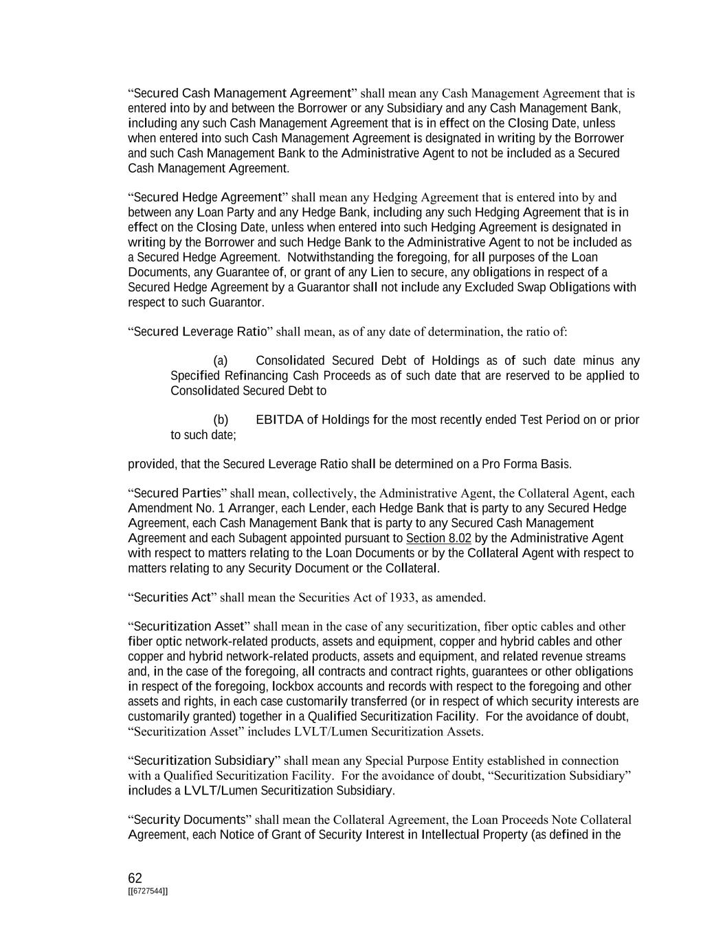 62 [[6727544]] “Secured Cash Management Agreement” shall mean any Cash Management Agreement that is entered into by and between the Borrower or any Subsidiary and any Cash Management Bank, including any such Cash Management Agreement that is in effect on the Closing Date, unless when entered into such Cash Management Agreement is designated in writing by the Borrower and such Cash Management Bank to the Administrative Agent to not be included as a Secured Cash Management Agreement. “Secured Hedge Agreement” shall mean any Hedging Agreement that is entered into by and between any Loan Party and any Hedge Bank, including any such Hedging Agreement that is in effect on the Closing Date, unless when entered into such Hedging Agreement is designated in writing by the Borrower and such Hedge Bank to the Administrative Agent to not be included as a Secured Hedge Agreement. Notwithstanding the foregoing, for all purposes of the Loan Documents, any Guarantee of, or grant of any Lien to secure, any obligations in respect of a Secured Hedge Agreement by a Guarantor shall not include any Excluded Swap Obligations with respect to such Guarantor. “Secured Leverage Ratio” shall mean, as of any date of determination, the ratio of: (a) Consolidated Secured Debt of Holdings as of such date minus any Specified Refinancing Cash Proceeds as of such date that are reserved to be applied to Consolidated Secured Debt to (b) EBITDA of Holdings for the most recently ended Test Period on or prior to such date; provided, that the Secured Leverage Ratio shall be determined on a Pro Forma Basis. “Secured Parties” shall mean, collectively, the Administrative Agent, the Collateral Agent, each Amendment No. 1 Arranger, each Lender, each Hedge Bank that is party to any Secured Hedge Agreement, each Cash Management Bank that is party to any Secured Cash Management Agreement and each Subagent appointed pursuant to Section 8.02 by the Administrative Agent with respect to matters relating to the Loan Documents or by the Collateral Agent with respect to matters relating to any Security Document or the Collateral. “Securities Act” shall mean the Securities Act of 1933, as amended. “Securitization Asset” shall mean in the case of any securitization, fiber optic cables and other fiber optic network-related products, assets and equipment, copper and hybrid cables and other copper and hybrid network-related products, assets and equipment, and related revenue streams and, in the case of the foregoing, all contracts and contract rights, guarantees or other obligations in respect of the foregoing, lockbox accounts and records with respect to the foregoing and other assets and rights, in each case customarily transferred (or in respect of which security interests are customarily granted) together in a Qualified Securitization Facility. For the avoidance of doubt, “Securitization Asset” includes LVLT/Lumen Securitization Assets. “Securitization Subsidiary” shall mean any Special Purpose Entity established in connection with a Qualified Securitization Facility. For the avoidance of doubt, “Securitization Subsidiary” includes a LVLT/Lumen Securitization Subsidiary. “Security Documents” shall mean the Collateral Agreement, the Loan Proceeds Note Collateral Agreement, each Notice of Grant of Security Interest in Intellectual Property (as defined in the