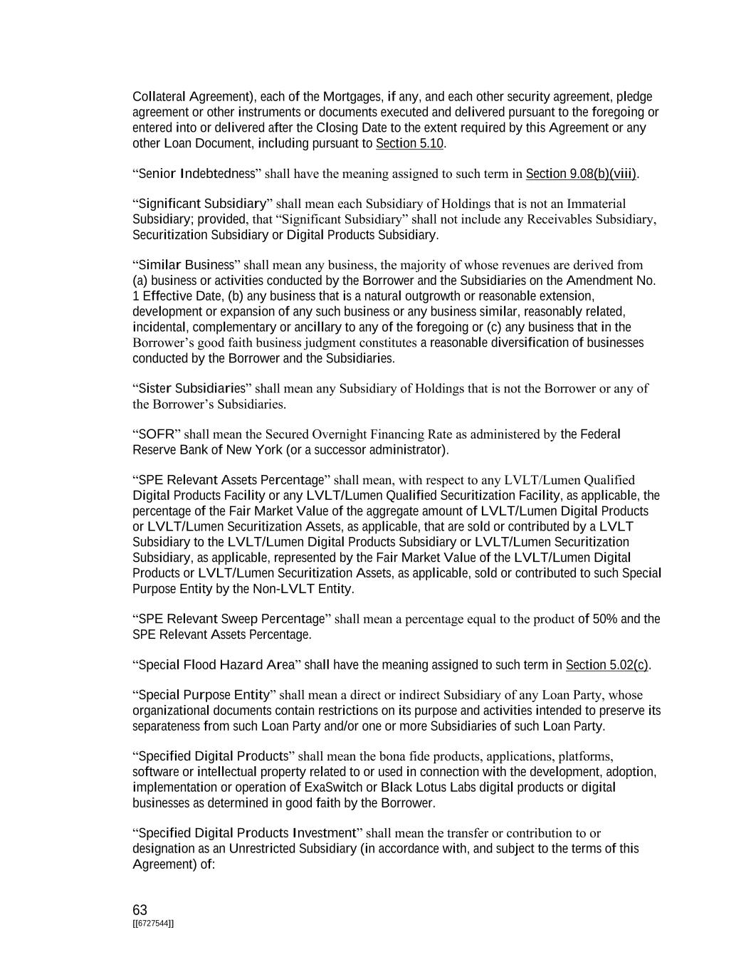 63 [[6727544]] Collateral Agreement), each of the Mortgages, if any, and each other security agreement, pledge agreement or other instruments or documents executed and delivered pursuant to the foregoing or entered into or delivered after the Closing Date to the extent required by this Agreement or any other Loan Document, including pursuant to Section 5.10. “Senior Indebtedness” shall have the meaning assigned to such term in Section 9.08(b)(viii). “Significant Subsidiary” shall mean each Subsidiary of Holdings that is not an Immaterial Subsidiary; provided, that “Significant Subsidiary” shall not include any Receivables Subsidiary, Securitization Subsidiary or Digital Products Subsidiary. “Similar Business” shall mean any business, the majority of whose revenues are derived from (a) business or activities conducted by the Borrower and the Subsidiaries on the Amendment No. 1 Effective Date, (b) any business that is a natural outgrowth or reasonable extension, development or expansion of any such business or any business similar, reasonably related, incidental, complementary or ancillary to any of the foregoing or (c) any business that in the Borrower’s good faith business judgment constitutes a reasonable diversification of businesses conducted by the Borrower and the Subsidiaries. “Sister Subsidiaries” shall mean any Subsidiary of Holdings that is not the Borrower or any of the Borrower’s Subsidiaries. “SOFR” shall mean the Secured Overnight Financing Rate as administered by the Federal Reserve Bank of New York (or a successor administrator). “SPE Relevant Assets Percentage” shall mean, with respect to any LVLT/Lumen Qualified Digital Products Facility or any LVLT/Lumen Qualified Securitization Facility, as applicable, the percentage of the Fair Market Value of the aggregate amount of LVLT/Lumen Digital Products or LVLT/Lumen Securitization Assets, as applicable, that are sold or contributed by a LVLT Subsidiary to the LVLT/Lumen Digital Products Subsidiary or LVLT/Lumen Securitization Subsidiary, as applicable, represented by the Fair Market Value of the LVLT/Lumen Digital Products or LVLT/Lumen Securitization Assets, as applicable, sold or contributed to such Special Purpose Entity by the Non-LVLT Entity. “SPE Relevant Sweep Percentage” shall mean a percentage equal to the product of 50% and the SPE Relevant Assets Percentage. “Special Flood Hazard Area” shall have the meaning assigned to such term in Section 5.02(c). “Special Purpose Entity” shall mean a direct or indirect Subsidiary of any Loan Party, whose organizational documents contain restrictions on its purpose and activities intended to preserve its separateness from such Loan Party and/or one or more Subsidiaries of such Loan Party. “Specified Digital Products” shall mean the bona fide products, applications, platforms, software or intellectual property related to or used in connection with the development, adoption, implementation or operation of ExaSwitch or Black Lotus Labs digital products or digital businesses as determined in good faith by the Borrower. “Specified Digital Products Investment” shall mean the transfer or contribution to or designation as an Unrestricted Subsidiary (in accordance with, and subject to the terms of this Agreement) of: