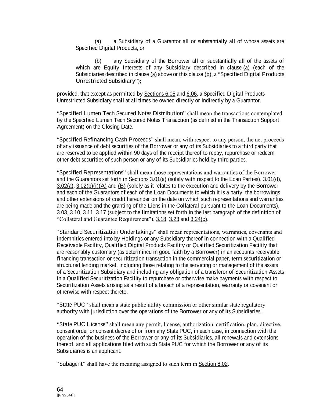 64 [[6727544]] (a) a Subsidiary of a Guarantor all or substantially all of whose assets are Specified Digital Products, or (b) any Subsidiary of the Borrower all or substantially all of the assets of which are Equity Interests of any Subsidiary described in clause (a) (each of the Subsidiaries described in clause (a) above or this clause (b), a “Specified Digital Products Unrestricted Subsidiary”); provided, that except as permitted by Sections 6.05 and 6.06, a Specified Digital Products Unrestricted Subsidiary shall at all times be owned directly or indirectly by a Guarantor. “Specified Lumen Tech Secured Notes Distribution” shall mean the transactions contemplated by the Specified Lumen Tech Secured Notes Transaction (as defined in the Transaction Support Agreement) on the Closing Date. “Specified Refinancing Cash Proceeds” shall mean, with respect to any person, the net proceeds of any issuance of debt securities of the Borrower or any of its Subsidiaries to a third party that are reserved to be applied within 90 days of the receipt thereof to repay, repurchase or redeem other debt securities of such person or any of its Subsidiaries held by third parties. “Specified Representations” shall mean those representations and warranties of the Borrower and the Guarantors set forth in Sections 3.01(a) (solely with respect to the Loan Parties), 3.01(d), 3.02(a), 3.02(b)(i)(A) and (B) (solely as it relates to the execution and delivery by the Borrower and each of the Guarantors of each of the Loan Documents to which it is a party, the borrowings and other extensions of credit hereunder on the date on which such representations and warranties are being made and the granting of the Liens in the Collateral pursuant to the Loan Documents), 3.03, 3.10, 3.11, 3.17 (subject to the limitations set forth in the last paragraph of the definition of “Collateral and Guarantee Requirement”), 3.18, 3.23 and 3.24(c). “Standard Securitization Undertakings” shall mean representations, warranties, covenants and indemnities entered into by Holdings or any Subsidiary thereof in connection with a Qualified Receivable Facility, Qualified Digital Products Facility or Qualified Securitization Facility that are reasonably customary (as determined in good faith by a Borrower) in an accounts receivable financing transaction or securitization transaction in the commercial paper, term securitization or structured lending market, including those relating to the servicing or management of the assets of a Securitization Subsidiary and including any obligation of a transferor of Securitization Assets in a Qualified Securitization Facility to repurchase or otherwise make payments with respect to Securitization Assets arising as a result of a breach of a representation, warranty or covenant or otherwise with respect thereto. “State PUC” shall mean a state public utility commission or other similar state regulatory authority with jurisdiction over the operations of the Borrower or any of its Subsidiaries. “State PUC License” shall mean any permit, license, authorization, certification, plan, directive, consent order or consent decree of or from any State PUC, in each case, in connection with the operation of the business of the Borrower or any of its Subsidiaries, all renewals and extensions thereof, and all applications filed with such State PUC for which the Borrower or any of its Subsidiaries is an applicant. “Subagent” shall have the meaning assigned to such term in Section 8.02.