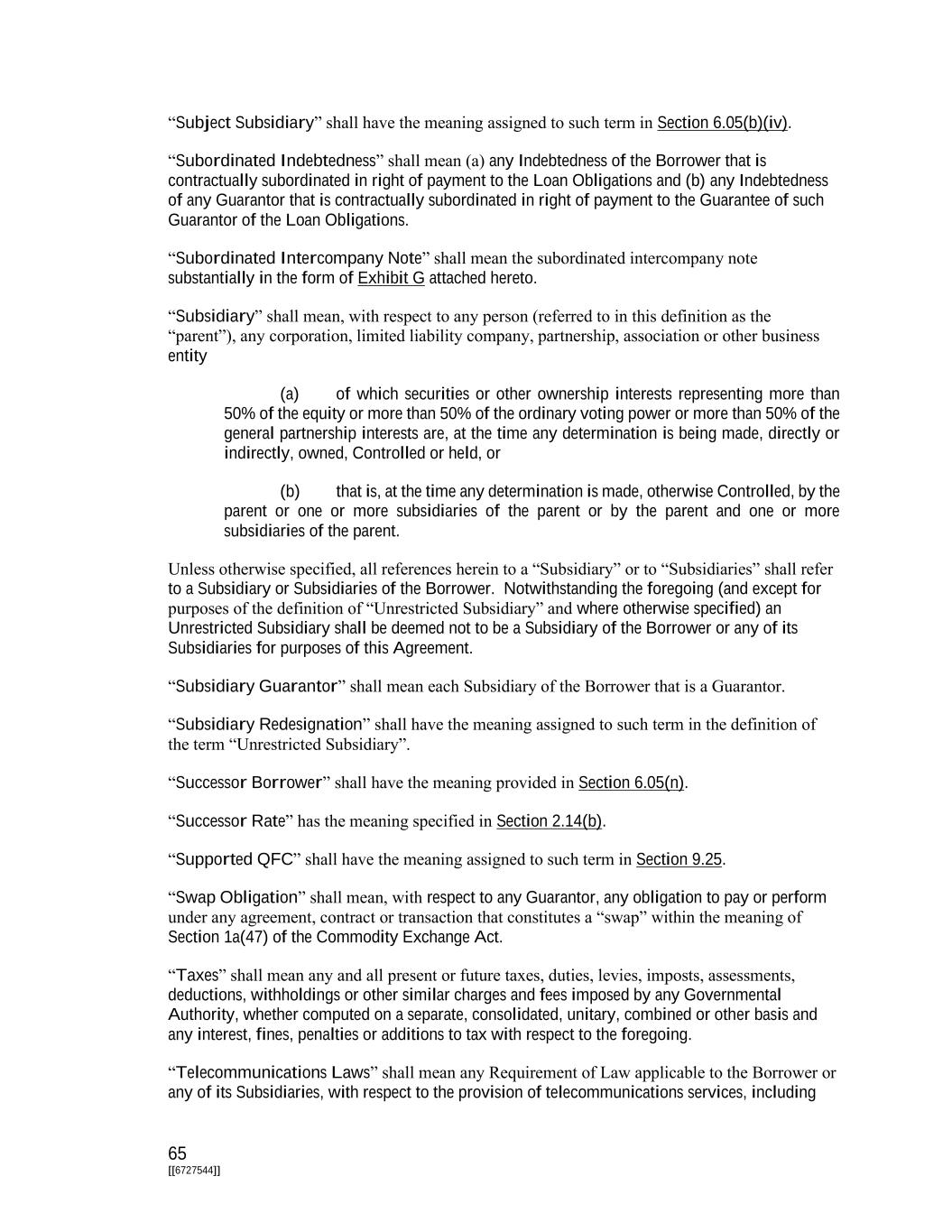 65 [[6727544]] “Subject Subsidiary” shall have the meaning assigned to such term in Section 6.05(b)(iv). “Subordinated Indebtedness” shall mean (a) any Indebtedness of the Borrower that is contractually subordinated in right of payment to the Loan Obligations and (b) any Indebtedness of any Guarantor that is contractually subordinated in right of payment to the Guarantee of such Guarantor of the Loan Obligations. “Subordinated Intercompany Note” shall mean the subordinated intercompany note substantially in the form of Exhibit G attached hereto. “Subsidiary” shall mean, with respect to any person (referred to in this definition as the “parent”), any corporation, limited liability company, partnership, association or other business entity (a) of which securities or other ownership interests representing more than 50% of the equity or more than 50% of the ordinary voting power or more than 50% of the general partnership interests are, at the time any determination is being made, directly or indirectly, owned, Controlled or held, or (b) that is, at the time any determination is made, otherwise Controlled, by the parent or one or more subsidiaries of the parent or by the parent and one or more subsidiaries of the parent. Unless otherwise specified, all references herein to a “Subsidiary” or to “Subsidiaries” shall refer to a Subsidiary or Subsidiaries of the Borrower. Notwithstanding the foregoing (and except for purposes of the definition of “Unrestricted Subsidiary” and where otherwise specified) an Unrestricted Subsidiary shall be deemed not to be a Subsidiary of the Borrower or any of its Subsidiaries for purposes of this Agreement. “Subsidiary Guarantor” shall mean each Subsidiary of the Borrower that is a Guarantor. “Subsidiary Redesignation” shall have the meaning assigned to such term in the definition of the term “Unrestricted Subsidiary”. “Successor Borrower” shall have the meaning provided in Section 6.05(n). “Successor Rate” has the meaning specified in Section 2.14(b). “Supported QFC” shall have the meaning assigned to such term in Section 9.25. “Swap Obligation” shall mean, with respect to any Guarantor, any obligation to pay or perform under any agreement, contract or transaction that constitutes a “swap” within the meaning of Section 1a(47) of the Commodity Exchange Act. “Taxes” shall mean any and all present or future taxes, duties, levies, imposts, assessments, deductions, withholdings or other similar charges and fees imposed by any Governmental Authority, whether computed on a separate, consolidated, unitary, combined or other basis and any interest, fines, penalties or additions to tax with respect to the foregoing. “Telecommunications Laws” shall mean any Requirement of Law applicable to the Borrower or any of its Subsidiaries, with respect to the provision of telecommunications services, including
