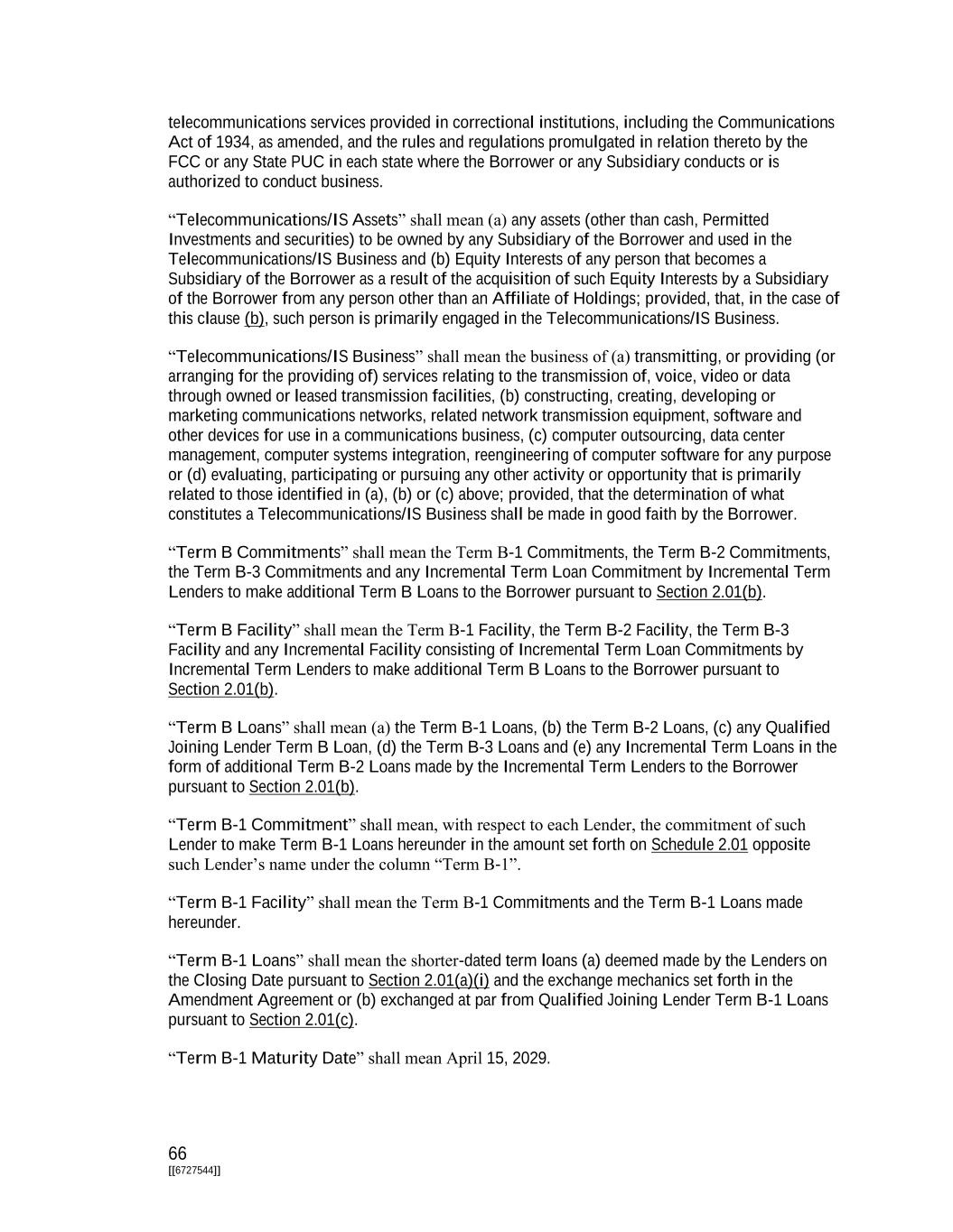 66 [[6727544]] telecommunications services provided in correctional institutions, including the Communications Act of 1934, as amended, and the rules and regulations promulgated in relation thereto by the FCC or any State PUC in each state where the Borrower or any Subsidiary conducts or is authorized to conduct business. “Telecommunications/IS Assets” shall mean (a) any assets (other than cash, Permitted Investments and securities) to be owned by any Subsidiary of the Borrower and used in the Telecommunications/IS Business and (b) Equity Interests of any person that becomes a Subsidiary of the Borrower as a result of the acquisition of such Equity Interests by a Subsidiary of the Borrower from any person other than an Affiliate of Holdings; provided, that, in the case of this clause (b), such person is primarily engaged in the Telecommunications/IS Business. “Telecommunications/IS Business” shall mean the business of (a) transmitting, or providing (or arranging for the providing of) services relating to the transmission of, voice, video or data through owned or leased transmission facilities, (b) constructing, creating, developing or marketing communications networks, related network transmission equipment, software and other devices for use in a communications business, (c) computer outsourcing, data center management, computer systems integration, reengineering of computer software for any purpose or (d) evaluating, participating or pursuing any other activity or opportunity that is primarily related to those identified in (a), (b) or (c) above; provided, that the determination of what constitutes a Telecommunications/IS Business shall be made in good faith by the Borrower. “Term B Commitments” shall mean the Term B-1 Commitments, the Term B-2 Commitments, the Term B-3 Commitments and any Incremental Term Loan Commitment by Incremental Term Lenders to make additional Term B Loans to the Borrower pursuant to Section 2.01(b). “Term B Facility” shall mean the Term B-1 Facility, the Term B-2 Facility, the Term B-3 Facility and any Incremental Facility consisting of Incremental Term Loan Commitments by Incremental Term Lenders to make additional Term B Loans to the Borrower pursuant to Section 2.01(b). “Term B Loans” shall mean (a) the Term B-1 Loans, (b) the Term B-2 Loans, (c) any Qualified Joining Lender Term B Loan, (d) the Term B-3 Loans and (e) any Incremental Term Loans in the form of additional Term B-2 Loans made by the Incremental Term Lenders to the Borrower pursuant to Section 2.01(b). “Term B-1 Commitment” shall mean, with respect to each Lender, the commitment of such Lender to make Term B-1 Loans hereunder in the amount set forth on Schedule 2.01 opposite such Lender’s name under the column “Term B-1”. “Term B-1 Facility” shall mean the Term B-1 Commitments and the Term B-1 Loans made hereunder. “Term B-1 Loans” shall mean the shorter-dated term loans (a) deemed made by the Lenders on the Closing Date pursuant to Section 2.01(a)(i) and the exchange mechanics set forth in the Amendment Agreement or (b) exchanged at par from Qualified Joining Lender Term B-1 Loans pursuant to Section 2.01(c). “Term B-1 Maturity Date” shall mean April 15, 2029.