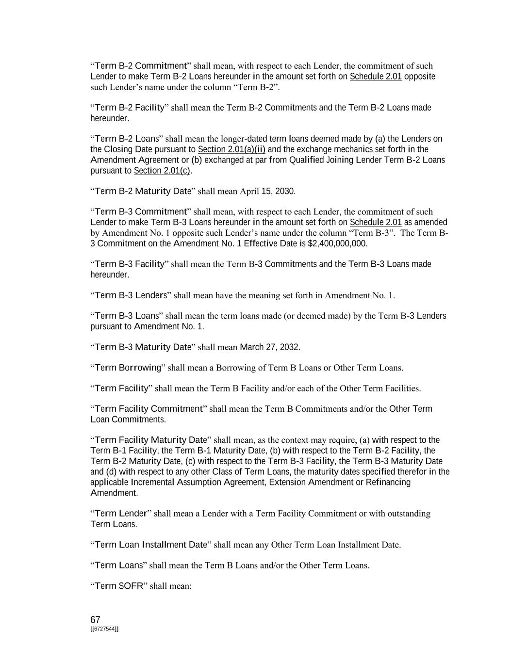 67 [[6727544]] “Term B-2 Commitment” shall mean, with respect to each Lender, the commitment of such Lender to make Term B-2 Loans hereunder in the amount set forth on Schedule 2.01 opposite such Lender’s name under the column “Term B-2”. “Term B-2 Facility” shall mean the Term B-2 Commitments and the Term B-2 Loans made hereunder. “Term B-2 Loans” shall mean the longer-dated term loans deemed made by (a) the Lenders on the Closing Date pursuant to Section 2.01(a)(ii) and the exchange mechanics set forth in the Amendment Agreement or (b) exchanged at par from Qualified Joining Lender Term B-2 Loans pursuant to Section 2.01(c). “Term B-2 Maturity Date” shall mean April 15, 2030. “Term B-3 Commitment” shall mean, with respect to each Lender, the commitment of such Lender to make Term B-3 Loans hereunder in the amount set forth on Schedule 2.01 as amended by Amendment No. 1 opposite such Lender’s name under the column “Term B-3”. The Term B- 3 Commitment on the Amendment No. 1 Effective Date is $2,400,000,000. “Term B-3 Facility” shall mean the Term B-3 Commitments and the Term B-3 Loans made hereunder. “Term B-3 Lenders” shall mean have the meaning set forth in Amendment No. 1. “Term B-3 Loans” shall mean the term loans made (or deemed made) by the Term B-3 Lenders pursuant to Amendment No. 1. “Term B-3 Maturity Date” shall mean March 27, 2032. “Term Borrowing” shall mean a Borrowing of Term B Loans or Other Term Loans. “Term Facility” shall mean the Term B Facility and/or each of the Other Term Facilities. “Term Facility Commitment” shall mean the Term B Commitments and/or the Other Term Loan Commitments. “Term Facility Maturity Date” shall mean, as the context may require, (a) with respect to the Term B-1 Facility, the Term B-1 Maturity Date, (b) with respect to the Term B-2 Facility, the Term B-2 Maturity Date, (c) with respect to the Term B-3 Facility, the Term B-3 Maturity Date and (d) with respect to any other Class of Term Loans, the maturity dates specified therefor in the applicable Incremental Assumption Agreement, Extension Amendment or Refinancing Amendment. “Term Lender” shall mean a Lender with a Term Facility Commitment or with outstanding Term Loans. “Term Loan Installment Date” shall mean any Other Term Loan Installment Date. “Term Loans” shall mean the Term B Loans and/or the Other Term Loans. “Term SOFR” shall mean: