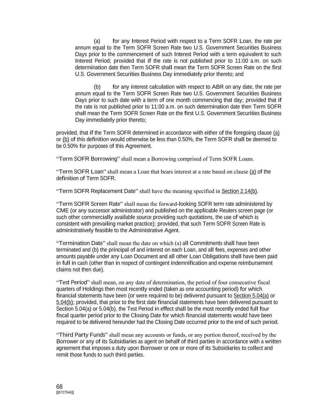 68 [[6727544]] (a) for any Interest Period with respect to a Term SOFR Loan, the rate per annum equal to the Term SOFR Screen Rate two U.S. Government Securities Business Days prior to the commencement of such Interest Period with a term equivalent to such Interest Period; provided that if the rate is not published prior to 11:00 a.m. on such determination date then Term SOFR shall mean the Term SOFR Screen Rate on the first U.S. Government Securities Business Day immediately prior thereto; and (b) for any interest calculation with respect to ABR on any date, the rate per annum equal to the Term SOFR Screen Rate two U.S. Government Securities Business Days prior to such date with a term of one month commencing that day; provided that if the rate is not published prior to 11:00 a.m. on such determination date then Term SOFR shall mean the Term SOFR Screen Rate on the first U.S. Government Securities Business Day immediately prior thereto; provided, that if the Term SOFR determined in accordance with either of the foregoing clause (a) or (b) of this definition would otherwise be less than 0.50%, the Term SOFR shall be deemed to be 0.50% for purposes of this Agreement. “Term SOFR Borrowing” shall mean a Borrowing comprised of Term SOFR Loans. “Term SOFR Loan” shall mean a Loan that bears interest at a rate based on clause (a) of the definition of Term SOFR. “Term SOFR Replacement Date” shall have the meaning specified in Section 2.14(b). “Term SOFR Screen Rate” shall mean the forward-looking SOFR term rate administered by CME (or any successor administrator) and published on the applicable Reuters screen page (or such other commercially available source providing such quotations, the use of which is consistent with prevailing market practice); provided, that such Term SOFR Screen Rate is administratively feasible to the Administrative Agent. “Termination Date” shall mean the date on which (a) all Commitments shall have been terminated and (b) the principal of and interest on each Loan, and all fees, expenses and other amounts payable under any Loan Document and all other Loan Obligations shall have been paid in full in cash (other than in respect of contingent indemnification and expense reimbursement claims not then due). “Test Period” shall mean, on any date of determination, the period of four consecutive fiscal quarters of Holdings then most recently ended (taken as one accounting period) for which financial statements have been (or were required to be) delivered pursuant to Section 5.04(a) or 5.04(b); provided, that prior to the first date financial statements have been delivered pursuant to Section 5.04(a) or 5.04(b), the Test Period in effect shall be the most recently ended full four fiscal quarter period prior to the Closing Date for which financial statements would have been required to be delivered hereunder had the Closing Date occurred prior to the end of such period. “Third Party Funds” shall mean any accounts or funds, or any portion thereof, received by the Borrower or any of its Subsidiaries as agent on behalf of third parties in accordance with a written agreement that imposes a duty upon Borrower or one or more of its Subsidiaries to collect and remit those funds to such third parties.