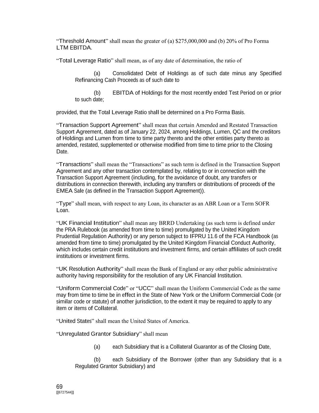 69 [[6727544]] “Threshold Amount” shall mean the greater of (a) $275,000,000 and (b) 20% of Pro Forma LTM EBITDA. “Total Leverage Ratio” shall mean, as of any date of determination, the ratio of (a) Consolidated Debt of Holdings as of such date minus any Specified Refinancing Cash Proceeds as of such date to (b) EBITDA of Holdings for the most recently ended Test Period on or prior to such date; provided, that the Total Leverage Ratio shall be determined on a Pro Forma Basis. “Transaction Support Agreement” shall mean that certain Amended and Restated Transaction Support Agreement, dated as of January 22, 2024, among Holdings, Lumen, QC and the creditors of Holdings and Lumen from time to time party thereto and the other entities party thereto as amended, restated, supplemented or otherwise modified from time to time prior to the Closing Date. “Transactions” shall mean the “Transactions” as such term is defined in the Transaction Support Agreement and any other transaction contemplated by, relating to or in connection with the Transaction Support Agreement (including, for the avoidance of doubt, any transfers or distributions in connection therewith, including any transfers or distributions of proceeds of the EMEA Sale (as defined in the Transaction Support Agreement)). “Type” shall mean, with respect to any Loan, its character as an ABR Loan or a Term SOFR Loan. “UK Financial Institution” shall mean any BRRD Undertaking (as such term is defined under the PRA Rulebook (as amended from time to time) promulgated by the United Kingdom Prudential Regulation Authority) or any person subject to IFPRU 11.6 of the FCA Handbook (as amended from time to time) promulgated by the United Kingdom Financial Conduct Authority, which includes certain credit institutions and investment firms, and certain affiliates of such credit institutions or investment firms. “UK Resolution Authority” shall mean the Bank of England or any other public administrative authority having responsibility for the resolution of any UK Financial Institution. “Uniform Commercial Code” or “UCC” shall mean the Uniform Commercial Code as the same may from time to time be in effect in the State of New York or the Uniform Commercial Code (or similar code or statute) of another jurisdiction, to the extent it may be required to apply to any item or items of Collateral. “United States” shall mean the United States of America. “Unregulated Grantor Subsidiary” shall mean (a) each Subsidiary that is a Collateral Guarantor as of the Closing Date, (b) each Subsidiary of the Borrower (other than any Subsidiary that is a Regulated Grantor Subsidiary) and