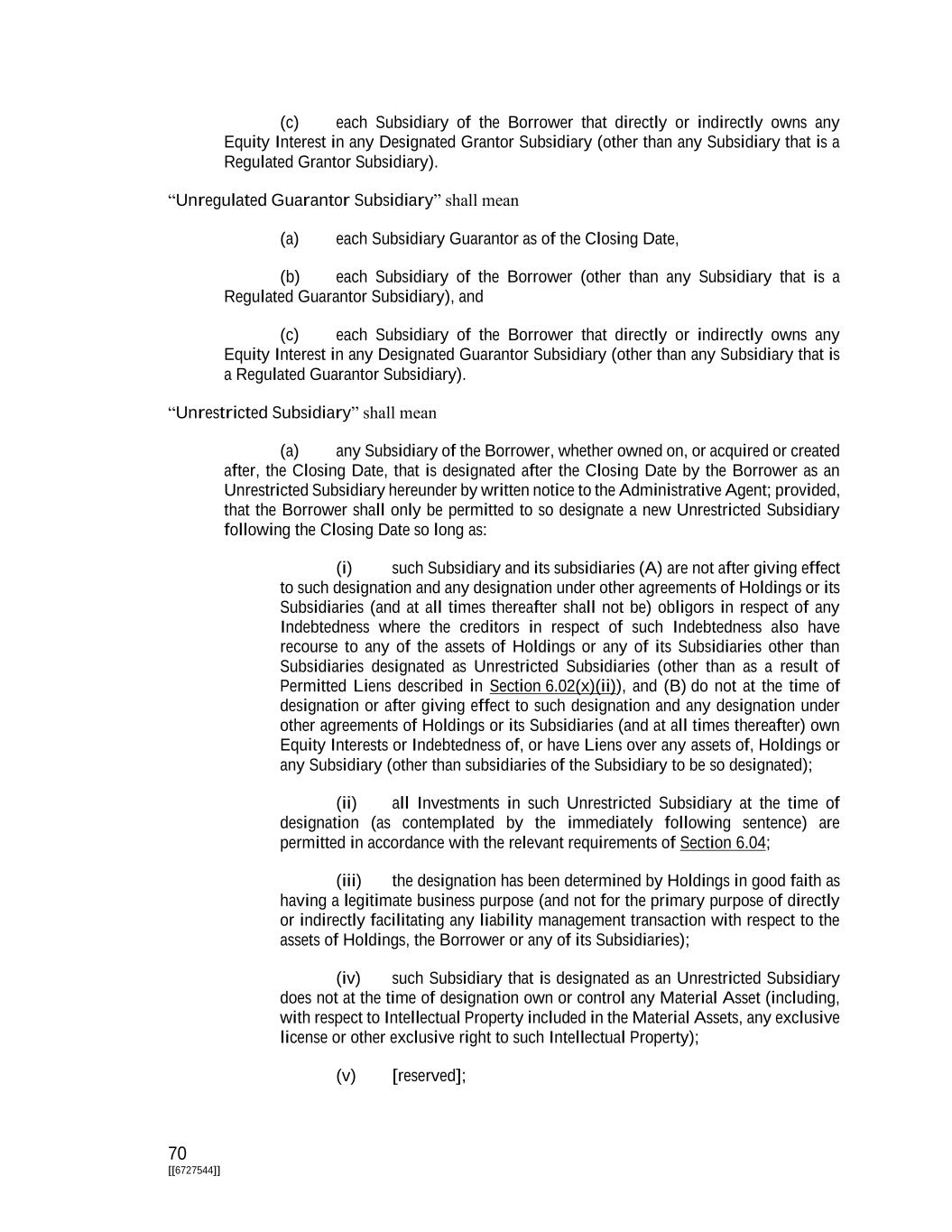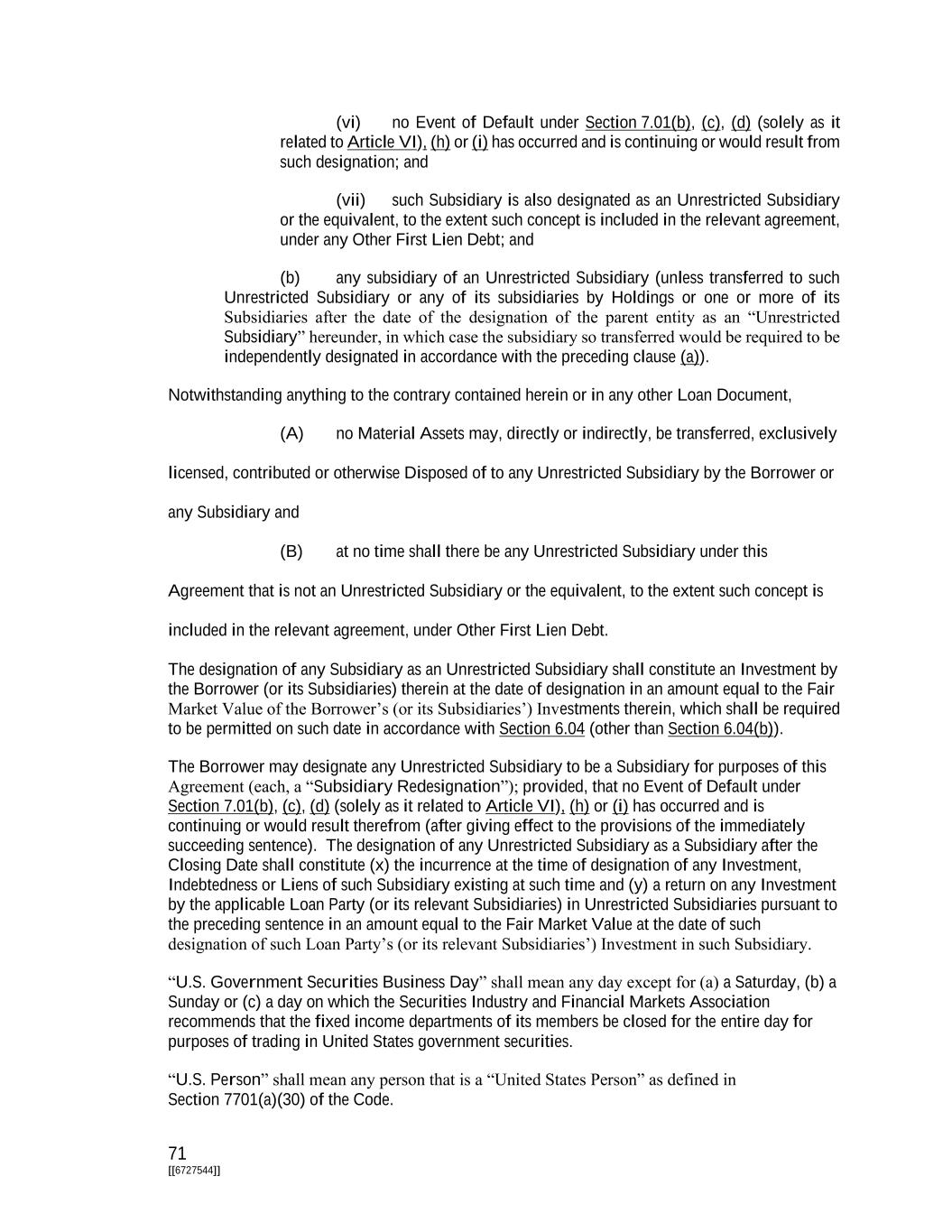 71 [[6727544]] (vi) no Event of Default under Section 7.01(b), (c), (d) (solely as it related to Article VI), (h) or (i) has occurred and is continuing or would result from such designation; and (vii) such Subsidiary is also designated as an Unrestricted Subsidiary or the equivalent, to the extent such concept is included in the relevant agreement, under any Other First Lien Debt; and (b) any subsidiary of an Unrestricted Subsidiary (unless transferred to such Unrestricted Subsidiary or any of its subsidiaries by Holdings or one or more of its Subsidiaries after the date of the designation of the parent entity as an “Unrestricted Subsidiary” hereunder, in which case the subsidiary so transferred would be required to be independently designated in accordance with the preceding clause (a)). Notwithstanding anything to the contrary contained herein or in any other Loan Document, (A) no Material Assets may, directly or indirectly, be transferred, exclusively licensed, contributed or otherwise Disposed of to any Unrestricted Subsidiary by the Borrower or any Subsidiary and (B) at no time shall there be any Unrestricted Subsidiary under this Agreement that is not an Unrestricted Subsidiary or the equivalent, to the extent such concept is included in the relevant agreement, under Other First Lien Debt. The designation of any Subsidiary as an Unrestricted Subsidiary shall constitute an Investment by the Borrower (or its Subsidiaries) therein at the date of designation in an amount equal to the Fair Market Value of the Borrower’s (or its Subsidiaries’) Investments therein, which shall be required to be permitted on such date in accordance with Section 6.04 (other than Section 6.04(b)). The Borrower may designate any Unrestricted Subsidiary to be a Subsidiary for purposes of this Agreement (each, a “Subsidiary Redesignation”); provided, that no Event of Default under Section 7.01(b), (c), (d) (solely as it related to Article VI), (h) or (i) has occurred and is continuing or would result therefrom (after giving effect to the provisions of the immediately succeeding sentence). The designation of any Unrestricted Subsidiary as a Subsidiary after the Closing Date shall constitute (x) the incurrence at the time of designation of any Investment, Indebtedness or Liens of such Subsidiary existing at such time and (y) a return on any Investment by the applicable Loan Party (or its relevant Subsidiaries) in Unrestricted Subsidiaries pursuant to the preceding sentence in an amount equal to the Fair Market Value at the date of such designation of such Loan Party’s (or its relevant Subsidiaries’) Investment in such Subsidiary. “U.S. Government Securities Business Day” shall mean any day except for (a) a Saturday, (b) a Sunday or (c) a day on which the Securities Industry and Financial Markets Association recommends that the fixed income departments of its members be closed for the entire day for purposes of trading in United States government securities. “U.S. Person” shall mean any person that is a “United States Person” as defined in Section 7701(a)(30) of the Code.