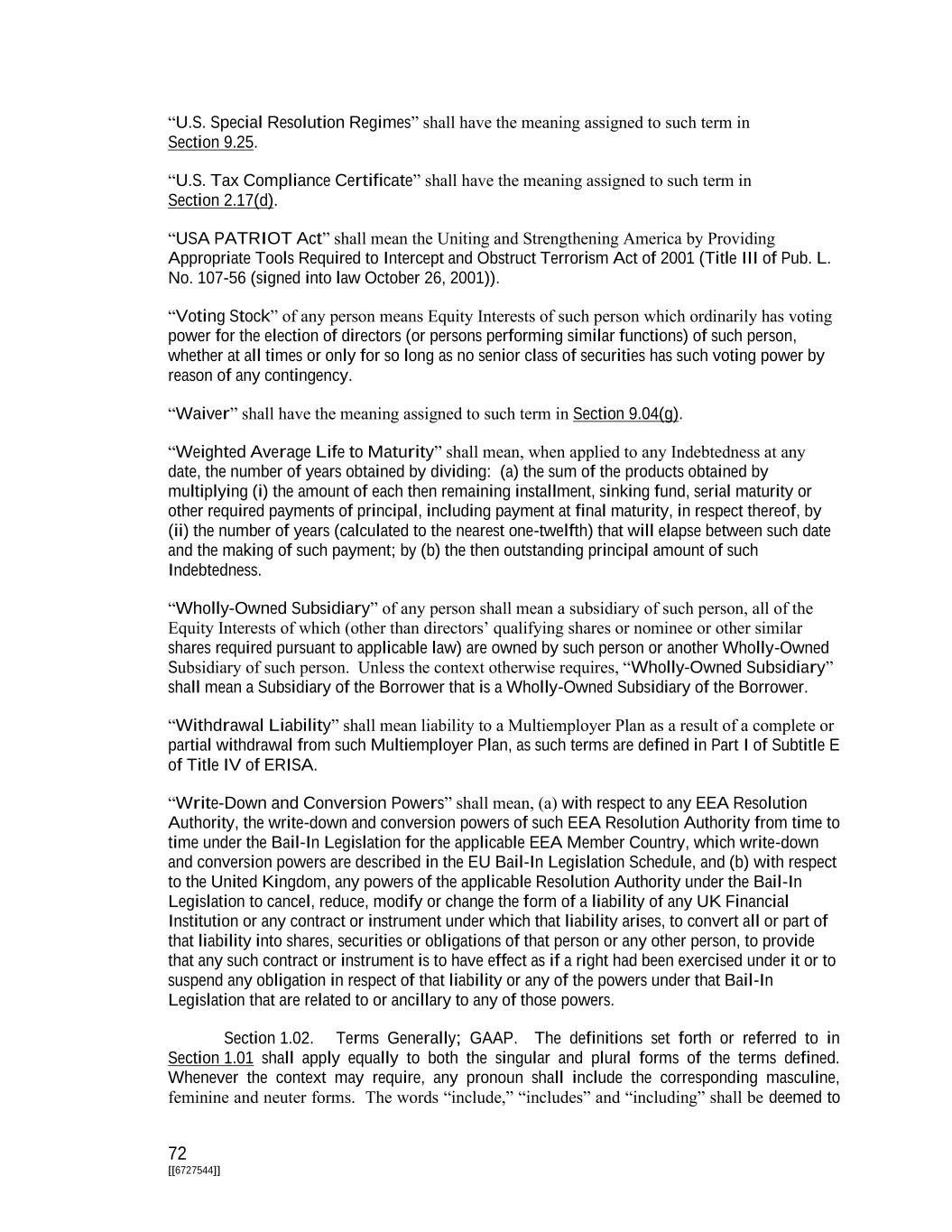 72 [[6727544]] “U.S. Special Resolution Regimes” shall have the meaning assigned to such term in Section 9.25. “U.S. Tax Compliance Certificate” shall have the meaning assigned to such term in Section 2.17(d). “USA PATRIOT Act” shall mean the Uniting and Strengthening America by Providing Appropriate Tools Required to Intercept and Obstruct Terrorism Act of 2001 (Title III of Pub. L. No. 107-56 (signed into law October 26, 2001)). “Voting Stock” of any person means Equity Interests of such person which ordinarily has voting power for the election of directors (or persons performing similar functions) of such person, whether at all times or only for so long as no senior class of securities has such voting power by reason of any contingency. “Waiver” shall have the meaning assigned to such term in Section 9.04(g). “Weighted Average Life to Maturity” shall mean, when applied to any Indebtedness at any date, the number of years obtained by dividing: (a) the sum of the products obtained by multiplying (i) the amount of each then remaining installment, sinking fund, serial maturity or other required payments of principal, including payment at final maturity, in respect thereof, by (ii) the number of years (calculated to the nearest one-twelfth) that will elapse between such date and the making of such payment; by (b) the then outstanding principal amount of such Indebtedness. “Wholly-Owned Subsidiary” of any person shall mean a subsidiary of such person, all of the Equity Interests of which (other than directors’ qualifying shares or nominee or other similar shares required pursuant to applicable law) are owned by such person or another Wholly-Owned Subsidiary of such person. Unless the context otherwise requires, “Wholly-Owned Subsidiary” shall mean a Subsidiary of the Borrower that is a Wholly-Owned Subsidiary of the Borrower. “Withdrawal Liability” shall mean liability to a Multiemployer Plan as a result of a complete or partial withdrawal from such Multiemployer Plan, as such terms are defined in Part I of Subtitle E of Title IV of ERISA. “Write-Down and Conversion Powers” shall mean, (a) with respect to any EEA Resolution Authority, the write-down and conversion powers of such EEA Resolution Authority from time to time under the Bail-In Legislation for the applicable EEA Member Country, which write-down and conversion powers are described in the EU Bail-In Legislation Schedule, and (b) with respect to the United Kingdom, any powers of the applicable Resolution Authority under the Bail-In Legislation to cancel, reduce, modify or change the form of a liability of any UK Financial Institution or any contract or instrument under which that liability arises, to convert all or part of that liability into shares, securities or obligations of that person or any other person, to provide that any such contract or instrument is to have effect as if a right had been exercised under it or to suspend any obligation in respect of that liability or any of the powers under that Bail-In Legislation that are related to or ancillary to any of those powers. Section 1.02. Terms Generally; GAAP. The definitions set forth or referred to in Section 1.01 shall apply equally to both the singular and plural forms of the terms defined. Whenever the context may require, any pronoun shall include the corresponding masculine, feminine and neuter forms. The words “include,” “includes” and “including” shall be deemed to