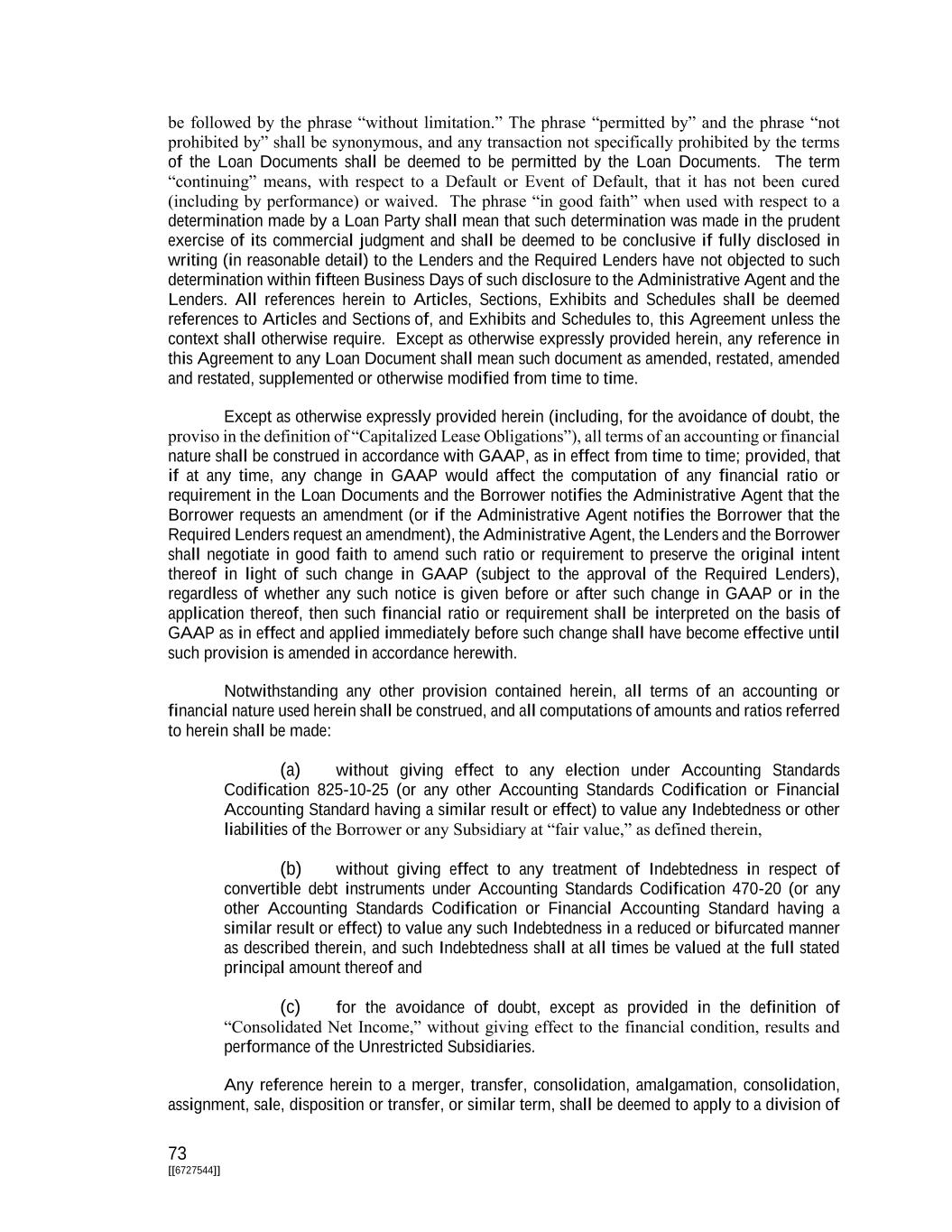 73 [[6727544]] be followed by the phrase “without limitation.” The phrase “permitted by” and the phrase “not prohibited by” shall be synonymous, and any transaction not specifically prohibited by the terms of the Loan Documents shall be deemed to be permitted by the Loan Documents. The term “continuing” means, with respect to a Default or Event of Default, that it has not been cured (including by performance) or waived. The phrase “in good faith” when used with respect to a determination made by a Loan Party shall mean that such determination was made in the prudent exercise of its commercial judgment and shall be deemed to be conclusive if fully disclosed in writing (in reasonable detail) to the Lenders and the Required Lenders have not objected to such determination within fifteen Business Days of such disclosure to the Administrative Agent and the Lenders. All references herein to Articles, Sections, Exhibits and Schedules shall be deemed references to Articles and Sections of, and Exhibits and Schedules to, this Agreement unless the context shall otherwise require. Except as otherwise expressly provided herein, any reference in this Agreement to any Loan Document shall mean such document as amended, restated, amended and restated, supplemented or otherwise modified from time to time. Except as otherwise expressly provided herein (including, for the avoidance of doubt, the proviso in the definition of “Capitalized Lease Obligations”), all terms of an accounting or financial nature shall be construed in accordance with GAAP, as in effect from time to time; provided, that if at any time, any change in GAAP would affect the computation of any financial ratio or requirement in the Loan Documents and the Borrower notifies the Administrative Agent that the Borrower requests an amendment (or if the Administrative Agent notifies the Borrower that the Required Lenders request an amendment), the Administrative Agent, the Lenders and the Borrower shall negotiate in good faith to amend such ratio or requirement to preserve the original intent thereof in light of such change in GAAP (subject to the approval of the Required Lenders), regardless of whether any such notice is given before or after such change in GAAP or in the application thereof, then such financial ratio or requirement shall be interpreted on the basis of GAAP as in effect and applied immediately before such change shall have become effective until such provision is amended in accordance herewith. Notwithstanding any other provision contained herein, all terms of an accounting or financial nature used herein shall be construed, and all computations of amounts and ratios referred to herein shall be made: (a) without giving effect to any election under Accounting Standards Codification 825-10-25 (or any other Accounting Standards Codification or Financial Accounting Standard having a similar result or effect) to value any Indebtedness or other liabilities of the Borrower or any Subsidiary at “fair value,” as defined therein, (b) without giving effect to any treatment of Indebtedness in respect of convertible debt instruments under Accounting Standards Codification 470-20 (or any other Accounting Standards Codification or Financial Accounting Standard having a similar result or effect) to value any such Indebtedness in a reduced or bifurcated manner as described therein, and such Indebtedness shall at all times be valued at the full stated principal amount thereof and (c) for the avoidance of doubt, except as provided in the definition of “Consolidated Net Income,” without giving effect to the financial condition, results and performance of the Unrestricted Subsidiaries. Any reference herein to a merger, transfer, consolidation, amalgamation, consolidation, assignment, sale, disposition or transfer, or similar term, shall be deemed to apply to a division of