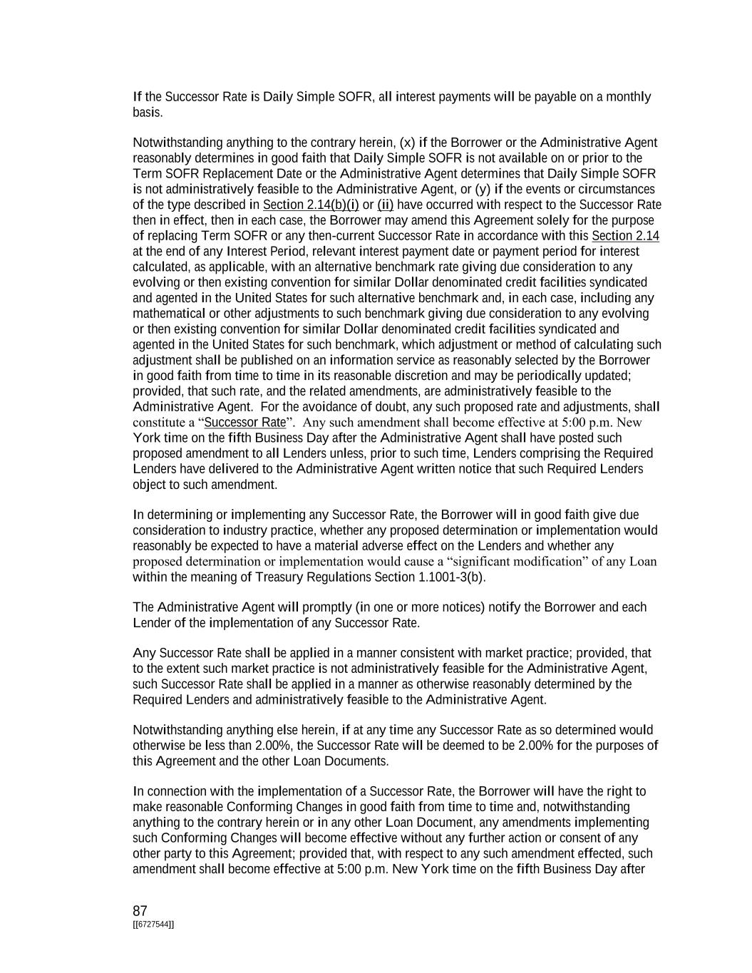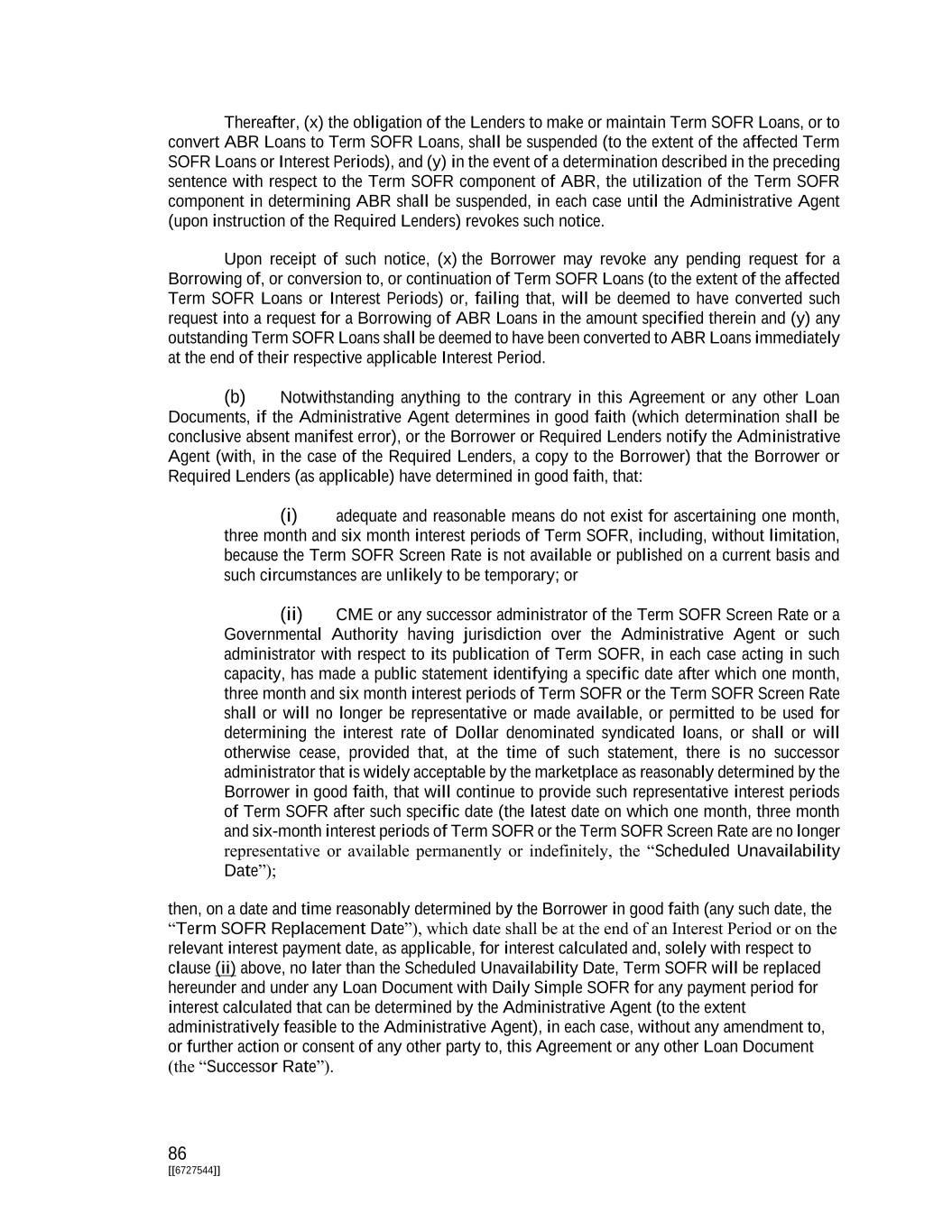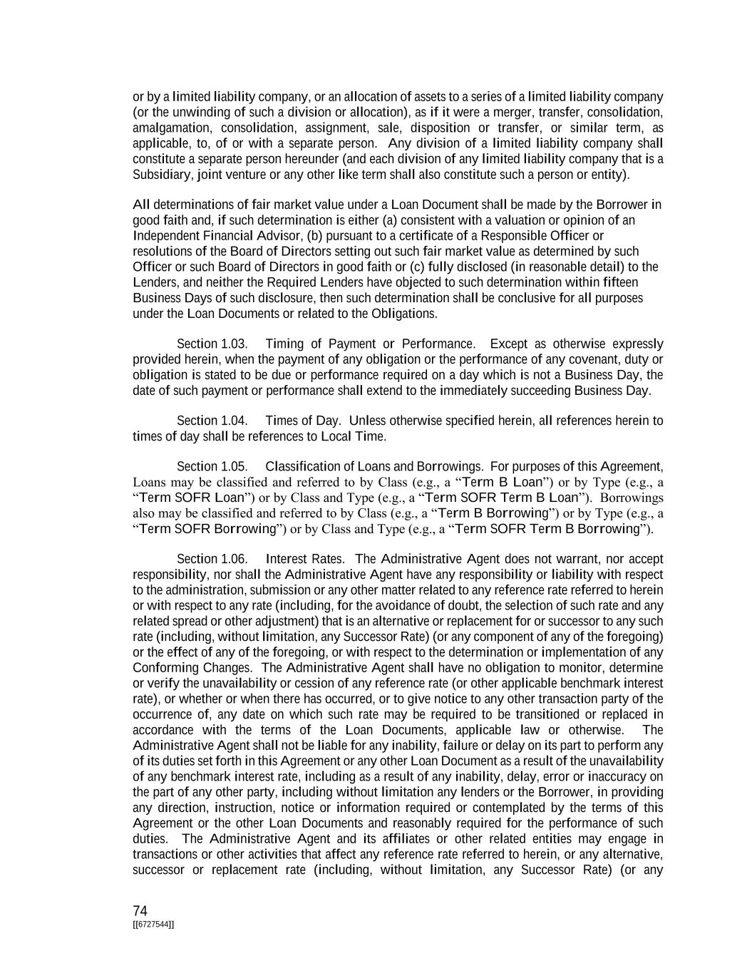 74 [[6727544]] or by a limited liability company, or an allocation of assets to a series of a limited liability company (or the unwinding of such a division or allocation), as if it were a merger, transfer, consolidation, amalgamation, consolidation, assignment, sale, disposition or transfer, or similar term, as applicable, to, of or with a separate person. Any division of a limited liability company shall constitute a separate person hereunder (and each division of any limited liability company that is a Subsidiary, joint venture or any other like term shall also constitute such a person or entity). All determinations of fair market value under a Loan Document shall be made by the Borrower in good faith and, if such determination is either (a) consistent with a valuation or opinion of an Independent Financial Advisor, (b) pursuant to a certificate of a Responsible Officer or resolutions of the Board of Directors setting out such fair market value as determined by such Officer or such Board of Directors in good faith or (c) fully disclosed (in reasonable detail) to the Lenders, and neither the Required Lenders have objected to such determination within fifteen Business Days of such disclosure, then such determination shall be conclusive for all purposes under the Loan Documents or related to the Obligations. Section 1.03. Timing of Payment or Performance. Except as otherwise expressly provided herein, when the payment of any obligation or the performance of any covenant, duty or obligation is stated to be due or performance required on a day which is not a Business Day, the date of such payment or performance shall extend to the immediately succeeding Business Day. Section 1.04. Times of Day. Unless otherwise specified herein, all references herein to times of day shall be references to Local Time. Section 1.05. Classification of Loans and Borrowings. For purposes of this Agreement, Loans may be classified and referred to by Class (e.g., a “Term B Loan”) or by Type (e.g., a “Term SOFR Loan”) or by Class and Type (e.g., a “Term SOFR Term B Loan”). Borrowings also may be classified and referred to by Class (e.g., a “Term B Borrowing”) or by Type (e.g., a “Term SOFR Borrowing”) or by Class and Type (e.g., a “Term SOFR Term B Borrowing”). Section 1.06. Interest Rates. The Administrative Agent does not warrant, nor accept responsibility, nor shall the Administrative Agent have any responsibility or liability with respect to the administration, submission or any other matter related to any reference rate referred to herein or with respect to any rate (including, for the avoidance of doubt, the selection of such rate and any related spread or other adjustment) that is an alternative or replacement for or successor to any such rate (including, without limitation, any Successor Rate) (or any component of any of the foregoing) or the effect of any of the foregoing, or with respect to the determination or implementation of any Conforming Changes. The Administrative Agent shall have no obligation to monitor, determine or verify the unavailability or cession of any reference rate (or other applicable benchmark interest rate), or whether or when there has occurred, or to give notice to any other transaction party of the occurrence of, any date on which such rate may be required to be transitioned or replaced in accordance with the terms of the Loan Documents, applicable law or otherwise. The Administrative Agent shall not be liable for any inability, failure or delay on its part to perform any of its duties set forth in this Agreement or any other Loan Document as a result of the unavailability of any benchmark interest rate, including as a result of any inability, delay, error or inaccuracy on the part of any other party, including without limitation any lenders or the Borrower, in providing any direction, instruction, notice or information required or contemplated by the terms of this Agreement or the other Loan Documents and reasonably required for the performance of such duties. The Administrative Agent and its affiliates or other related entities may engage in transactions or other activities that affect any reference rate referred to herein, or any alternative, successor or replacement rate (including, without limitation, any Successor Rate) (or any