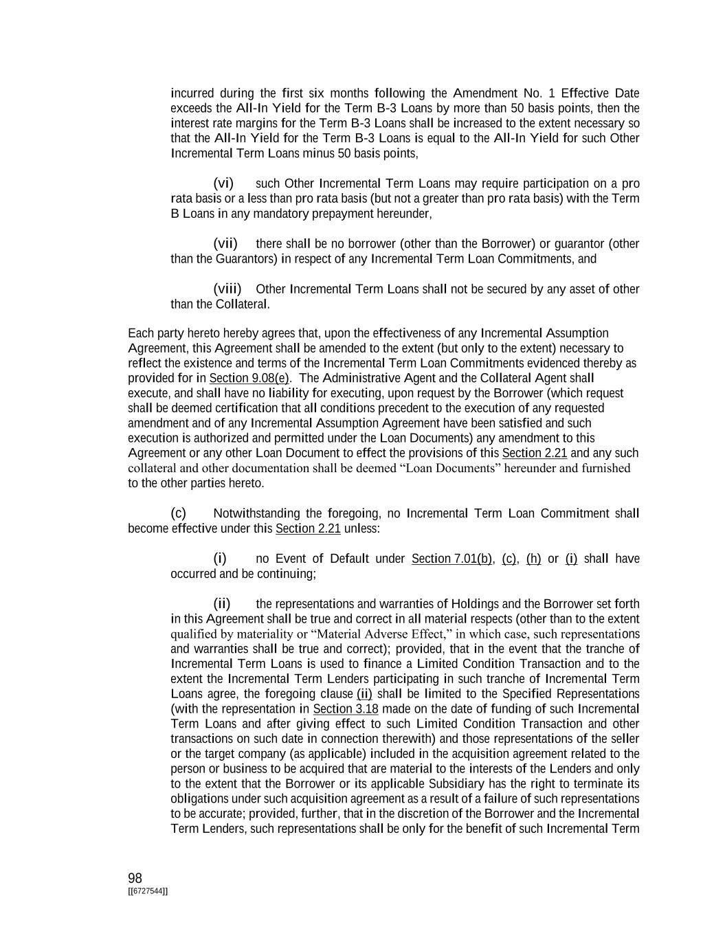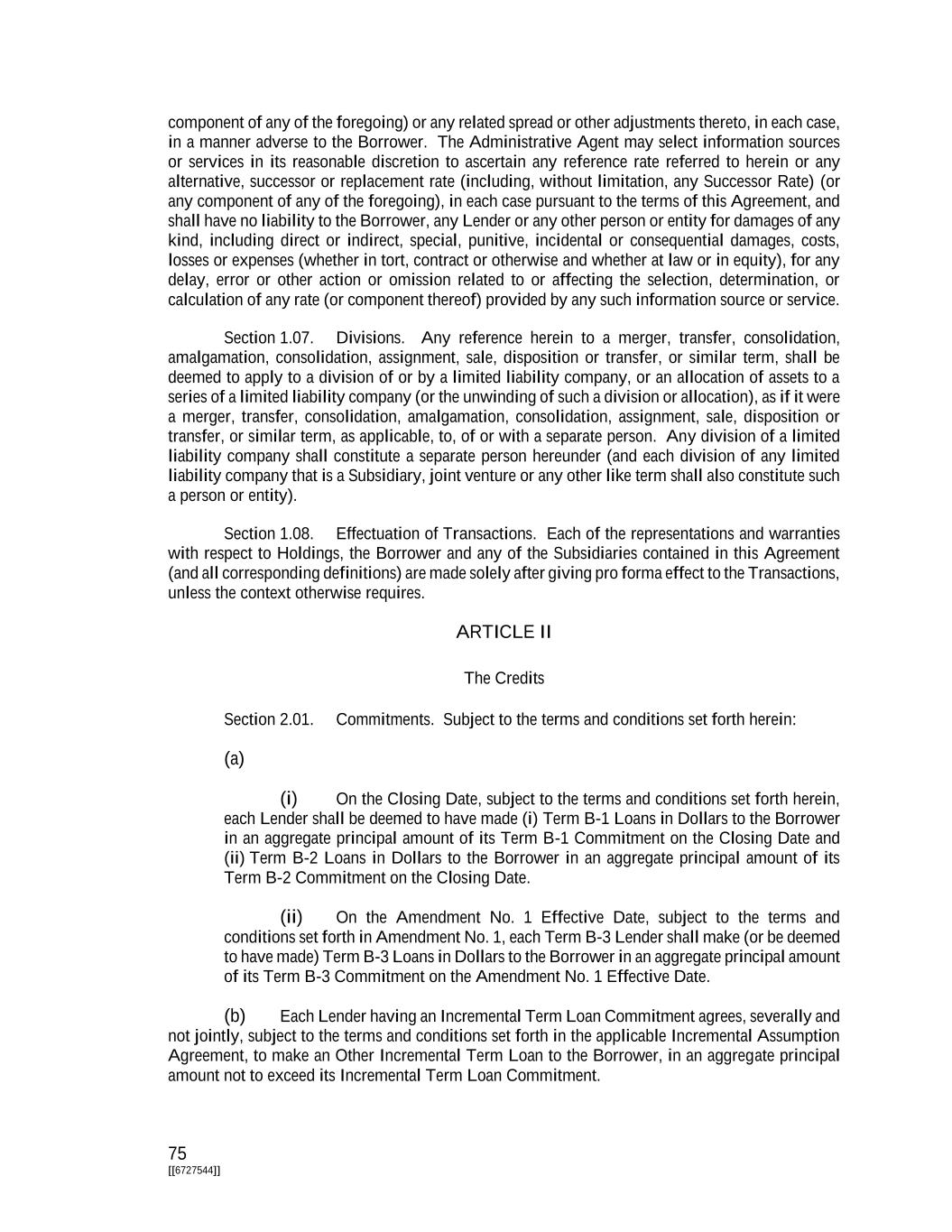 75 [[6727544]] component of any of the foregoing) or any related spread or other adjustments thereto, in each case, in a manner adverse to the Borrower. The Administrative Agent may select information sources or services in its reasonable discretion to ascertain any reference rate referred to herein or any alternative, successor or replacement rate (including, without limitation, any Successor Rate) (or any component of any of the foregoing), in each case pursuant to the terms of this Agreement, and shall have no liability to the Borrower, any Lender or any other person or entity for damages of any kind, including direct or indirect, special, punitive, incidental or consequential damages, costs, losses or expenses (whether in tort, contract or otherwise and whether at law or in equity), for any delay, error or other action or omission related to or affecting the selection, determination, or calculation of any rate (or component thereof) provided by any such information source or service. Section 1.07. Divisions. Any reference herein to a merger, transfer, consolidation, amalgamation, consolidation, assignment, sale, disposition or transfer, or similar term, shall be deemed to apply to a division of or by a limited liability company, or an allocation of assets to a series of a limited liability company (or the unwinding of such a division or allocation), as if it were a merger, transfer, consolidation, amalgamation, consolidation, assignment, sale, disposition or transfer, or similar term, as applicable, to, of or with a separate person. Any division of a limited liability company shall constitute a separate person hereunder (and each division of any limited liability company that is a Subsidiary, joint venture or any other like term shall also constitute such a person or entity). Section 1.08. Effectuation of Transactions. Each of the representations and warranties with respect to Holdings, the Borrower and any of the Subsidiaries contained in this Agreement (and all corresponding definitions) are made solely after giving pro forma effect to the Transactions, unless the context otherwise requires. ARTICLE II The Credits Section 2.01. Commitments. Subject to the terms and conditions set forth herein: (a) (i) On the Closing Date, subject to the terms and conditions set forth herein, each Lender shall be deemed to have made (i) Term B-1 Loans in Dollars to the Borrower in an aggregate principal amount of its Term B-1 Commitment on the Closing Date and (ii) Term B-2 Loans in Dollars to the Borrower in an aggregate principal amount of its Term B-2 Commitment on the Closing Date. (ii) On the Amendment No. 1 Effective Date, subject to the terms and conditions set forth in Amendment No. 1, each Term B-3 Lender shall make (or be deemed to have made) Term B-3 Loans in Dollars to the Borrower in an aggregate principal amount of its Term B-3 Commitment on the Amendment No. 1 Effective Date. (b) Each Lender having an Incremental Term Loan Commitment agrees, severally and not jointly, subject to the terms and conditions set forth in the applicable Incremental Assumption Agreement, to make an Other Incremental Term Loan to the Borrower, in an aggregate principal amount not to exceed its Incremental Term Loan Commitment.